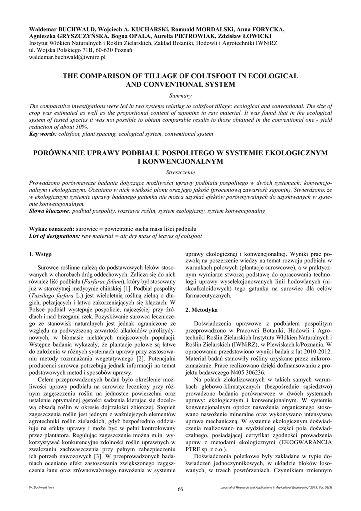 Waldemar BUCHWALD, Wojciech A. KUCHARSKi, Romuald MORDALSKi, Anna FORYCKA, Agnieszka GRYSZCZYŃSKA, Bogna OPALA, Aurelia PIETROWIAK, Zdzisław ŁOWICKI Instytut Włókien Naturalnych i Roślin Zielarskich, Zakład Botaniki, Hodowli i Agrotechniki IWNiRZ ul. Wojska Polskiego 71B, 60-630 Poznań [email protected] THE COMPARISON OF TILLAGE OF COLTSFOOT IN ECOLOGICAL AND CONVENTIONAL SYSTEM Summary The comparative investigations were led in two systems relating to coltsfoot tillage: ecological and conventional. The size of crop was estimated as well as the proportional content of saponins in raw material. It was found that in the ecological system of tested species it was not possible to obtain comparable results to those obtained in the conventional one - yield reduction of about 50%. Key words: coltsfoot, plant spacing, ecological system, conventional system PORÓWNANIE UPRAWY PODBIAŁU POSPOLITEGO W SYSTEMIE EKOLOGICZNYM I KONWENCJONALNYM Streszczenie Prowadzono porównawcze badania dotyczące możliwości uprawy podbiału pospolitego w dwóch systemach: konwencjonalnym i ekologicznym. Oceniano w nich wielkość plonu oraz jego jakość (procentową zawartość saponin). Stwierdzono, że w ekologicznym systemie uprawy badanego gatunku nie można uzyskać efektów porównywalnych do uzyskiwanych w systemie konwencjonalnym. Słowa kluczowe: podbiał pospolity, rozstawa roślin, system ekologiczny, system konwencjonalny Wykaz oznaczeń: surowiec = powietrznie sucha masa liści podbiału List of designations: raw material = air dry mass of leaves of coltsfoot uprawy ekologicznej i konwencjonalnej. Wyniki prac pozwolą na poszerzenie wiedzy na temat rozwoju podbiału w warunkach polowych (plantacje surowcowe), a w praktycznym wymiarze stworzą podstawę do opracowania technologii uprawy wyselekcjonowanych linii hodowlanych (niskoalkaloidowych) tego gatunku na surowiec dla celów farmaceutycznych. 1. Wstęp Surowce roślinne należą do podstawowych leków stosowanych w chorobach dróg oddechowych. Zalicza się do nich również liść podbiału (Farfarae folium), który był stosowany już w starożytnej medycynie chińskiej [1]. Podbiał pospolity (Tussilago farfara L.) jest wieloletnią rośliną zielną o długich, pełzających i łatwo zakorzeniających się kłączach. W Polsce podbiał występuje pospolicie, najczęściej przy źródłach i nad brzegami rzek. Pozyskiwanie surowca leczniczego ze stanowisk naturalnych jest jednak ograniczone ze względu na podwyższoną zawartość alkaloidów pirolizydynowych, w biomasie niektórych miejscowych populacji. Wstępne badania wykazały, że plantacje polowe są łatwe do założenia w różnych systemach uprawy przy zastosowaniu metody rozmnażania wegetatywnego [2]. Potencjalni producenci surowca potrzebują jednak informacji na temat podstawowych metod i sposobów uprawy. Celem przeprowadzonych badań było określenie możliwości uprawy podbiału na surowiec leczniczy przy różnym zagęszczeniu roślin na jednostce powierzchni oraz ustalenie optymalnej gęstości sadzenia kierując się docelową obsadą roślin w okresie dojrzałości zbiorczej. Stopień zagęszczenia roślin jest jednym z ważniejszych elementów agrotechniki roślin zielarskich, gdyż bezpośrednio oddziałuje na efekty uprawy i może być w pełni kontrolowany przez plantatora. Regulując zagęszczenie można m.in. wykorzystywać konkurencyjne zdolności roślin uprawnych w zwalczaniu zachwaszczenia przy pełnym zabezpieczeniu ich potrzeb nawozowych [3]. W przeprowadzonych badaniach oceniano efekt zastosowania zwiększonego zagęszczenia łanu oraz zrównoważonego nawożenia w systemie W. Buchwald i inni 2. Metodyka Doświadczenia uprawowe z podbiałem pospolitym przeprowadzono w Pracowni Botaniki, Hodowli i Agrotechniki Roślin Zielarskich Instytutu Włókien Naturalnych i Roślin Zielarskich (IWNiRZ), w Plewiskach k/Poznania. W opracowaniu przedstawiono wyniki badań z lat 2010-2012. Materiał badań stanowiły rośliny uzyskane przez mikrorozmnażanie. Prace realizowano dzięki dofinansowaniu z projektu badawczego N405 306236. Na polach zlokalizowanych w takich samych warunkach glebowo-klimatycznych (bezpośrednie sąsiedztwo) prowadzono badania porównawcze w dwóch systemach uprawy: ekologicznym i konwencjonalnym. W systemie konwencjonalnym oprócz nawożenia organicznego stosowano nawożenie mineralne oraz wykonywano intensywną uprawę mechaniczną. W systemie ekologicznym doświadczenia realizowano na wydzielonej części pola doświadczalnego, posiadającej certyfikat zgodności prowadzenia upraw z metodami ekologicznymi (EKOGWARANCJA PTRE sp. z o.o.). Doświadczenia poletkowe były zakładane w typie doświadczeń jednoczynnikowych, w układzie bloków losowanych, w trzech powtórzeniach. Czynnikiem zmiennym 66 „Journal of Research and Applications in Agricultural Engineering” 2013, Vol. 58(3) serwowano intensywne rozrastanie i odnawianie się kłączy podbiału oraz szybki rozwój nadziemnych organów wegetatywnych. W uprawie ekologicznej analiza dla średnich z powtórzeń wykazała niewielkie różnice pomiędzy plonami surowca z poszczególnych kombinacji niezależnie od roku badań i terminu zbioru (tab. 1, 2). Tylko w I terminie zbioru, dla średniej z lat, uzyskano istotnie wyższe plony przy rozstawie 45 x 20 cm niż przy rozstawach: 45 x 30 i 45 x 40 cm. Podbiał rosnący w zagęszczeniu 11 roślin/m2 (rozstawa 45 x 20) plonował na poziomie 7,17 q·ha-1 (surowca) w porównaniu z plonami odpowiednio: 5,30 q·ha-1 uzyskanymi z 7 roślin/m2 (rozstawa 45 x 30 cm) oraz 4,75 q·ha-1 uzyskanymi z 5 roślin/m2 (rozstawa 45 x 40 cm). W II terminie zbioru plon nie różnił się istotnie w zależności od gęstości sadzenia i wyniósł średnio od 4,12 do 4,99 q·ha-1. W uprawie konwencjonalnej analiza wykazała istotne różnice pomiędzy plonami surowca z poszczególnych kombinacji, niezależnie od roku badań i terminu zbioru, za wyjątkiem drugie