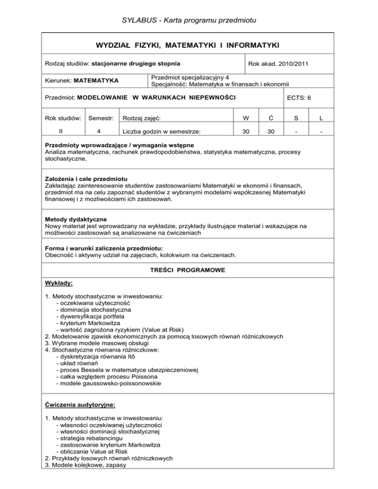 SYLABUS - Karta programu przedmiotu WYDZIAŁ FIZYKI, MATEMATYKI I INFORMATYKI Rodzaj studiów: stacjonarne drugiego stopnia Kierunek: MATEMATYKA Rok akad. 2010/2011 Przedmiot specjalizacyjny 4 Specjalność: Matematyka w finansach i ekonomii Przedmiot: MODELOWANIE W WARUNKACH NIEPEWNOŚCI Rok studiów: II Semestr: 4 ECTS: 6 Rodzaj zajęć: W Ć S L Liczba godzin w semestrze: 30 30 - - Przedmioty wprowadzające / wymagania wstępne Analiza matematyczna, rachunek prawdopodobieństwa, statystyka matematyczna, procesy stochastyczne, Założenia i cele przedmiotu Zakładając zainteresowanie studentów zastosowaniami Matematyki w ekonomii i finansach, przedmiot ma na celu zapoznać studentów z wybranymi modelami współczesnej Matematyki finansowej i z mozliwościami ich zastosowań. Metody dydaktyczne Nowy materiał jest wprowadzany na wykładzie, przykłady ilustrujące materiał i wskazujące na możliwości zastosowań są analizowane na ćwiczeniach Forma i warunki zaliczenia przedmiotu: Obecność i aktywny udział na zajęciach, kolokwium na ćwiczeniach. TREŚCI PROGRAMOWE Wykłady: 1. Metody stochastyczne w inwestowaniu: - oczekiwana użyteczność - dominacja stochastyczna - dywersyfikacja portfela - kryterium Markowitza - wartość zagrożona ryzykiem (Value at Risk) 2. Modelowanie zjawisk ekonomicznych za pomocą losowych równań różniczkowych 3. Wybrane modele masowej obsługi 4. Stochastyczne równania różniczkowe: - dyskretyzacja równania Itô - układ równań - proces Bessela w matematyce ubezpieczeniowej - całka względem procesu Poissona - modele gaussowsko-poissonowskie Ćwiczenia audytoryjne: 1. Metody stochastyczne w inwestowaniu: - własności oczekiwanej użyteczności - własności dominacji stochastycznej - strategia rebalancingu - zastosowanie kryterium Markowitza - obliczanie Value at Risk 2. Przykłady losowych równań różniczkowych 3. Modele kolejkowe, zapasy 4. Stochastyczne równania różniczkowe: - model Blacka-Scholesa - model obwodu elektrycznego - proces ryzyka, strategia barierowa - własności całki względem procesu Poissona - równanie logistyczne – model Verhulsta - gaussowsko-poissonowski model Volterry-Lotki Laboratorium: Wykaz literatury podstawowej: [1] .A. Janicki, A. Izydorczyk, Komputerowe metody w modelowaniu stochastycznym. WNT, Warszawa 2001 [2] D. Bobrowski, Wstęp do losowych równań różniczkowych zwyczajnych, PWN, Warszawa 1987. [3] P. Jaworski, J. Micał, Modelowanie matematyczne w finansach i ubezpieczeniach, POLTEX, Warszawa 2005 Wykaz literatury uzupełniającej: [1] A. Pieniążek, J. Weiss, A. Winiarz, Procesy stochastyczne w przykładach i zadaniach, wyd. PK, Kraków 2000 [2] M. Wiciak, Wybrane zagadnienia teorii opcji, Wydawnictwo PK, 2007. Osoba(y) odpowiedzialna(e) za przedmiot: dr Anna MILIAN Zatwierdził: dr hab. Teresa WINIARSKA, prof. PK