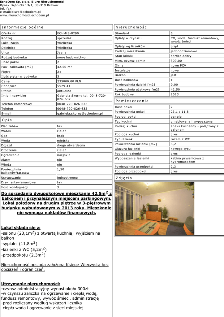 EchoDom Sp. z o.o. Biuro Nieruchomości Rynek Dębnicki 13/1, 30-319 Kraków tel. fax. e-mail:[email protected] www.nieruchomosci.echodom.pl Informacje ogólne Nieruchomość Oferta nr ECH-MS-8290 Standard 5 Rodzaj sprzedaż Opłaty w czynszu Lokalizacja Wieliczka CO, woda, fundusz remontowy, wywóz śmieci Dzielnica Wieliczka Opłaty wg liczników prąd Jasna Rodzaj mieszkania jednopoziomowe Rodzaj budynku nowe budownictwo Stan lokalu bardzo dobry Ilość pokoi 2 Mies. czynsz admin. 300,00 42.50 m² Okna nowe PCV 2p Instalacje nowa 3 Balkon jest 235000.00 PLN Ilość balkonów 1 Cena/m2 5529.41 Powierzchnia działki [m2] 0.00 Status aktualna Powierzchnia użytkowa [m2] 42,50 Imię i nazwisko Gabriela Skorny tel. 0048-720826-632 Rok budowy 2013 Telefon komórkowy 0048-720-826-632 Telefon 0048-720-826-632 Ulica Pow. całkowita [m2] Piętro Ilość pięter w budynku Cena E-mail [email protected] Opis Pomieszczenia Ilość pokoi 2 Powierzchnia pokoi 23,1 ; 11,8 Podłogi pokoi panele Typ kuchni umeblowana i wyposażona Rodzaj kuchni aneks kuchenny - połączony z salonem Plac zabaw tak Widok zieleń Gaz brak Podłoga kuchni gres Woda miejska Typ łazienki razem z WC droga utwardzona Powierzchnia łazienki [m2] 5,2 zieleń Glazura łazienki nowego typu miejskie Podłoga łazienki gres Alarm nie Wyposażenie łazienki kabina prysznicowa z hydromasażem Winda nie Powierzchnia przedpokoi 2,3 Powierzchnia balkonów/tarasów 1,50 Podłoga przedpokoi gres Usytuowanie jednostronne Drzwi antywłamaniowe tak Ilość kondygnacji 3 Dojazd Otoczenie Ogrzewanie Do sprzedania dwupokojowe mieszkanie 42,5m2 z balkonem i przynależnym miejscem parkingowym. Lokal położony na drugim piętrze w 3-piętrowym budynku wybudowanym w 2013 roku. Mieszkanie nie wymaga nakładów finansowych. Lokal składa się z: -salonu (23,1m2) z otwartą kuchnią i wyjściem na balkon -sypialni (11,8m2) -łazienki z WC (5,2m2) -przedpokoju (2,3m2) Nieruchomość posiada założoną Księgę Wieczystą bez obciążeń i ograniczeń. Utrzymanie nieruchomości: -czynsz administracyjny wynosi około 300zł -w czynszu zaliczka na ogrzewanie i ciepłą wodę, fundusz remontowy, wywóz śmieci, administrację -prąd rozliczany według wskazań licznika -ciepła woda i ogrzewanie z sieci miejskiej Zdjęcia Stan mieszkania: -mieszkanie wykończone w wysokim standardzie -w kuchni zabudowa na wymiar, wyposażenie AGD, na podłodze i częściowo na ścianach płytki -w łazience kabina prysznicowa, WC i umywalka, na podłodze i ścianach płytki -w pokojach na podłodze panele, na ścianach gładzie, w sypialni duża szafa -budynek i klatka schodowa w stanie idealnym Lokalizacja i infrastruktura: -lokal znajduje się przy ul. Jasnej, niedaleko centrum Wieliczki -w sąsiedztwie znajduje się dużo zieleni, plac zabaw dla dzieci Cena: 235000zł wraz z przynależnym miejscem parkingowym. Zapraszam na oględziny. Więcej ofert na EchoDom.pl! BIURO NIERUCHOMOŚCI EchoDom Sp. z o.o.- szeroki wybór ofert. Kompleksowa obsługa przy sprzedaży, wynajmie nieruchomości. Atrakcyjne propozycje kredytowe, sporządzane wedle potrzeb Klientów. ZAPEWNIAMY PROFESJONALIZM I BEZPIECZEŃSTWO ZAWIERANYCH TRANSAKCJI! © Wszelkie prawa zastrzeżone - EchoDom