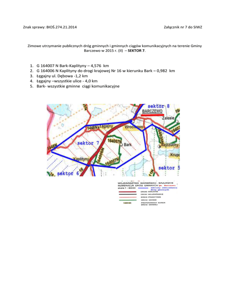 Znak sprawy: BIOŚ.274.21.2014 Załącznik nr 7 do SIWZ Zimowe utrzymanie publicznych dróg gminnych i gminnych ciągów komunikacyjnych na terenie Gminy Barczewo w 2015 r. (II) – SEKTOR 7. 1. 2. 3. 4. 5. G 164007 N Bark-Kaplityny – 4,576 km G 164006 N Kaplityny do drogi krajowej Nr 16 w kierunku Bark – 0,982 km Łęgajny ul. Dębowa -1,2 km Łęgajny –wszystkie ulice - 4,0 km Bark- wszystkie gminne ciągi komunikacyjne