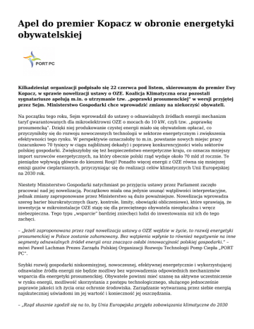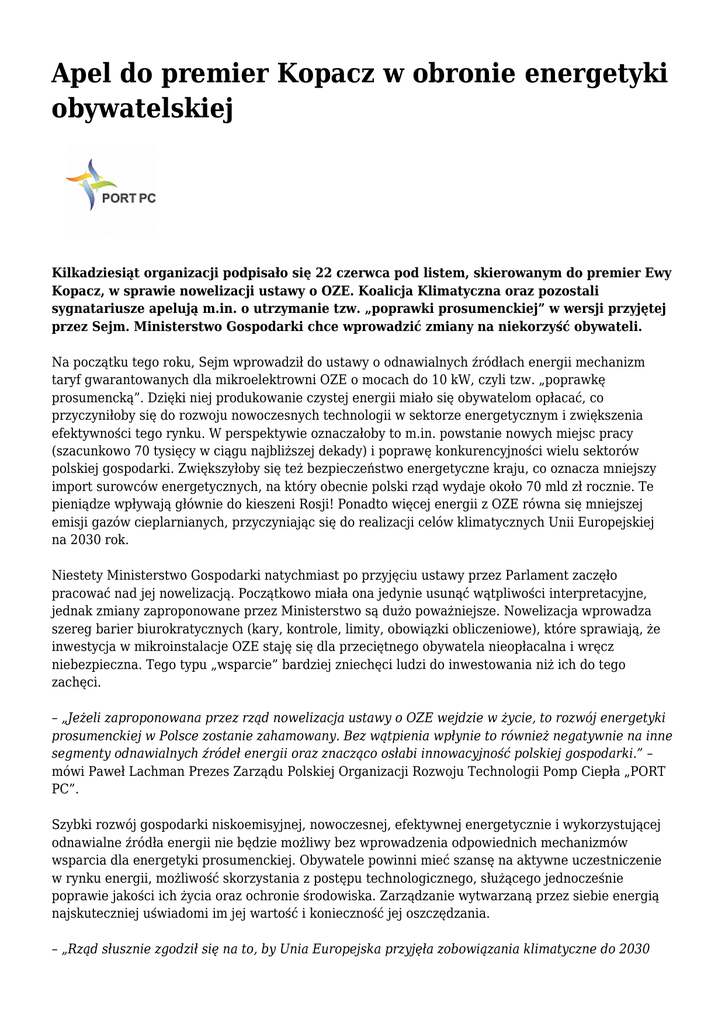 Apel do premier Kopacz w obronie energetyki obywatelskiej Kilkadziesiąt organizacji podpisało się 22 czerwca pod listem, skierowanym do premier Ewy Kopacz, w sprawie nowelizacji ustawy o OZE. Koalicja Klimatyczna oraz pozostali sygnatariusze apelują m.in. o utrzymanie tzw. „poprawki prosumenckiej” w wersji przyjętej przez Sejm. Ministerstwo Gospodarki chce wprowadzić zmiany na niekorzyść obywateli. Na początku tego roku, Sejm wprowadził do ustawy o odnawialnych źródłach energii mechanizm taryf gwarantowanych dla mikroelektrowni OZE o mocach do 10 kW, czyli tzw. „poprawkę prosumencką”. Dzięki niej produkowanie czystej energii miało się obywatelom opłacać, co przyczyniłoby się do rozwoju nowoczesnych technologii w sektorze energetycznym i zwiększenia efektywności tego rynku. W perspektywie oznaczałoby to m.in. powstanie nowych miejsc pracy (szacunkowo 70 tysięcy w ciągu najbliższej dekady) i poprawę konkurencyjności wielu sektorów polskiej gospodarki. Zwiększyłoby się też bezpieczeństwo energetyczne kraju, co oznacza mniejszy import surowców energetycznych, na który obecnie polski rząd wydaje około 70 mld zł rocznie. Te pieniądze wpływają głównie do kieszeni Rosji! Ponadto więcej energii z OZE równa się mniejszej emisji gazów cieplarnianych, przyczyniając się do realizacji celów klimatycznych Unii Europejskiej na 2030 rok. Niestety Ministerstwo Gospodarki natychmiast po przyjęciu ustawy przez Parlament zaczęło pracować nad jej nowelizacją. Początkowo miała ona jedynie usunąć wątpliwości interpretacyjne, jednak zmiany zaproponowane przez Ministerstwo są dużo poważniejsze. Nowelizacja wprowadza szereg barier biurokratycznych (kary, kontrole, limity, obowiązki obliczeniowe), które sprawiają, że inwestycja w mikroinstalacje OZE staję się dla przeciętnego obywatela nieopłacalna i wręcz niebezpieczna. Tego typu „wsparcie” bardziej zniechęci ludzi do inwestowania niż ich do tego zachęci. – „Jeżeli zaproponowana przez rząd nowelizacja ustawy o OZE wejdzie w życie, to rozwój energetyki prosumenckiej w Polsce zostanie zahamowany. Bez wątpienia wpłynie to również negatywnie na inne segmenty odnawialnych źródeł energii oraz znacząco osłabi innowacyjność polskiej gospodarki.” – mówi Paweł Lachman Prezes Zarządu Polskiej Organizacji Rozwoju Technologii Pomp Ciepła „PORT PC”. Szybki rozwój gospodarki niskoemisyjnej, nowoczesnej, efektywnej energetycznie i wykorzystującej odnawialne źródła energii nie będzie możliwy bez wprowadzenia odpowiednich mechanizmów wsparcia dla energetyki prosumenckiej. Obywatele powinni mieć szansę na aktywne uczestniczenie w rynku energii, możliwość skorzystania z postępu technologicznego, służącego jednocześnie poprawie jakości ich życia oraz ochronie środowiska. Zarządzanie wytwarzaną przez siebie energią najskuteczniej uświadomi im jej wartość i konieczność jej oszczędzania. – „Rząd słusznie zgodził się na to, by Unia Europejska przyjęła zobowiązania klimatyczne do 2030 roku. Teraz przyszedł czas, by potraktować te zobowiązania na poważnie. Nie zrealizujemy celu redukcji emisji i nie przejdziemy na gospodarkę niskoemisyjną bez rozwoju rozproszonej energetyki, bazującej na odnawialnych źródłach. Z kolei bez silnego systemu wsparcia, opartego na racjonalnych ekonomicznie taryfach gwarantowanych, nie będzie rozwoju rozproszonej energetyki.” – mówi Tobiasz Adamczewski, ekspert ds. klimatu i energii Fundacji WWF Polska, członek Koalicji Klimatycznej. Sygnatariusze, w tym Koalicja Klimatyczna, apelują o transparentny proces legislacyjny, zaznaczając, że rząd nie może zignorować wyników konsultacji społecznych. Nowelizacja powinna zostać poparta rzetelnymi, publicznie dostępnymi analizami i uczciwą debatą na temat planów rozwoju energetyki w Polsce. Konieczne jest również powołanie Rządowej Rady ds. Energetyki Obywatelskiej, która będzie „bezstronnie monitorowała system wsparcia energetyki odnawialnej, wspomagała rozwój energetyki rozproszonej i inicjowała działania na rzecz najmniejszych producentów energii z OZE – prosumentów, a także uczestniczyła w procesie transformacji polskiej energetyki”. (fragm. listu do Pani Premier z dnia 22.06.2015 roku). Wśród sygnatariuszy znajdują się organizacje gospodarcze reprezentujące producentów i usługodawców sektora efektywnej, odnawialnej i rozproszonej energetyki oraz organizacje ekologiczne. Są to między innymi Krajowa Izba Gospodarcza Elektroniki i Telekomunikacji, Instytut Energetyki Odnawialnej, Polska Organizacja Rozwoju Technologii Pomp Ciepła, Polska Korporacja Techniki SGGiK, Polskie Towarzystwo Fotowoltaiki i Koalicja Klimatyczna. (źródło: Koalicja Klimatyczna, Krajowa Izba Gospodarcza Elektroniki i Telekomunikacji, Instytut Energetyki Odnawialnej, Polska Organizacja Rozwoju Technologii Pomp Ciepła, Polska Korporacja Techniki SGGiK, Polskie Towarzystwo Fotowoltaiki i Koalicja Klimatyczna.) KONTAKT Polska Organizacja Rozwoju Technologii Pomp Ciepła PORT PC Tel: +48 12 151 67 73 Adres: Przybyszewskiego 29/5 30-614 Kraków
