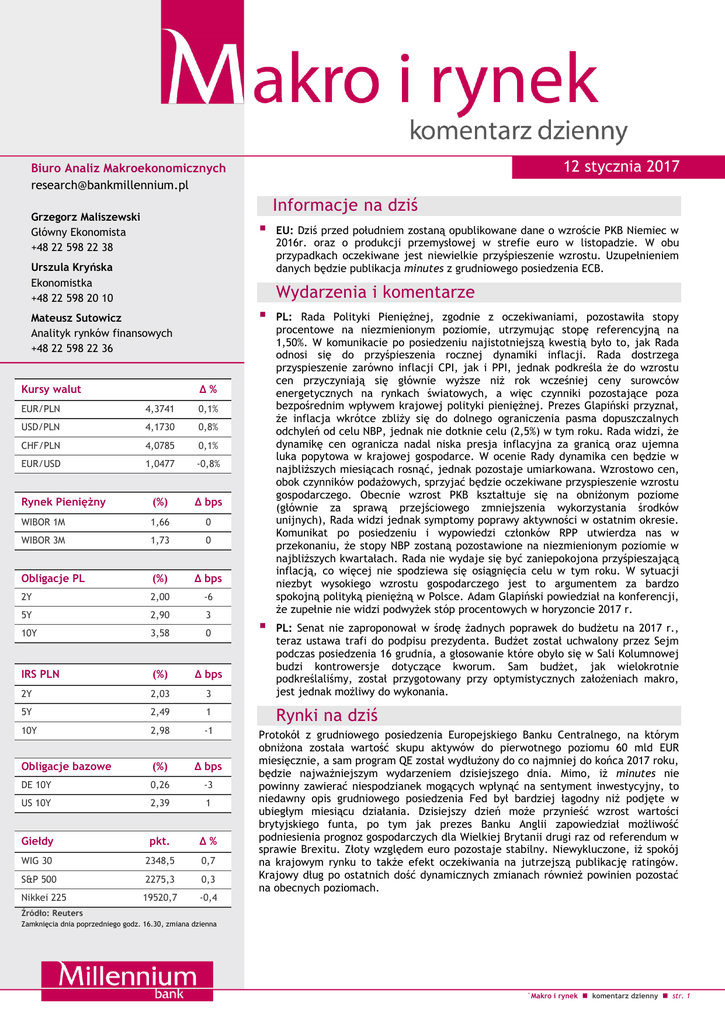 12 stycznia 2017 Biuro Analiz Makroekonomicznych [email protected] Informacje na dziś Grzegorz Maliszewski Główny Ekonomista +48 22 598 22 38 Urszula Kryńska Ekonomistka +48 22 598 20 10 EU: Dziś przed południem zostaną opublikowane dane o wzroście PKB Niemiec w 2016r. oraz o produkcji przemysłowej w strefie euro w listopadzie. W obu przypadkach oczekiwane jest niewielkie przyśpieszenie wzrostu. Uzupełnieniem danych będzie publikacja minutes z grudniowego posiedzenia ECB. Wydarzenia i komentarze Mateusz Sutowicz Analityk rynków finansowych +48 22 598 22 36 Kursy walut PL: Rada Polityki Pieniężnej, zgodnie z oczekiwaniami, pozostawiła stopy procentowe na niezmienionym poziomie, utrzymując stopę referencyjną na 1,50%. W komunikacie po posiedzeniu najistotniejszą kwestią było to, jak Rada odnosi się do przyśpieszenia rocznej dynamiki inflacji. Rada dostrzega przyspieszenie zarówno inflacji CPI, jak i PPI, jednak podkreśla że do wzrostu cen przyczyniają się głównie wyższe niż rok wcześniej ceny surowców energetycznych na rynkach światowych, a więc czynniki pozostające poza bezpośrednim wpływem krajowej polityki pieniężnej. Prezes Glapiński przyznał, że inflacja wkrótce zbliży się do dolnego ograniczenia pasma dopuszczalnych odchyleń od celu NBP, jednak nie dotknie celu (2,5%) w tym roku. Rada widzi, że dynamikę cen ogranicza nadal niska presja inflacyjna za granicą oraz ujemna luka popytowa w krajowej gospodarce. W ocenie Rady dynamika cen będzie w najbliższych miesiącach rosnąć, jednak pozostaje umiarkowana. Wzrostowo cen, obok czynników podażowych, sprzyjać będzie oczekiwane przyspieszenie wzrostu gospodarczego. Obecnie wzrost PKB kształtuje się na obniżonym poziome (głównie za sprawą przejściowego zmniejszenia wykorzystania środków unijnych), Rada widzi jednak symptomy poprawy aktywności w ostatnim okresie. Komunikat po posiedzeniu i wypowiedzi członków RPP utwierdza nas w przekonaniu, że stopy NBP zostaną pozostawione na niezmienionym poziomie w najbliższych kwartałach. Rada nie wydaje się być zaniepokojona przyśpieszającą inflacją, co więcej nie spodziewa się osiągnięcia celu w tym roku. W sytuacji niezbyt wysokiego wzrostu gospodarczego jest to argumentem za bardzo spokojną polityką pieniężną w Polsce. Adam Glapiński powiedział na konferencji, że zupełnie nie widzi podwyżek stóp procentowych w horyzoncie 2017 r. PL: Senat nie zaproponował w środę żadnych poprawek do budżetu na 2017 r., teraz ustawa trafi do podpisu prezydenta. Budżet został uchwalony przez Sejm podczas posiedzenia 16 grudnia, a głosowanie które obyło się w Sali Kolumnowej budzi kontrowersje dotyczące kworum. Sam budżet, jak wielokrotnie podkreślaliśmy, został przygotowany przy optymistycznych założeniach makro, jest jednak możliwy do wykonania. Δ% EUR/PLN 4,3741 0,1% USD/PLN 4,1730 0,8% CHF/PLN 4,0785 0,1% EUR/USD 1,0477 -0,8% Rynek Pieniężny (%) Δ bps WIBOR 1M 1,66 0 WIBOR 3M 1,73 0 Obligacje PL (%) Δ bps 2Y 2,00 -6 5Y 2,90 3 10Y 3,58 0 IRS PLN (%) Δ bps 2Y 2,03 3 5Y 2,49 1 10Y 2,98 -1 Obligacje bazowe (%) Δ bps DE 10Y 0,26 -3 US 10Y 2,39 1 Giełdy pkt. Δ% WIG 30 2348,5 0,7 S&P 500 2275,3 0,3 Nikkei 225 19520,7 -0,4 Rynki na dziś Protokół z grudniowego posiedzenia Europejskiego Banku Centralnego, na którym obniżona została wartość skupu aktywów do pierwotnego poziomu 60 mld EUR miesięcznie, a sam program QE został wydłużony do co najmniej do końca 2017 roku, będzie najważniejszym wydarzeniem dzisiejszego dnia. Mimo, iż minutes nie powinny zawierać niespodzianek mogących wpłynąć na sentyment inwestycyjny, to niedawny opis grudniowego posiedzenia Fed był bardziej łagodny niż podjęte w ubiegłym miesiącu działania. Dzisiejszy dzień może przynieść wzrost wartości brytyjskiego funta, po tym jak prezes Banku Anglii zapowiedział możliwość podniesienia prognoz gospodarczych dla Wielkiej Brytanii drugi raz od referendum w sprawie Brexitu. Złoty względem euro pozostaje stabilny. Niewykluczone, iż spokój na krajowym rynku to także efekt oczekiwania na jutrzejszą publikację ratingów. Krajowy dług po ostatnich dość dynamicznych zmianach również powinien pozostać na obecnych poziomach. Źródło: Reuters Zamknięcia dnia poprzedniego godz. 16.30, zmiana dzienna `Makro i rynek komentarz dzienny str. 1 Rynek krajowy Kursy walutowe EUR/PLN i EUR/USD 4,50 1,13 4,45 1,11 4,40 1,09 4,35 1,07 4,30 1,05 4,25 1,03 EURPLN EURUSD /prawa skala/ Źródło: Reuters Rynki zagraniczne Rentowności polskich obligacji [%] Konferencja prasowa D.Trumpa zgodnie z przewidywaniami była najważniejszym wydarzeniem wczorajszego dnia. W oczekiwaniu na wystąpienie dolar zyskiwał na wartości, a kurs EUR/USD zniżkował przejściowo do poziomu 1,0452. Rozczarowaniem, po którym eurodolar wzrósł o niemal dwa centy w stosunku do dziennego minimum, okazały się jednak tematy, które komentował wczoraj prezydent elekt. Większość przemówienia koncentrowało się bowiem na oskarżeniach amerykańskich mediów i zaprzeczeniom jakoby rosyjskie służby wywiadowcze miały być w posiadaniu kompromitujących D.Trumpa materiałów. Tematy gospodarcze, na które liczyła większość inwestorów, były drugoplanowe. Nie poznaliśmy zatem żadnych szczegółów działań zapowiedzianych 9 listopada tj. obniżek podatków, czy zwiększenia wydatków infrastrukturalnych. Spadkiem dochodowości zareagowały amerykańskie obligacje, a 10-latka USA obniżyła się o 7 bps do 2,32%. Spadek dochodowości towarzyszył również niemieckim obligacjom. Ten jednak zaczął się jeszcze przed wystąpieniem prezydenta elekta. 3,8 3,4 3,0 2,6 2,2 1,8 1,4 Spread PL 10Y vs. DE 10Y 2Y 5Y Niewielka zmienność obserwowana była w trakcie wczorajszej sesji w notowaniach pary EUR/PLN. Wahania kursu jedynie nieznacznie przekroczyły grosz. Zdecydowanie ciekawszy przebieg miały notowania pary USD/PLN, która 