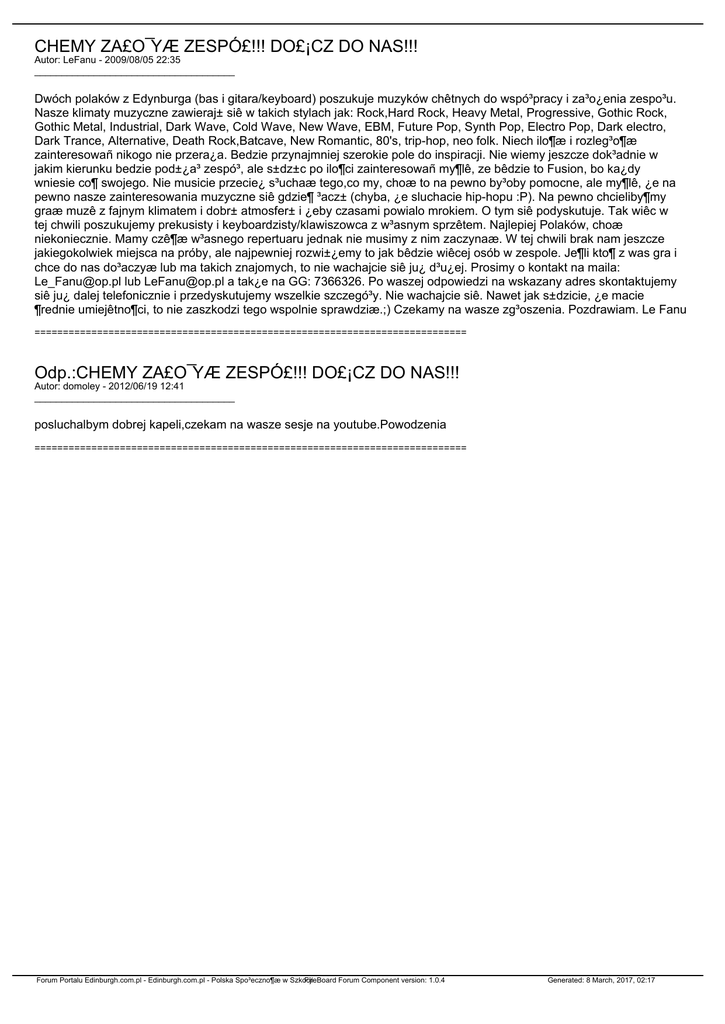 CHEMY ZA£O¯YÆ ZESPÓ£!!! DO£¡CZ DO NAS!!! Autor: LeFanu - 2009/08/05 22:35 _____________________________________ Dwóch polaków z Edynburga (bas i gitara/keyboard) poszukuje muzyków chêtnych do wspó³pracy i za³o¿enia zespo³u. Nasze klimaty muzyczne zawieraj± siê w takich stylach jak: Rock,Hard Rock, Heavy Metal, Progressive, Gothic Rock, Gothic Metal, Industrial, Dark Wave, Cold Wave, New Wave, EBM, Future Pop, Synth Pop, Electro Pop, Dark electro, Dark Trance, Alternative, Death Rock,Batcave, New Romantic, 80's, trip-hop, neo folk. Niech ilo¶æ i rozleg³o¶æ zainteresowañ nikogo nie przera¿a. Bedzie przynajmniej szerokie pole do inspiracji. Nie wiemy jeszcze dok³adnie w jakim kierunku bedzie pod±¿a³ zespó³, ale s±dz±c po ilo¶ci zainteresowañ my¶lê, ze bêdzie to Fusion, bo ka¿dy wniesie co¶ swojego. Nie musicie przecie¿ s³uchaæ tego,co my, choæ to na pewno by³oby pomocne, ale my¶lê, ¿e na pewno nasze zainteresowania muzyczne siê gdzie¶ ³acz± (chyba, ¿e sluchacie hip-hopu :P). Na pewno chcieliby¶my graæ muzê z fajnym klimatem i dobr± atmosfer± i ¿eby czasami powialo mrokiem. O tym siê podyskutuje. Tak wiêc w tej chwili poszukujemy prekusisty i keyboardzisty/klawiszowca z w³asnym sprzêtem. Najlepiej Polaków, choæ niekoniecznie. Mamy czê¶æ w³asnego repertuaru jednak nie musimy z nim zaczynaæ. W tej chwili brak nam jeszcze jakiegokolwiek miejsca na próby, ale najpewniej rozwi±¿emy to jak bêdzie wiêcej osób w zespole. Je¶li kto¶ z was gra i chce do nas do³aczyæ lub ma takich znajomych, to nie wachajcie siê ju¿ d³u¿ej. Prosimy o kontakt na maila: [email protected] lub [email protected] a tak¿e na GG: 7366326. Po waszej odpowiedzi na wskazany adres skontaktujemy siê ju¿ dalej telefonicznie i przedyskutujemy wszelkie szczegó³y. Nie wachajcie siê. Nawet jak s±dzicie, ¿e macie ¶rednie umiejêtno¶ci, to nie zaszkodzi tego wspolnie sprawdziæ.;) Czekamy na wasze zg³oszenia. Pozdrawiam. Le Fanu ============================================================================ Odp.:CHEMY ZA£O¯YÆ ZESPÓ£!!! DO£¡CZ DO NAS!!! Autor: domoley - 2012/06/19 12:41 _____________________________________ posluchalbym dobrej kapeli,czekam na wasze sesje na youtube.Powodzenia ============================================================================ Forum Portalu Edinburgh.com.pl - Edinburgh.com.pl - Polska Spo³eczno¶æ w Szkocji FireBoard Forum Component version: 1.0.4 Generated: 8 March, 2017, 02:17
