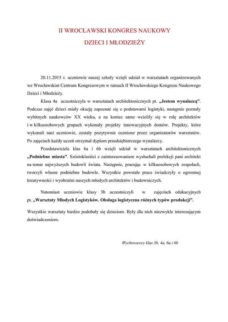 II WROCŁAWSKI KONGRES NAUKOWY DZIECI I MŁODZIEŻY 20.11.2015 r. uczniowie naszej szkoły wzięli udział w warsztatach organizowanych we Wrocławskim Centrum Kongresowym w ramach II Wrocławskiego Kongresu Naukowego Dzieci i Młodzieży. Klasa 4a uczestniczyła w warsztatach architektonicznych pt. „Jestem wynalazcą”. Podczas zajęć dzieci miały okazję zapoznać się z podstawami logistyki, następnie poznały wybitnych naukowców XX wieku, a na koniec same wcieliły się w rolę architektów i w kilkuosobowych grupach wykonały projekty innowacyjnych domów. Projekty, które wykonali nasi uczniowie, zostały pozytywnie ocenione przez organizatorów warsztatów. Po zajęciach każdy uczeń otrzymał dyplom przedsiębiorczego wynalazcy. Przedstawiciele klas 6a i 6b wzięli udział w warsztatach architektonicznych „Podniebne miasta”. Szóstoklasiści z zainteresowaniem wysłuchali prelekcji pani architekt na temat najwyższych budowli świata. Następnie, pracując w kilkuosobowych zespołach, tworzyli własne podniebne budowle. Wszystkie powstałe prace świadczyły o ogromnej kreatywności i wyobraźni naszych młodych architektów i budowniczych. Natomiast uczniowie klasy 3b uczestniczyli w zajęciach edukacyjnych pt. „Warsztaty Młodych Logistyków. Obsługa logistyczna różnych typów produkcji”. Wszystkie warsztaty bardzo podobały się dzieciom. Były dla nich niezwykle interesującym doświadczeniem. Wychowawcy klas 3b, 4a, 6a i 6b