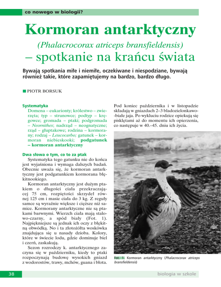 co nowego w biologii? Kormoran antarktyczny (Phalacrocorax atriceps bransfieldensis) – spotkanie na krańcu świata Bywają spotkania miłe i niemiłe, oczekiwane i niespodziane, bywają również takie, które zapamiętujemy na bardzo, bardzo długo. n PIOTR BORSUK Systematyka Domena – eukarionty; królestwo – zwierzęta; typ – strunowce; podtyp – kręgowce; gromada – ptaki; podgromada – Neornithes; nadrząd – neognatyczne; rząd – głuptakowe; rodzina – kormorany; rodzaj – Leucocarbo; gatunek – kormoran niebieskooki; podgatunek – kormoran antarktyczny Dwa słowa o tym, co to za ptak Systematyka tego gatunku nie do końca jest wyjaśniona i wymaga dalszych badań. Obecnie uważa się, że kormoran antarktyczny jest podgatunkiem kormorana błękitnookiego. Kormoran antarktyczny jest dużym ptakiem o długości ciała przekraczającej 75 cm, rozpiętości skrzydeł równej 125 cm i masie ciała do 3 kg. Z reguły samce są wyraźnie większe i cięższe niż samice. Kormorany antarktyczne nie są ptakami barwnymi. Wierzch ciała mają stalowo-czarny, a spód biały (Fot. 1). Najpiękniejsze są jednak ich oczy z błękitną obwódką. No i ta złotożółta woskówka znajdująca się u nasady dzioba. Kolory, które w świecie lodu, gdzie dominuje biel i czerń, zaskakują. Sezon rozrodczy k. antarktycznego zaczyna się w październiku, kiedy to ptaki rozpoczynają budowę wysokich gniazd z wodorostów, trawy, mchów, guana i błota. 38 Pod koniec października i w listopadzie składają w gniazdach 2–3 bladozielonkawo-białe jaja. Po wykluciu rodzice opiekują się pisklętami aż do momentu ich opierzenia, co następuje w 40.–45. dniu ich życia. Fot. 1. Kormoran antarktyczny (Phalacrocorax atriceps bransfieldensis) biologia w szkole co nowego w biologii? Fot. 2. Na Wyspie Króla Jerzego kormorany antarktyczne gniazdują wraz z pingwinami antarktycznymi na skale sterczącej z morza ok. 200 m od brzegu wyspy Szacuje się, że obecnie żyje ok. 12 000 par kormoranów antarktycznych i ich ilość nie ulega zmianie. Dlatego też gatunek ten jest uznawany za niezagrożony wymarciem. Kormorany antarktyczne na Wyspie Króla Jerzego Kormoran antarktyczny jest gatunkiem endemicznym występującym jedynie na zachodnim wybrzeżu Półwyspu Antarktycznego oraz przylegających do niego wyspach. Tworzy kolonie lęgowy na niepokrytych lodem płaskich terenach przybrzeżnych i klifach. Często gniazduje wraz z pingwinami. Tak jest również w przypadku Wyspy Króla Jerzego, gdzie ptaki te mają kolonię lęgową wraz pingwinami antarktycznymi na skale sterczącej z morza tuż przy brzegu wyspy, przy ujściu Zatoki Admiralicji do Cieśniny Bransfielda (Fot. 2). W czasie zimy kormorany antarktyczne tworzą niewielkie stada i przesuwają się nieco bardziej na południe w poszukiwaniu pokarmu tam, gdzie morze jest wolne 2/2011 od paku lodowego. Zimują również na Wyspie Króla Jerzego, tam gdzie Zatoka Admiralicji nie zamarza. Spotkanie na krańcu świata Do kolonii lęgowej kormoranów antarktycznych, najbliższej Polskiej Stacji Antarktycznej im. H. Arctowskiego, nawet szybkim zodiakiem trzeba płynąć prawie trzy kwadranse. Zwykle robią to jedynie osoby prowadzące tzw. monitoring, czyli określające ilość ptaków w kolonii oraz ich sukces reprodukcyjny. Ponieważ kormoranom też nie zawsze po drodze jest zapuszczanie się w głąb Zatoki Admiralicji, to zapewne dlatego, gdy byłem tam pierwszy raz, w 2000 roku, nie spotkałem tego ptaka. Może byłem na Wyspie Króla Jerzego za krótko, a może w pobliżu stacji nie było dla nich pokarmu, morskich skorupiaków i ryb, więc nie miały czego szukać w miejscach, w których prowadziłem badania. Wielokrotnie oglądałem zdjęcia tego ptaka i miałem nadzieję, że kiedyś go zoba- 39 co nowego w biologii? Fot. 3. Pingwin białobrewy (Pygoscelis papua) czę i przekonam się, czy jego oczy rzeczywiście są takie błękitne, a woskówka złocistożółta. Może nawet uda mi się go sfotografować… No i stało się to dwa lata temu, gdy po raz drugi byłem na Wyspie Króla Jerzego. Nawet nie musiałem się bardzo oddalać od stacji. Stał przy brzegu i suszył pióra po kąpieli. Oczywiście miałem przy sobie aparat fotograficzny. Założyłem obiektyw 150 mm, sądząc, że nie uda mi się do niego podejść na odległość mniejszą niż 20–30 m, i zacząłem się do niego wolno, bardzo wolno zbliżać, tak aby ptak cały czas mnie widział. Równocześnie obserwowałem jego zachowanie, nie chcąc go spłoszyć. Staram się nie fotografować na siłę. Jeśli widzę, że zwierzę się denerwuje, po prostu wycofuję się. Nie uważam, aby kolejne zdjęcie, jakich setki w sieci, warte było nerwów zwierzaka. Kormoran był jednak spokojny, a ja co chwilę zatrzymywałem się, żeby zrobić kolejne zdjęcie. Po 15 minutach siedziałem po turecku w odległości ok. 3 m od ptaka! Siedziałem i pstrykałem, pstrykałem, pstrykałem, portret po portrecie, mając świadomość, że może nigdy w życiu nie będę miał drugiej takiej okazji. Możecie Państwo sobie wyobrazić, co przeżywałem, a kormoran pozował mi jak zawodowy model. Trochę żałowałem, że wcześniej porzuciłem plecak z 50-milimetrowym obiektywem, ale cóż, nie można mieć wszystkiego i wtedy… wyszły z morza dwa pingwiny 40 białobrewe (Fot. 3). Wyszły, poczłapały w moją stronę i zatrzymały się w odległości mniej więcej 3 m, jakby prosiły, żebym i im zrobił portrety. Jakby zazdrościły kormoranowi. Nigdy wcześniej i nigdy później pingwiny do mnie nie podchodziły. Owszem, ja do nich tak. Do dziś nie wiem, czemu akurat wtedy podeszły. Może dlatego, że siedziałem i w tej pozycji byłem tylko niewiele od nich wyższy. Może uznały, że spokojne zachowanie kormorana dowodzi, że jestem całkiem niegroźny, a może znaczenie miało zupełnie coś innego albo wiele różnych czynników, które zadziałały równocześnie. W ka