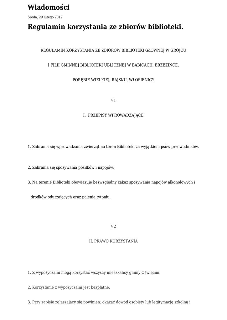 Wiadomości Środa, 29 lutego 2012 Regulamin korzystania ze zbiorów biblioteki. REGULAMIN KORZYSTANIA ZE ZBIORÓW BIBLIOTEKI GŁÓWNEJ W GROJCU I FILII GMINNEJ BIBLIOTEKI UBLICZNEJ W BABICACH, BRZEZINCE, PORĘBIE WIELKIEJ, RAJSKU, WŁOSIENICY §1 I. PRZEPISY WPROWADZAJĄCE 1. Zabrania się wprowadzania zwierząt na teren Biblioteki za wyjątkiem psów przewodników. 2. Zabrania się spożywania posiłków i napojów. 3. Na terenie Biblioteki obowiązuje bezwzględny zakaz spożywania napojów alkoholowych i środków odurzających oraz palenia tytoniu. §2 II. PRAWO KORZYSTANIA 1. Z wypożyczalni mogą korzystać wszyscy mieszkańcy gminy Oświęcim. 2. Korzystanie z wypożyczalni jest bezpłatne. 3. Przy zapisie zgłaszający się powinien: okazać dowód osobisty lub legitymację szkolną i zobowiązać się podpisem do przestrzegania Regulaminu. 4. Za użytkownika do 12 roku życia odpowiadają rodzice lub opiekunowie prawni. 5. Użytkownik zobowiązany jest informować Bibliotekę o zmianie miejsca zamieszkania lub szkoły. 6. Potwierdzeniem zapisu jest karta czytelnika wypożyczalni. 7. Czytelnik zobowiązany jest informować Bibliotekę o wszelkich zmianach danych osobowych. §3 III. WYPOŻYCZANIE 1. Wypożyczać można jednorazowo 6 woluminów na okres nie dłuższy niż 2 miesiące. 2. Bibliotekarz może przesunąć termin zwrotu wypożyczonej książki, jeżeli nie ma na nią zapotrzebowania ze strony innych użytkowników. 3. Bibliotekarz może skrócić ustalony w § 1 termin zwrotu książek, jeżeli stanowią one szczególnie poszukiwane pozycje (np. książki objęte wykazem lektur szkolnych). §4 IV.POSZANOWANIE KSIĄŻEK 1. Użytkownik jest obowiązany do poszanowania książek będących własnością społeczną i dobrem kultury narodowej, powinien też zwrócić uwagę na stan książki przed jej wypożyczeniem. Zauważone uszkodzenia należy zgłosić bibliotekarzowi. 2. Za szkody wynikłe z nie zwrócenia, uszkodzenia lub zniszczenia książki odpowiada użytkownik. 3. W przypadku nie zwrócenia, zniszczenia lub uszkodzenia książki użytkownik zobowiązany jest zwrócić ten sam tytuł książki lub dostarczyć zamiast nie zwróconej, zniszczonej, uszkodzonej inną książkę nie mniejszej wartości, której przydatność dla placówki określi bibliotekarz lub uiścić opłatę, której wysokość ustalana jest na podstawie średniej ceny jednej książki zakupionej przez GBP w roku poprzednim. 4. W przypadku gdy cena książki nie zwróconej, zniszczonej, lub uszkodzonej przekracza tę wysokość, pobiera się jej cenę inwentarzową. 5. Za nie zwrócenie lub zniszczenie książki szczególnie cennej lub trudnej do nabycia na rynku księgarskim, wysokość odszkodowania ustala Dyrektor GBP. Stopień zużycia książki nie ma wpływu na zmniejszenie wysokości odszkodowania. 6. Na sumy wpłacane tytułem należności za nie zwrócone materiały biblioteczne Biblioteka wydaje użytkownikowi pokwitowanie. §5 V.PRZETRZYMYWANIE KSIĄŻEK 1. Za przetrzymywanie książek ponad termin określony w § 3 pkt. 1, Biblioteka może może pobierać opłaty zgodnie z przyjętym cennikiem - od każdego woluminu za każdy miesiąc zaczynający się po terminie zwrotu. 2. Na wniosek czytelnika, w uzasadnionych przypadkach, czytelnik może być zwolniony z z opłaty. O zwolnieniu z opłaty każdorazowo decyzję wydaje Dyrektor Biblioteki. 3. Użytkownik, do którego Biblioteka wysłała upomnienia pocztą pokrywa ich koszty (wg cennika). 4. Jeżeli użytkownik zwraca książkę natychmiast po otrzymaniu pierwszego upomnienia, nie nie pobiera się od niego opłat za przetrzymywanie książek; użytkownik pokrywa jedynie koszty wysyłki upomnienia. 5. Jeżeli użytkownik mimo upomnień wysyłanych przez Bibliotekę odmawia zwrotu lub lub uiszczenia należnych opłat, Biblioteka może dochodzić swych roszczeń zgodnie z przepisami prawa. §6 VI.SKARGI I WNIOSKI Skargi i wnioski użytkownicy mogą wpisywać do książki skarg i wniosków znajdujących się we wszystkich bibliotekach gminy Oświęcim lub zgłaszać do Dyrektor GBP. §7 VII.PRZEPISY KOŃCOWE 1. Użytkownik nie stosujący się do przepisów niniejszego Regulaminu może czasowo, a w szczególnie drastycznych przypadkach na stałe, zostać pozbawiony prawa do korzystania z wypożyczalni. Decyzję w tej sprawie podejmie dyrektor Biblioteki. 2. Z opłat za przetrzymywanie książek zwolnione są dzieci i młodzież ucząca się, jednak nie starsza niż do 21.go roku życia.