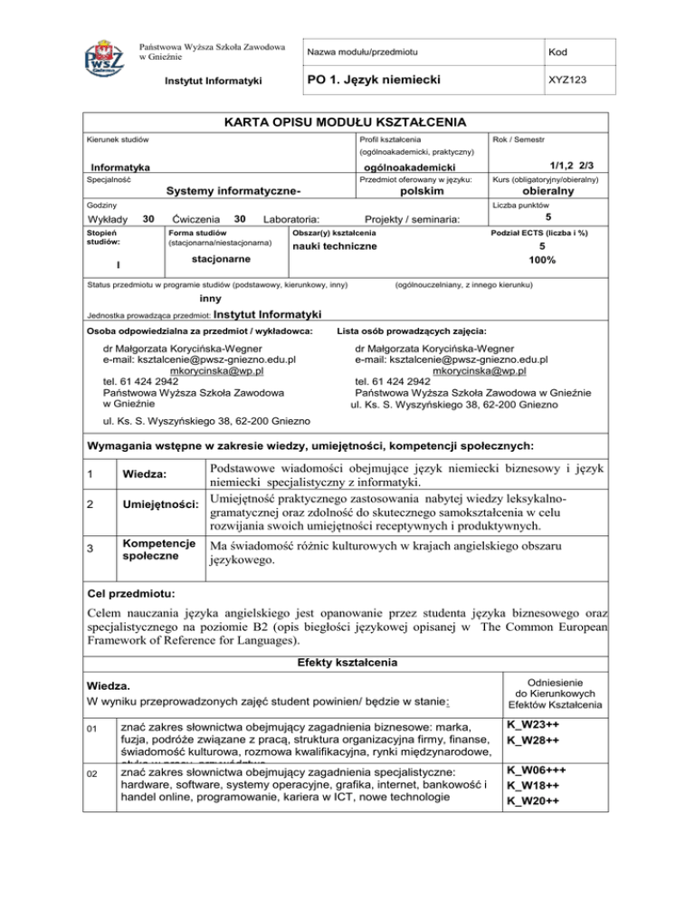 Państwowa Wyższa Szkoła Zawodowa w Gnieźnie Instytut Informatyki Nazwa modułu/przedmiotu Kod PO 1. Język niemiecki XYZ123 KARTA OPISU MODUŁU KSZTAŁCENIA Kierunek studiów Profil kształcenia Rok / Semestr (ogólnoakademicki, praktyczny) 1/1,2 2/3 ogólnoakademicki Informatyka Specjalność Przedmiot oferowany w języku: Systemy informatyczne- Kurs (obligatoryjny/obieralny) polskim obieralny Liczba punktów Godziny Wykłady Stopień : 30 studiów: Ćwiczenia 30 : Forma studiów Laboratoria: Obszar(y) kształcenia (stacjonarna/niestacjonarna) 5 Projekty / seminaria: Podział ECTS (liczba i %) nauki techniczne 5 100% stacjonarne I Status przedmiotu w programie studiów (podstawowy, kierunkowy, inny) Liczba punktów (ogólnouczelniany, z innego kierunku) inny Jednostka prowadząca przedmiot: Instytut Informatyki Osoba odpowiedzialna za przedmiot / wykładowca: dr Małgorzata Korycińska-Wegner e-mail: [email protected] [email protected] tel. 61 424 2942 Państwowa Wyższa Szkoła Zawodowa w Gnieźnie xx xxx Lista osób prowadzących zajęcia: dr Małgorzata Korycińska-Wegner e-mail: [email protected] [email protected] tel. 61 424 2942 Państwowa Wyższa Szkoła Zawodowa w Gnieźnie ul. Ks. S. Wyszyńskiego 38, 62-200 Gniezno ul. Ks. S. Wyszyńskiego 38, 62-200 Gniezno Wymagania wstępne w zakresie wiedzy, umiejętności, kompetencji społecznych: 1 2 3 Podstawowe wiadomości obejmujące język niemiecki biznesowy i język niemiecki specjalistyczny z informatyki. Umiejętność praktycznego zastosowania nabytej wiedzy leksykalnoUmiejętności: gramatycznej oraz zdolność do skutecznego samokształcenia w celu rozwijania swoich umiejętności receptywnych i produktywnych. Wiedza: Kompetencje społeczne Ma świadomość różnic kulturowych w krajach angielskiego obszaru językowego. Cel przedmiotu: Celem nauczania języka angielskiego jest opanowanie przez studenta języka biznesowego oraz specjalistycznego na poziomie B2 (opis biegłości językowej opisanej w The Common European Framework of Reference for Languages). Efekty kształcenia Wiedza. W wyniku przeprowadzonych zajęć student powinien/ będzie w stanie: 01 02 znać zakres słownictwa obejmujący zagadnienia biznesowe: marka, fuzja, podróże związane z pracą, struktura organizacyjna firmy, finanse, świadomość kulturowa, rozmowa kwalifikacyjna, rynki międzynarodowe, etyka w pracy, przywództwo znać zakres słownictwa obejmujący zagadnienia specjalistyczne: hardware, software, systemy operacyjne, grafika, internet, bankowość i handel online, programowanie, kariera w ICT, nowe technologie Odniesienie do Kierunkowych Efektów Kształcenia K_W23++ K_W28++ K_W06+++ K_W18++ K_W20++ PO 1. Język niemiecki 03 znać zasady gramatyczne na poziomie B2 pozwalające na prawidłowe tworzenie struktur zdaniowych. Umiejętności. W wyniku przeprowadzonych zajęć student będzie potrafił: K_W26++ Odniesienie do Kierunkowych Efektów Kształcenia 01 brać czynny udział w zebraniach prowadzonych w języku angielskim, wykonać rozmowę telefoniczną, przedstawić prezentację na temat związany z kierunkiem studiów, negocjować. K_U02+++ K_U03++ 02 opisać w języku angielskim zagadnienia związane z ICT K_U05++ 03 używać języka w sposób poprawny, wyrazić swoje opinie, napisać CV i podanie o pracę, zrozumieć język mówiony o naturalnym tempie przekazu, czytać ze zrozumieniem literaturę fachową. Kompetencje społeczne. W wyniku przeprowadzonych zajęć student zdobędzie następujące kompetencje: K_U01++ Odniesienie do Kierunkowych Efektów Kształcenia 01 Rozumie potrzebę permanentnego kształcenia się i przekazywania w sposób zrozumiały informacji z najbliższym otoczeniem w działalności zawodowej. K_K01++ 02 Wykazuje potrzebę dostosowania rejestru języka do poszczególnych kontekstów sytuacyjnych ze względu na różnice kulturowe. K_K03++ Sposoby sprawdzenia efektów kształcenia Ćwiczenia: 4. ewaluacja ciągła obejmująca sprawdzanie testów pisemnych, analizę odpowiedzi ustnych, zadawanie i sprawdzanie ćwiczeń domowych obejmujących podręcznik oraz platformę e-learningową CLIP, 5. zaliczenie w postaci oceny po każdym semestrze nauki, 6. egzamin końcowy w formie pisemnej i ustnej obejmujący język ogólny i specjalistyczny. Treści programowe Rozwijanie umiejętności komunikowania się w sytuacjach życia codziennego (m.in. sytuacja mieszkaniowa, poszukiwanie mieszkania, podróżowanie, kontakty międzyludzkie, zdrowie/wizyta u lekarza, zakupy, restauracja, czas wolny); wprowadzenie i utrwalenie materiału dotyczących życia zawodowego: ogólne aspekty życia zawodowego (m.in. funkcjonowanie firmy, komputer, omawianie wykresów, schematów, ubieganie się o pracę, przygotowanie/omówienie prezentacji) oraz wybrane zagadnienia języka specjalistycznego studiowanego kierunku; przygotowanie studentów do samodzielnego rozwijania umiejętności językowych oraz do samodzielnego korzystania z literatury i prasy fachowej; Literatura podstawowa: 1. Tangram 1A-2B. Hueber 2007. 2. Praktyczna gramatyka języka niemieckiego. Hueber 2006. 3. Klipp und klar. LektorKlett 2002. Jniem_2012.doc 157 4. 5. Niemiecki bez błędów. LektorKlett 2002. Großer Lernwortschatz DaF Deutsch-Polnisch. Hueber 2005. 6. Sage und schreibe. LektorKlett 2003. 7. Polnische und deutsche Redewendungen. PWN 2006. 8. Tatsachen über Deutschland. Societäts Verlag 2008. 9. Słownik naukowo-techniczny. Niemiecko-polski. Polsko-niemiecki. W NT Warszawa 2005. 10. Wirtschaftsdeutsch für Anfänger. Grundstufe Und Aufbaustufe. LektorKlett 2005.. Literatura uzupełniająca: 2. . Obciążenie pracą studenta forma aktywności godzin ECTS Łączny nakład pracy 1801) 5 Zajęcia wymagające indywidualnego kontaktu z nauczycielem 1302) 3 Zajęcia o charakterze praktycznym 1003) 3 1 pkt ECTS 25-30 h pracy studenta – do określenia poszczególnych składowych przyjęto: 158 1) – łączne obciążenie studenta 2) - zajęcia dydaktyczne {