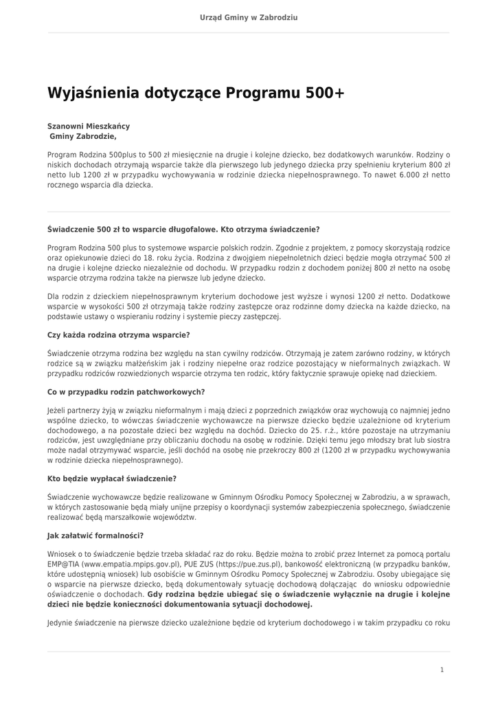 Urząd Gminy w Zabrodziu Wyjaśnienia dotyczące Programu 500+ Szanowni Mieszkańcy Gminy Zabrodzie, Program Rodzina 500plus to 500 zł miesięcznie na drugie i kolejne dziecko, bez dodatkowych warunków. Rodziny o niskich dochodach otrzymają wsparcie także dla pierwszego lub jedynego dziecka przy spełnieniu kryterium 800 zł netto lub 1200 zł w przypadku wychowywania w rodzinie dziecka niepełnosprawnego. To nawet 6.000 zł netto rocznego wsparcia dla dziecka. Świadczenie 500 zł to wsparcie długofalowe. Kto otrzyma świadczenie? Program Rodzina 500 plus to systemowe wsparcie polskich rodzin. Zgodnie z projektem, z pomocy skorzystają rodzice oraz opiekunowie dzieci do 18. roku życia. Rodzina z dwojgiem niepełnoletnich dzieci będzie mogła otrzymać 500 zł na drugie i kolejne dziecko niezależnie od dochodu. W przypadku rodzin z dochodem poniżej 800 zł netto na osobę wsparcie otrzyma rodzina także na pierwsze lub jedyne dziecko. Dla rodzin z dzieckiem niepełnosprawnym kryterium dochodowe jest wyższe i wynosi 1200 zł netto. Dodatkowe wsparcie w wysokości 500 zł otrzymają także rodziny zastępcze oraz rodzinne domy dziecka na każde dziecko, na podstawie ustawy o wspieraniu rodziny i systemie pieczy zastępczej. Czy każda rodzina otrzyma wsparcie? Świadczenie otrzyma rodzina bez względu na stan cywilny rodziców. Otrzymają je zatem zarówno rodziny, w których rodzice są w związku małżeńskim jak i rodziny niepełne oraz rodzice pozostający w nieformalnych związkach. W przypadku rodziców rozwiedzionych wsparcie otrzyma ten rodzic, który faktycznie sprawuje opiekę nad dzieckiem. Co w przypadku rodzin patchworkowych? Jeżeli partnerzy żyją w związku nieformalnym i mają dzieci z poprzednich związków oraz wychowują co najmniej jedno wspólne dziecko, to wówczas świadczenie wychowawcze na pierwsze dziecko będzie uzależnione od kryterium dochodowego, a na pozostałe dzieci bez względu na dochód. Dziecko do 25. r.ż., które pozostaje na utrzymaniu rodziców, jest uwzględniane przy obliczaniu dochodu na osobę w rodzinie. Dzięki temu jego młodszy brat lub siostra może nadal otrzymywać wsparcie, jeśli dochód na osobę nie przekroczy 800 zł (1200 zł w przypadku wychowywania w rodzinie dziecka niepełnosprawnego). Kto będzie wypłacał świadczenie? Świadczenie wychowawcze będzie realizowane w Gminnym Ośrodku Pomocy Społecznej w Zabrodziu, a w sprawach, w których zastosowanie będą miały unijne przepisy o koordynacji systemów zabezpieczenia społecznego, świadczenie realizować będą marszałkowie województw. Jak załatwić formalności? Wniosek o to świadczenie będzie trzeba składać raz do roku. Będzie można to zrobić przez Internet za pomocą portalu EMP@TIA (www.empatia.mpips.gov.pl), PUE ZUS (https://pue.zus.pl), bankowość elektroniczną (w przypadku banków, które udostępnią wniosek) lub osobiście w Gminnym Ośrodku Pomocy Społecznej w Zabrodziu. Osoby ubiegające się o wsparcie na pierwsze dziecko, będą dokumentowały sytuację dochodową dołączając do wniosku odpowiednie oświadczenie o dochodach. Gdy rodzina będzie ubiegać się o świadczenie wyłącznie na drugie i kolejne dzieci nie będzie konieczności dokumentowania sytuacji dochodowej. Jedynie świadczenie na pierwsze dziecko uzależnione będzie od kryterium dochodowego i w takim przypadku co roku 1 Urząd Gminy w Zabrodziu trzeba potwierdzić fakt nieprzekroczenia tego progu (np. PIT za 2014 rok, zaświadczenie o dochodach). We wniosku trzeba podać dane osoby starającej się o świadczenie, dane drugiego z rodziców oraz dane dzieci wraz z dodatkowymi zaświadczeniami i oświadczeniami jeśli takie będą w indywidualnej sprawie niezbędne. Jednocześnie GOPS sam będzie pozyskiwał podstawowe dane o dochodach, więc nie trzeba będzie już dołączać tych informacji. Świadczenie wychowawcze, tak jak wszystkie świadczenia rodzinne, będzie wypłacane w sposób dogodny dla rodziców, czyli przede wszystkim przelewem na konto. Kiedy będzie można składać wnioski? Wnioski będzie można składać od 1 kwietnia 2016 r. tj. od momentu startu programu. Jeśli wniosek zostanie złożony w ciągu pierwszych 3 miesięcy, rodzice dostaną wyrównanie wstecz od 1 kwietnia – pozwoli to uniknąć kolejek i zapewni płynność wypłat. Do programu będzie można dołączyć w dowolnym momencie. W kolejnych miesiącach świadczenie będzie wypłacane od miesiąca, w którym rodzice złożą wniosek. Co do zasady, dla osób korzystających z programu okres rozliczeniowy będzie trwał od 1 października do 30 września następnego roku kalendarzowego. Istotne jest, że pierwszy okres na jaki będzie przyznane prawo do świadczenia będzie dłuższy, gdyż rozpocznie się 1 kwietnia 2016 r. i trwać będzie do 30 września 2017 roku. Dzięki temu rodzice nie będą musieli składać dwóch wniosków w 2016 roku, kiedy program wejdzie w życie. Rodzina z dzieckiem niepełnosprawnym? W przypadku dziecka niepełnosprawnego kryterium dochodowe na pierwsze dziecko będzie wynosiło 1200 zł. Istotne jest, że w składzie rodziny brane będą pod uwagę pozostające na utrzymaniu dzieci do ukończenia 25 roku życia. Dodatkowo, wliczane też będą dzieci, które ukończyły 25. rok życia, legitymujące się orzeczeniem o znacznym stopniu niepełnosprawności, jeżeli w związku z tą niepełnosprawnością przysługuje świadczenie pielęgnacyjne lub specjalny zasiłek opiekuńczy albo zasiłek dla opiekuna. Ile będzie można dostać? Rodzina z dwojgiem dzieci spełniająca kryterium dochodowe otrzyma miesięcznie 1000 zł. Jeśli jej dochody na osobę są wyższe niż 800/1.200 zł netto, otrzyma 500 zł miesięcznie, aż do ukończenia przez dziecko 18 r.ż. Rocznie mniej zamożne rodziny z dwojgiem dzieci otrzymają 12 tys. zł. Rada Ministrów będzie miała możliwość podwyższenia wysokości wsparcia i kryterium dochodowego w zależności m.in. o
