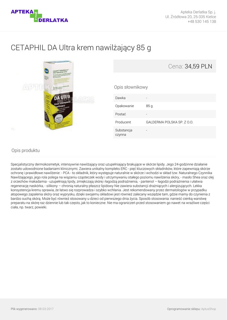 Apteka Derlatka Sp. j. Ul. Źródłowa 20, 25-335 Kielce +48 530 145 138 CETAPHIL DA Ultra krem nawilżający 85 g Cena: 34,59 PLN Opis słownikowy Dawka - Opakowanie 85 g Postać - Producent GALDERMA POLSKA SP. Z O.O. Substancja czynna - Opis produktu Specjalistyczny dermokosmetyk, intensywnie nawilżający oraz uzupełniający brakujące w skórze lipidy. Jego 24-godzinne działanie zostało udowodnione badaniami klinicznymi. Zawiera unikalny kompleks ERC - pięć kluczowych składników, które zapewniają skórze ochronę i prawidłowe nawilżenie: - PCA - to składnik, który występuje naturalnie w skórze i wchodzi w skład tzw. Naturalnego Czynnika Nawilżającego, jego rola polega na wiązaniu cząsteczek wody i utrzymywaniu stałego poziomu nawilżenia skóry, - masło Shea oraz olej z orzechów makadamia - uzupełniają lipidy, zmiękczają skórę i łagodzą podrażnienia, - pantenol – łagodzi podrażnienia i ułatwia regenerację naskórka, - silikony – chronią naturalny płaszcz lipidowy Nie zawiera substancji drażniących i alergizujących. Lekka konsystencja kremu sprawia, że łatwo się rozprowadza i szybko wchłania. Jest rekomendowany przez dermatologów w przypadku atopowego zapalenia skóry oraz wyprysku, dzięki swojemu składowi jest również zalecany wszędzie tam, gdzie mamy do czynienia z bardzo suchą skórą. Może być również stosowany u dzieci od pierwszego dnia życia. Sposób stosowania: nanieść cienką warstwę preparatu na skórę raz dziennie lub tak często, jak to konieczne. Nie ma ograniczeń przed stosowaniem go nawet na wrażliwe części ciała, np. twarz, powieki. Plik wygenerowano: 08-03-2017 Powered by TCPDF (www.tcpdf.org) Oprogramowanie sklepu: AptusShop
