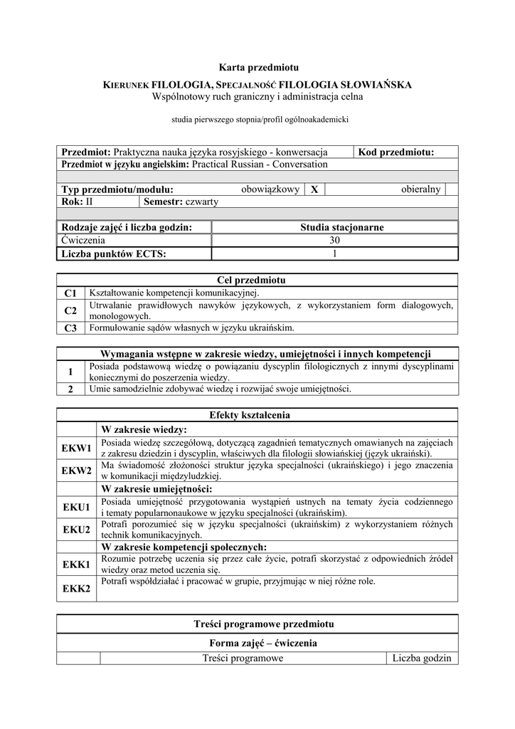 Karta przedmiotu KIERUNEK FILOLOGIA, SPECJALNOŚĆ FILOLOGIA SŁOWIAŃSKA Wspólnotowy ruch graniczny i administracja celna studia pierwszego stopnia/profil ogólnoakademicki Przedmiot: Praktyczna nauka języka rosyjskiego - konwersacja Przedmiot w języku angielskim: Practical Russian - Conversation Typ przedmiotu/modułu: Rok: II Semestr: czwarty obowiązkowy Rodzaje zajęć i liczba godzin: Ćwiczenia Liczba punktów ECTS: Kod przedmiotu: X obieralny Studia stacjonarne 30 1 Cel przedmiotu C1 C2 C3 Kształtowanie kompetencji komunikacyjnej. Utrwalanie prawidłowych nawyków językowych, z wykorzystaniem form dialogowych, monologowych. Formułowanie sądów własnych w języku ukraińskim. Wymagania wstępne w zakresie wiedzy, umiejętności i innych kompetencji 1 2 Posiada podstawową wiedzę o powiązaniu dyscyplin filologicznych z innymi dyscyplinami koniecznymi do poszerzenia wiedzy. Umie samodzielnie zdobywać wiedzę i rozwijać swoje umiejętności. Efekty kształcenia W zakresie wiedzy: Posiada wiedzę szczegółową, dotyczącą zagadnień tematycznych omawianych na zajęciach EKW1 z zakresu dziedzin i dyscyplin, właściwych dla filologii słowiańskiej (język ukraiński). Ma świadomość złożoności struktur języka specjalności (ukraińskiego) i jego znaczenia EKW2 w komunikacji międzyludzkiej. W zakresie umiejętności: EKU1 EKU2 Posiada umiejętność przygotowania wystąpień ustnych na tematy życia codziennego i tematy popularnonaukowe w języku specjalności (ukraińskim). Potrafi porozumieć się w języku specjalności (ukraińskim) z wykorzystaniem różnych technik komunikacyjnych. W zakresie kompetencji społecznych: EKK1 EKK2 Rozumie potrzebę uczenia się przez całe życie, potrafi skorzystać z odpowiednich źródeł wiedzy oraz metod uczenia się. Potrafi współdziałać i pracować w grupie, przyjmując w niej różne role. Treści programowe przedmiotu Forma zajęć – ćwiczenia Treści programowe Liczba godzin Środki transportu. Podróż, granica. Kuchnia – nazwy potraw, przygotowywanie posiłków. Restauracja, kawiarnia. Zdrowie i zdrowy styl życia. ĆW1 ĆW2 ĆW3 ĆW4 ĆW5 6 6 6 6 6 30 Suma godzin: Metody i środki dydaktyczne Ćwiczenia audytoryjne: praca w grupach. Ćwiczenia audytoryjne: gry symulacyjne. M1 M2 Sposoby oceniania Ocenianie kształtujące F1 Prace cząstkowe w formie ustnej i pisemnej. P1 P2 Ocena semestralna jest wypadkową ocen cząstkowych. Kolokwium ustne na zakończenie semestru. Ocenianie podsumowujące Obciążenie pracą studenta Średnia liczba godzin na realizowanie Forma aktywności aktywności Godziny kontaktowe z wykładowcą, realizowane w formie zajęć dydaktycznych – łączna liczba godzin w semestrze Godziny kontaktowe z wykładowcą, realizowane w formie konsultacji Przygotowanie się do zajęć 30 1 16 Suma godzin: 47 Sumaryczna liczba punktów ECTS dla przedmiotu 1 Literatura podstawowa i uzupełniająca Literatura podstawowa 1 2 3 С. Воробйова, Практичний курс української мови для іноземців: усне мовлення, Київ 2005. О. Белей, Розмовляєте українською. Підручник української мови, Wrocław 2006. I. Kononenko, I. Mytnik, E. Wasiak, Słownik tematyczny polsko-ukraiński, Warszawa 2010. Sposoby oceniania Metody i środki dydaktyczne Treści programowe Cele przedmiotu Stopień w jakim efekty kształcenia związane są z przedmiotem Odniesienie danego efektu do efektów specjalnościowych Stopień w jakim efekty kształcenia związane są z przedmiotem Efekt kształcenia Odniesienie danego efektu kształcenia do efektów zdefiniowanych dla całego programu (PEK) Macierz efektów kształcenia EKW1 K_W04 +++ C1, C2, C3 ĆW 1-5 1,2 F1, P1, P2 EKW2 K_W09 +++ C1, C2, C3 ĆW 1-5 1,2 F1, P1, P2 EKU1 K_U09 +++ C1, C2, C3 ĆW 1-5 1,2 F1, P1, P2 EKU2 K_U07 +++ C1, C2, C3 ĆW 1-5 1,2 F1, P1, P2 EKK1 K_K01 +++ C1, C2, C3 ĆW 1-5 1,2 F1, P1, P2 EKK2 K_K02 +++ C1, C2, C3 ĆW 1-5 1,2 F1, P1, P2 Formy oceny - szczegóły Na ocenę 2 (ndst) Na ocenę 3 (dst) Na ocenę 3+ (dst+) Na ocenę 4 (db) Na ocenę 4+ (db+) Nie posiada elementarnej wiedzy dotyczącej zagadnień tematycznych omawianych na zajęciach, nie potrafi wykorzystać jej w sytuacjach komunikacyjnych; Nie ma świadomości złożoności struktur języka ukraińskiego i jego znaczenia w komunikacji międzyludzkiej, nie zna elementarnej leksyki języka ukraińskiego, nie umie zastosować jej w tłumaczeniach; Nie przygotowuje wystąpień ustnych na tematy życia codziennego w języku ukraińskim, nie wykorzystuje poznanej leksyki; Niepoprawnie porozumiewa się w języku ukraińskim, popełniając elementarne błędy, uniemożliwiające komunikację; Nie wykazuje zainteresowania tematem i nie rozumie potrzeby ciągłego uczenia się; Nie jest kreatywny, zamknięty na odmienność kulturową, nie potrafi myśleć krytycznie i rozwiązywać problemów. Posiada elementarną wiedzę dotyczącą zagadnień tematycznych omawianych na zajęciach, potrafi częściowo wykorzystać poznane zagadnienia w sytuacji komunikacyjnej; Ma niewielką świadomość złożoności struktur języka ukraińskiego i jego znaczenia w komunikacji międzyludzkiej, zna elementarną leksykę języka ukraińskiego, stosuje je w tłumaczeniach, popełniając liczne błędy; Przygotowuje wystąpienia ustne na niektóre tematy życia codziennego w języku ukraińskim, wykorzystuje poznaną leksykę, popełniając liczne błędy gramatyczne; Porozumiewa się w języku ukraińskim, popełniając liczne błędy, zakłócające komunikację, wykorzystuje niektóre techniki komunikacyjne; W niewielkim stopniu wykazuje zainteresowanie tematem i potrzebę ciągłego uczenia się; Nie jest kreatywny, w umiarkowanym stopniu jest otwarty na odmienność kulturową, nie potrafi myśleć krytycznie i rozwiązywać problemów. Posiada elementarną wiedzę dotyczącą zagadnień tematycznych omawi