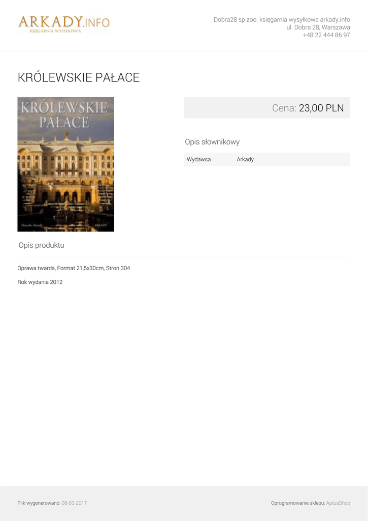 Dobra28 sp zoo. księgarnia wysyłkowa arkady.info ul. Dobra 28, Warszawa +48 22 444 86 97 KRÓLEWSKIE PAŁACE Cena: 23,00 PLN Opis słownikowy Wydawca Arkady Opis produktu Oprawa twarda, Format 21,5x30cm, Stron 304 Rok wydania 2012 Plik wygenerowano: 08-03-2017 Powered by TCPDF (www.tcpdf.org) Oprogramowanie sklepu: AptusShop