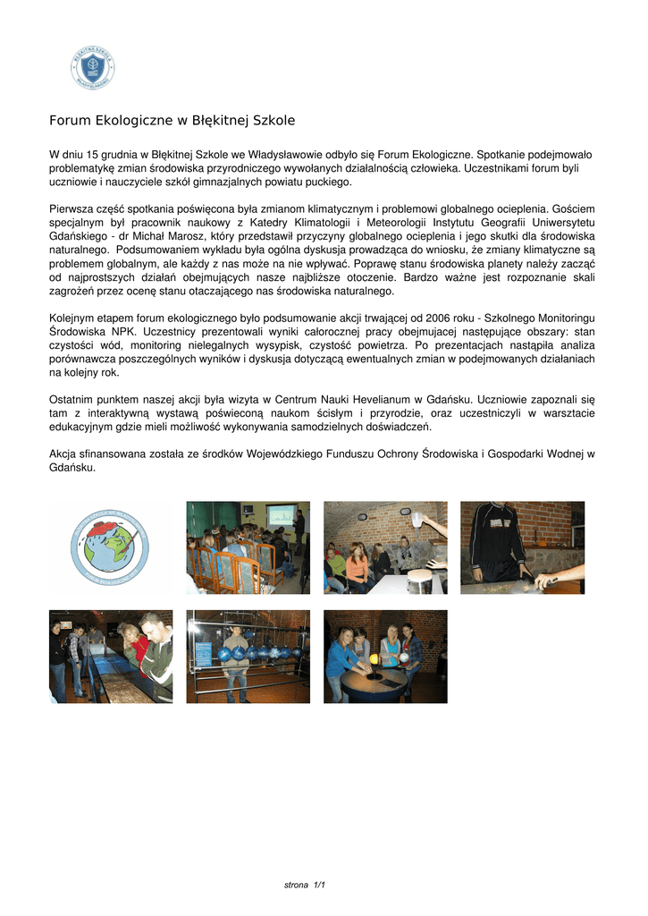 Forum Ekologiczne w Błękitnej Szkole W dniu 15 grudnia w Błękitnej Szkole we Władysławowie odbyło się Forum Ekologiczne. Spotkanie podejmowało problematykę zmian środowiska przyrodniczego wywołanych działalnością człowieka. Uczestnikami forum byli uczniowie i nauczyciele szkół gimnazjalnych powiatu puckiego. Pierwsza część spotkania poświęcona była zmianom klimatycznym i problemowi globalnego ocieplenia. Gościem specjalnym był pracownik naukowy z Katedry Klimatologii i Meteorologii Instytutu Geografii Uniwersytetu Gdańskiego - dr Michał Marosz, który przedstawił przyczyny globalnego ocieplenia i jego skutki dla środowiska naturalnego. Podsumowaniem wykładu była ogólna dyskusja prowadząca do wniosku, że zmiany klimatyczne są problemem globalnym, ale każdy z nas może na nie wpływać. Poprawę stanu środowiska planety należy zacząć od najprostszych działań obejmujących nasze najbliższe otoczenie. Bardzo ważne jest rozpoznanie skali zagrożeń przez ocenę stanu otaczającego nas środowiska naturalnego. Kolejnym etapem forum ekologicznego było podsumowanie akcji trwającej od 2006 roku - Szkolnego Monitoringu Środowiska NPK. Uczestnicy prezentowali wyniki całorocznej pracy obejmujacej następujące obszary: stan czystości wód, monitoring nielegalnych wysypisk, czystość powietrza. Po prezentacjach nastąpiła analiza porównawcza poszczególnych wyników i dyskusja dotyczącą ewentualnych zmian w podejmowanych działaniach na kolejny rok. Ostatnim punktem naszej akcji była wizyta w Centrum Nauki Hevelianum w Gdańsku. Uczniowie zapoznali się tam z interaktywną wystawą poświeconą naukom ścisłym i przyrodzie, oraz uczestniczyli w warsztacie edukacyjnym gdzie mieli możliwość wykonywania samodzielnych doświadczeń. Akcja sfinansowana została ze środków Wojewódzkiego Funduszu Ochrony Środowiska i Gospodarki Wodnej w Gdańsku. strona 1/1 Powered by TCPDF (www.tcpdf.org)