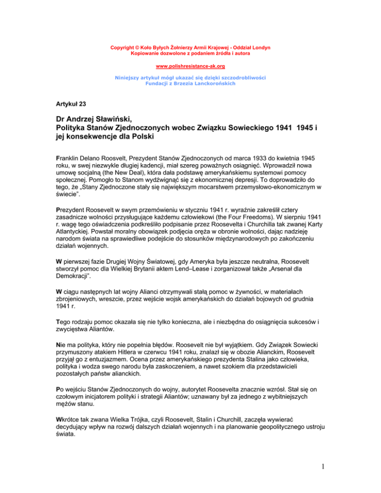 Copyright © Koło Byłych Żołnierzy Armii Krajowej - Oddział Londyn Kopiowanie dozwolone z podaniem źródła i autora www.polishresistance-ak.org Niniejszy artykuł mógł ukazać się dzięki szczodrobliwości Fundacji z Brzezia Lanckorońskich Artykuł 23 Dr Andrzej Sławiński, Polityka Stanów Zjednoczonych wobec Związku Sowieckiego 1941 1945 i jej konsekwencje dla Polski Franklin Delano Roosvelt, Prezydent Stanów Zjednoczonych od marca 1933 do kwietnia 1945 roku, w swej niezwykle długiej kadencji, miał szereg poważnych osiągnięć. Wprowadził nowa umowę socjalną (the New Deal), która dała podstawę amerykańskiemu systemowi pomocy społecznej. Pomogło to Stanom wydźwignąć się z ekonomicznej depresji. To doprowadziło do tego, że „Stany Zjednoczone stały się największym mocarstwem przemysłowo-ekonomicznym w świecie”. Prezydent Roosevelt w swym przemówieniu w styczniu 1941 r. wyraźnie zakreślił cztery zasadnicze wolności przysługujące każdemu człowiekowi (the Four Freedoms). W sierpniu 1941 r. wagę tego oświadczenia podkreśliło podpisanie przez Roosevelta i Churchilla tak zwanej Karty Atlantyckiej. Powstał moralny obowiązek podjęcia oręża w obronie wolności, dając nadzieję narodom świata na sprawiedliwe podejście do stosunków międzynarodowych po zakończeniu działań wojennych. W pierwszej fazie Drugiej Wojny Światowej, gdy Ameryka była jeszcze neutralna, Roosevelt stworzył pomoc dla Wielkiej Brytanii aktem Lend–Lease i zorganizował także „Arsenał dla Demokracji”. W ciągu następnych lat wojny Alianci otrzymywali stałą pomoc w żywności, w materiałach zbrojeniowych, wreszcie, przez wejście wojsk amerykańskich do działań bojowych od grudnia 1941 r. Tego rodzaju pomoc okazała się nie tylko konieczna, ale i niezbędna do osiągnięcia sukcesów i zwycięstwa Aliantów. Nie ma polityka, który nie popełnia błędów. Roosevelt nie był wyjątkiem. Gdy Związek Sowiecki przymuszony atakiem Hitlera w czerwcu 1941 roku, znalazł się w obozie Alianckim, Roosevelt przyjął go z entuzjazmem. Ocena przez amerykańskiego prezydenta Stalina jako człowieka, polityka i wodza swego narodu była zaskoczeniem, a nawet szokiem dla przedstawicieli pozostałych państw alianckich. Po wejściu Stanów Zjednoczonych do wojny, autorytet Roosevelta znacznie wzrósł. Stał się on czołowym inicjatorem polityki i strategii Aliantów; uznawany był za jednego z wybitniejszych mężów stanu. Wkrótce tak zwana Wielka Trójka, czyli Roosevelt, Stalin i Churchill, zaczęła wywierać decydujący wpływ na rozwój dalszych działań wojennych i na planowanie geopolitycznego ustroju świata. 1 Współcześni historycy, w swej subiektywnej ocenie uważają, że Roosevelt uznał Stalina za zasadniczo przyzwoitego człowieka i przywódcę swego narodu. Wierzył, że system sowiecki oparty na socjalizmie, pod jego kierownictwem da się przekształcić w system demokratyczny. Wierzyłem, że swoim wpływem uda mu się kierować Stalinem, który według niego nie miał imperialistycznych ambicji. Wizją Roosevelta była współpraca ze Stalinem prowadząca do zwycięstwa Stanów Zjednoczonych i Związku Sowieckiego nad wspólnym wrogiem; uważał, że po wojnie będą wspólnie decydować o politycznej i ekonomicznej strukturze wolnego świata. Roosevelt był przygotowany wykluczyć z tej współpracy Churchilla i całe Imperium Brytyjskie (jak również i Francję). Uważał, że nie można im zaufać, iż będą sprzyjały demokracji i sprawiedliwie rozwiązywały na świecie przyszłe układy pokojowe. We wszystkich układach Wielkiej Trojki, Roosevelt zawsze brał stronę Stalina. W ekipie rządowej Roosevelta tylko niewielu członków godziło się na wprowadzenie w życie niezwykłego stosunku wobec Stalina. Głównym poplecznikami idei Roosevelta byli jego osobisty przedstawiciel Harry Hopkins i były ambasador w Moskwie (rok 1937) Joseph Davies. Wszelkie rady i ostrzeżenia znawców polityki międzynarodowej jak William Bulliet, Loy Henderson, Charles E.”Chip” Bohlen, Averell Harriman i gen. John Deane, nie były przyjmowane do wiadomości. Byli to ludzie wielce zasłużeni w dyplomacji; mieli za sobą służbę na placówkach w Moskwie. Do końca swojego życia Roosevelt próbował zyskać sobie zaufanie i przyjaźń Stalina. Ten natomiast nie ufał prezydentowi i sowieccy szpiedzy dość łatwo wykradali tajemnice państwowe Ameryki. Roosevelt zawsze był gotów iść na rękę Stalinowi, spełnić prośby i żądania, nie zwracając uwagi na rady czy opinie Churchilla. Ważniejszymi koncesjami Roosevelta dla Stalina były: 1. Zwiększenie pomocy dla Rosji w czasie drugiej wojny światowej pomimo ogromnych strat floty Aliantów na morzu Arktycznym. Niektóre z tych przesyłek nie służyły celom wojennym, a rozbudowywały sowiecki przemysł i sowiecką potęgę. 2. Poparcie żądań Stalina o utworzenie tzw. Drugiego Frontu, co było z punktu widzenia wojskowego przedwczesne i niewykonalne. 3. Uznanie za wiarygodne fałszywe informacje Stalina, że zbyteczną jest pomoc Powstaniu Warszawskiemu. 4. Wyrażenie zgody na zakreślenie powojennych zachodnich granic Związku Sowieckiego na podstawie ustaleń paktu Ribbentrop – Mołotow z 1939 roku. 5. Pozostawienie Stalinowi swobody w planach wprowadzenia dominacji nad państwami bałtyckimi, wschodnioeuropejskimi włącznie z Polską oraz nad niektórymi z państw bałkańskich. Sprawy te zostały sfinalizowane podczas spotkania „tete-a-tete” Stalina z Rooseveltem w Teheranie i Jałcie. 6. Uznanie Armii Czerwonej za zdobywcę Berlina, co było dla Sowietów ogromnym atutem propagandowym, w pełni rozpowszechnionym. W tym samym czasie wojska amerykańskie wysłano na zdobycie fikcyjnej nazistowskiej twierdzy w Alpach Bawarskich. Stalin nie liczył się ze zdaniem Aliantów i prowadził konsekwentnie własną politykę. Postawa Roosevelta znacznie mu to ułatwiała, tak że 