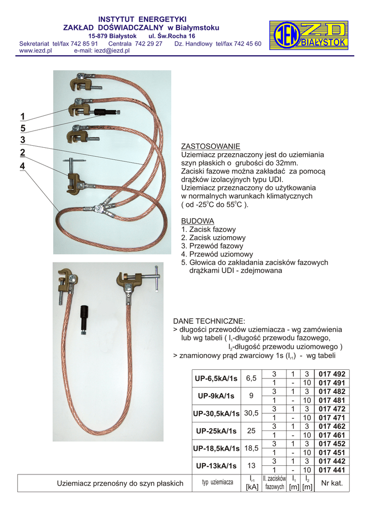 INSTYTUT ENERGETYKI ZAKŁAD DOŚWIADCZALNY w Białymstoku 15-879 Białystok ul. Św.Rocha 16 Sekretariat tel/fax 742 85 91 Centrala 742 29 27 Dz. Handlowy tel/fax 742 45 60 www.iezd.pl e-mail: [email protected] 1 5 3 2 4 ZASTOSOWANIE Uziemiacz przeznaczony jest do uziemiania szyn płaskich o grubości do 32mm. Zaciski fazowe można zakładać za pomocą drążków izolacyjnych typu UDI. Uziemiacz przeznaczony do użytkowania w normalnych warunkach klimatycznych ( od -250C do 550C ). BUDOWA 1. Zacisk fazowy 2. Zacisk uziomowy 3. Przewód fazowy 4. Przewód uziomowy 5. Głowica do zakładania zacisków fazowych drążkami UDI - zdejmowana DANE TECHNICZNE: > długości przewodów uziemiacza - wg zamówienia lub wg tabeli ( l1-długość przewodu fazowego, l2-długość przewodu uziomowego ) > znamionowy prąd zwarciowy 1s (Ir1) - wg tabeli 3 1 3 9 UP-9kA/1s 1 3 UP-30,5kA/1s 30,5 1 3 UP-25kA/1s 25 1 3 UP-18,5kA/1s 18,5 1 3 UP-13kA/1s 13 1 lr1 Il. zacisków typ uziemiacza [kA] fazowych UP-6,5kA/1s Uziemiacz przenośny do szyn płaskich 6,5 1 1 1 1 1 1 l1 [m] 3 10 3 10 3 10 3 10 3 10 3 10 l2 [m] 017 492 017 491 017 482 017 481 017 472 017 471 017 462 017 461 017 452 017 451 017 442 017 441 Nr kat.