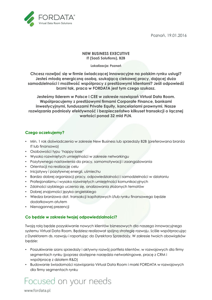 Poznań, 19.01.2016 NEW BUSINESS EXECUTIVE IT (SaaS Solutions), B2B Lokalizacja: Poznań Chcesz rozwijać się w firmie świadczącej innowacyjne na polskim rynku usługi? Jesteś młodą energiczną osobą, szukającą ciekawej pracy, dającej dużo samodzielności i możliwość współpracy z prestiżowymi klientami? Jeśli odpowiedź brzmi tak, praca w FORDATA jest tym czego szukasz. Jesteśmy liderem w Polsce i CEE w zakresie rozwiązań Virtual Data Room. Współpracujemy z prestiżowymi firmami Corporate Finance, bankami inwestycyjnymi, funduszami Private Equity, kancelariami prawnymi. Nasze rozwiązania podniosły efektywność i bezpieczeństwo kilkuset transakcji o łącznej wartości ponad 32 mld PLN. Czego oczekujemy? • • • • • • • • • • • • Min. 1 rok doświadczenia w zakresie New Business lub sprzedaży B2B (preferowana branża IT lub finansowa) Osobowości typu ‘happy loser’ Wysoko rozwiniętych umiejętności w zakresie networkingu Pozytywnego nastawienia do pracy, samomotywacji i zaangażowania Orientacji na realizację celu Inicjatywy i pozytywnej energii, uśmiechu Bardzo dobrej organizacji pracy, odpowiedzialności i samodzielności w działaniu Profesjonalizmu i wysoko rozwiniętych umiejętności komunikacyjnych Zdolności szybkiego uczenia się, analizowania złożonych tematów Dobrej znajomości języka angielskiego Wiedza branżowa dot. transakcji kapitałowych i/lub rynku finansowego będzie dodatkowym atutem Nienagannej prezencji Co będzie w zakresie twojej odpowiedzialności? Twoją rolą będzie pozyskiwanie nowych klientów biznesowych dla naszego innowacyjnego systemu Virtual Data Room. Będziesz realizował spójną strategię rozwoju, ściśle współpracując z Dyrektorem ds. rozwoju i raportując do Dyrektora Sprzedaży. W zakresie twoich obowiązków będzie: • • Poszukiwanie szans sprzedaży i aktywny rozwój portfela klientów, w rozwojowych dla firmy segmentach rynku (poprzez dostępne narzędzia networkingowe, pracę z CRM i współpracę z działem R&D) Budowanie świadomości rozwiązania Virtual Data Room i marki FORDATA w rozwojowych dla firmy segmentach rynku • • • • • • • • Bieżąca współpraca z działem R&D w zakresie nowych atrakcyjnych dla firmy segmentów Bieżąca współpraca z działem marketingu w zakresie leadów sprzedażowych Realizacja wyznaczonych celów sprzedażowych Prezentowanie rozwiązania Virtual Data Room i firmy FORDATA podczas spotkań bezpośrednich lub telekonferencji Przygotowywanie ofert i prezentacji sprzedażowych, prowadzenie negocjacji handlowych, przygotowywanie umów Spotkania z klientami Udział w wydarzeniach branżowych Dbanie o dobry wizerunek firmy oraz utożsamianie się z marką Co zyskasz: • • • • • • • • • • Odpowiedzialne i samodzielne stanowisko pracy Możliwość wpływu na rozwój firmy Atrakcyjne wynagrodzenie (podstawa i system prowizyjny, pakiet zdrowotny) Wiedzę w zakresie funkcjonowania rynku kapitałowego Ciekawą sieć kontaktów Pracę w młodym i zgranym zespole, w miłej atmosferze Doświadczenie w innowacyjnej firmie, o wiodącej pozycji w swoim sektorze w Polsce i w regionie CEE Możliwość realizacji własnych pomysłów/usprawnień Niezbędne szkolenia Elastyczny czas pracy Jeśli widzisz siebie jako członka naszego zespołu, prześlij swoje CV, wraz z krótkim uzasadnieniem dlaczego chcesz z nami pracować na adres: [email protected] Koniec przyjmowania zgłoszeń: 29 luty 2016 r.