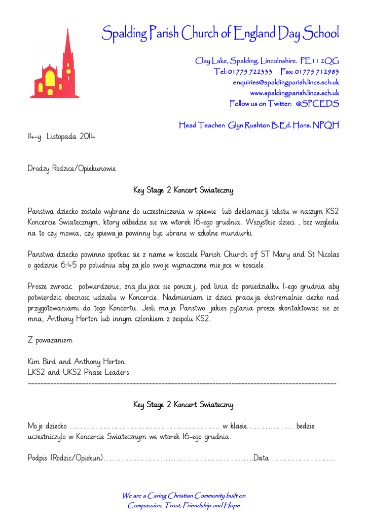 Spalding Parish Church of England Day School Clay Lake, Spalding. Lincolnshire. PE11 2QG Tel: 01775 722333 Fax: 01775 712983 [email protected] www.spaldingparish.lincs.sch.uk Follow us on on Twitter: @SPCEDS Head Teacher: Teacher: Glyn Rushton Rushton B.Ed. Hons. NPQH 14-y Listopada 2014 Drodzy Rodzice/Opiekunowie Key Stage 2 Koncert Swiateczny Panstwa dziecko zostalo wybrane do uczestniczenia w spiewie lub deklamacji tekstu w naszym KS2 Koncercie Swiatecznym, ktory odbedzie sie we wtorek 16-ego grudnia. Wszystkie dzieci , bez wzgledu na to czy mowia, czy spiewaja powinny byc ubrane w szkolne mundurki. Panstwa dziecko powinno spotkac sie z name w kosciele Parish Church of ST Mary and St Nicolas o godzinie 6:45 po poludniu aby zajelo swoje wyznaczone miejsce w kosciele. Prosze zwrocic potwierdzenie, znajdujace sie ponizej, pod linia do poniedzialku 1-ego grudnia aby potwierdzic obecnosc udzialu w Koncercie. Nadmieniam iz dzieci pracuja ekstremalnie ciezko nad przygotowaniami do tego Koncertu. Jesli maja Panstwo jakies pytania prosze skontaktowac sie ze mna, Anthony Horton lub innym czlonkiem z zespolu KS2. Z powazaniem Kim Bird and Anthony Horton LKS2 and UKS2 Phase Leaders ------------------------------------------------------------------------------------------------Key Stage 2 Koncert Swiateczny Moje dziecko …………………………………………………. w klasie……………… bedzie uczestniczylo w Koncercie Swiatecznym we wtorek 16-ego grudnia. Podpis (Rodzic/Opiekun)………………………………………………….Data…………………….. We are a Caring Christian Community built on Compassion, Trust, Friendship and Hope