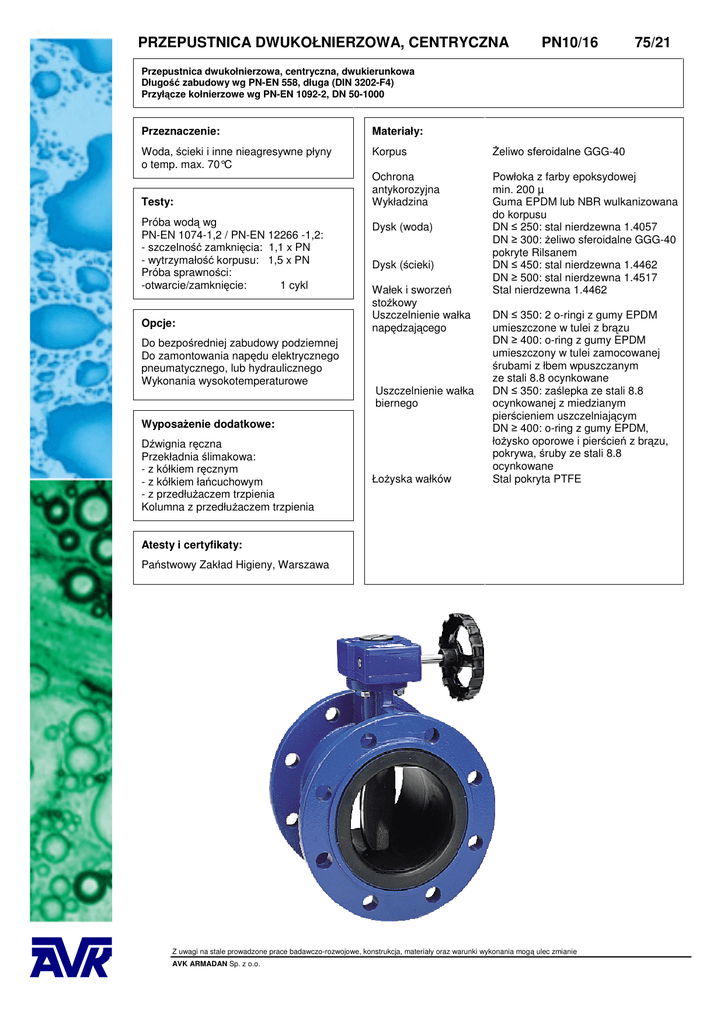 PRZEPUSTNICA DWUKOŁNIERZOWA, CENTRYCZNA PN10/16 75/21 Przepustnica dwukołnierzowa, centryczna, dwukierunkowa Długość zabudowy wg PN-EN 558, długa (DIN 3202-F4) Przyłącze kołnierzowe wg PN-EN 1092-2, DN 50-1000 Przeznaczenie: Materiały: Woda, ścieki i inne nieagresywne płyny o temp. max. 70°C Korpus Żeliwo sferoidalne GGG-40 Ochrona antykorozyjna Wykładzina Powłoka z farby epoksydowej min. 200 µ Guma EPDM lub NBR wulkanizowana do korpusu DN ≤ 250: stal nierdzewna 1.4057 DN ≥ 300: żeliwo sferoidalne GGG-40 pokryte Rilsanem DN ≤ 450: stal nierdzewna 1.4462 DN ≥ 500: stal nierdzewna 1.4517 Stal nierdzewna 1.4462 Testy: Próba wodą wg PN-EN 1074-1,2 / PN-EN 12266 -1,2: - szczelność zamknięcia: 1,1 x PN - wytrzymałość korpusu: 1,5 x PN Próba sprawności: -otwarcie/zamknięcie: 1 cykl Opcje: Do bezpośredniej zabudowy podziemnej Do zamontowania napędu elektrycznego pneumatycznego, lub hydraulicznego Wykonania wysokotemperaturowe Dysk (woda) Dysk (ścieki) Wałek i sworzeń stożkowy Uszczelnienie wałka napędzającego Uszczelnienie wałka biernego Wyposażenie dodatkowe: Dźwignia ręczna Przekładnia ślimakowa: - z kółkiem ręcznym - z kółkiem łańcuchowym - z przedłużaczem trzpienia Kolumna z przedłużaczem trzpienia Łożyska wałków DN ≤ 350: 2 o-ringi z gumy EPDM umieszczone w tulei z brązu DN ≥ 400: o-ring z gumy EPDM umieszczony w tulei zamocowanej śrubami z łbem wpuszczanym ze stali 8.8 ocynkowane DN ≤ 350: zaślepka ze stali 8.8 ocynkowanej z miedzianym pierścieniem uszczelniającym DN ≥ 400: o-ring z gumy EPDM, łożysko oporowe i pierścień z brązu, pokrywa, śruby ze stali 8.8 ocynkowane Stal pokryta PTFE Atesty i certyfikaty: Państwowy Zakład Higieny, Warszawa Z uwagi na stale prowadzone prace badawczo-rozwojowe, konstrukcja, materiały oraz warunki wykonania mogą ulec zmianie AVK ARMADAN Sp. z o.o. PRZEPUSTNICA DWUKOŁNIERZOWA, CENTRYCZNA PN10/16 75/21 Przepustnica dwukołnierzowa, centryczna, dwukierunkowa Długość zabudowy wg PN-EN 558, długa (DIN 3202-F4) Przyłącze kołnierzowe wg PN-EN 1092-2, DN 50-1000 Wykaz elementów budowy: 1. Wałek napędzający 2.Tuleja 3.O-ring 4. Korpus 5. Łożysko ślizgowe 6.Sworzeń stożkowy 7. Dysk 8. Wałek bierny 9. Wykładzina 10. Łożysko ślizgowe 11. Pierścień uszczelniający 12. Zaślepka 13. Śruba 14. Pierścień 15. O-ring 16. Łożysko oporowe 17. Pokrywa 18. Śruba ds Górny kołnierz Nr kat. 75-0050-21-201005600000 75-0065-21-201005600000 75-0080-21-201005600000 75-0100-21-201005600000 75-0125-21-201005600000 75-0150-21-201005600000 75-0200-21-201001300000 75-0250-21-201001300000 75-0300-21-205101300000 75-0350-21-205101300000 75-0400-21-205101300000 75-0450-21-205101300000 75-0500-21-205101300000 75-0600-21-205101300000 75-0700-21-205101300000 75-0800-21-205101300000 75-0900-21-205101300000 75-1000-21-205101300000 75-1200-21-205101300000 Większe średnice na zapytanie DN 50 65 80 100 125 150 200 250 300 350 400 450 500 600 700 800 900 1000 1200 A mm 50 65 80 100 125 150 200 250 300 336 386 436 486 586 686 786 886 986 1186 C mm 150 170 180 190 200 210 230 250 270 290 310 330 350 390 430 470 510 550 630 D mm 63 71 78 96 109 133 158 194 219 256 308 334 360 426 480 525 635 685 870 E mm 118 126 133 147 160 180 204 245 270 315 363 388 413 510 560 610 690 740 855 F mm 12 12 12 12 12 14 14 15 15 15 25 25 25 25 25 25 30 30 35 G mm 34 34 34 34 34 34 34 45 45 45 50 50 50 50 60 60 90 90 85 H mm 10 10 10 12 12 16 16 24 24 24 30 30 30 40 46 46 60 60 75 J mm 18 18 18 22 22 30 30 38 38 38 90 90 90 100 110 110 130 130 150 K mm 70 70 70 70 70 70 70 102 102 102 140 140 140 140 165 165 254 254 298 L mm 90 90 90 90 90 90 90 125 125 125 175 175 175 175 210 210 300 300 415 ds mm 9 9 9 9 9 9 9 11 11 11 17 17 17 17 21 21 17 17 21 otwory 4 4 4 4 4 4 4 4 4 4 4 4 4 4 4 4 4 8 8 ISO 5211 F07 F07 F07 F07 F07 F07 F07 F10 F10 F10 F14 F14 F14 F14 F16 F16 F25 F25 F30 Waga kg/szt. 10,6 12,5 17 20 26 31 45 70 90 120 165 200 230 320 420 610 820 1130 1600