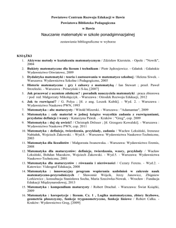 Powiatowe Centrum Rozwoju Edukacji w Iławie Powiatowa Biblioteka Pedagogiczna w Iławie Nauczanie matematyki w szkole ponadgimnazjalnej zestawienie bibliograficzne w wyborze KSIĄŻKI 1. Aktywne metody w kształceniu matematycznym / Zdzisław Kierstein. - Opole : "Nowik", 2004 2. Bukiety matematyczne dla liceum i technikum / Piotr Jędrzejewicz. - Gdańsk : Gdańskie Wydawnictwo Oświatowe, 2009 3. Dydaktyka matematyki : teoria i zastosowania w matematyce szkolnej / Helena Siwek. Warszawa: Wydawnictwa Szkolne i Pedagogiczne, 2005 4. Histerie matematyczne : gry i zabawy z matematyką / Ian Stewart ; przeł. Paweł Strzelecki. - Warszawa : Prószyński i S-ka, [2007] 5. Jak pracować z uczniem zdolnym? : poradnik nauczyciela matematyki : praca zbiorowa / pod red. Małgorzaty Mikołajczyk. - Warszawa : Ośrodek Rozwoju Edukacji, 2012 6. Jak to rozwiązać? / G. Polya ; [tł. z ang. Leszek Kubik]. - Wyd. 2. - Warszawa : Wydawnictwo Naukowe PWN, 1993 7. Matematyka : abc maturzysty / Witold Mizerski. - Warszawa : "Adamantan", 2009 8. Matematyka : cały materiał w jednej książce wszystkie zadania z rozwiązaniami, przydatne definicje i wzory / Katarzyna Piórek . - Kraków : "Greg", cop. 2009 9. Matematyka : daj się uwieść! / Christoph Drösser ; [tł. Grzegorz Kowalski]. - Warszawa : Wydawnictwo Naukowe PWN, cop. 2011 10. Matematyka : definicje, twierdzenia, przykłady, zadania / Wacław Leksiński, Ireneusz Nabiałek, Wojciech Żakowski. - Wyd.8. - Warszawa: Wydawnictwa Naukowo-Techniczne, 2003 11. Matematyka dla licealistów / Małgorzata Iwanowska. - Warszawa: Wydawnictwo Eremis, 2008 12. Matematyka dla maturzystów: definicje, twierdzenia, wzory, przykłady / Wacław Leksiński, Bohdan Macukow, Wojciech Żakowski. - Wyd.5. - Warszawa: Wydawnictwa Naukowo-Techniczne, 2001 13. Matematyka dla maturzystów : równania i nierówności / Cezary Ferens. - Wyd.2. Katowice: Videograf Edukacja, 2008 14. Matematyka : innowacyjny program wspierania uzdolnień w zakresie nauk matematyczno-przyrodniczych / Sławomir Wójcik, Jerzy Janowicz, Zbigniew Lorkiewicz ; konsultacja Stanisława Socha, Maria Szecówka-Nowak. - Wrocław : Fundacja Edukacji Międzynarodowej, 2013 15. Matematyka : kompendium maturzysty / Robert Drachal. - Warszawa: Świat Książki, 2009 16. Matematyka : korepetycje : liceum. Cz. 1 , Logika matematyczna, zbiory liczbowe, geometria płaszczyzny, funkcje trygonometryczne, funkcje liniowe / Robert Całka. Kraków: Wydawnictwo Greg, [2009] 17. Matematyka : korepetycje : liceum. Cz. 2 , Funkcje kwadratowe, funkcje wymierne, 18. 19. 20. 21. 22. 23. 24. 25. 26. 27. 28. 29. 30. 31. 32. 33. 34. 35. 36. 37. funkcje wielomianowe, funkcje trygonometryczne, ciągi liczbowe, twierdzenia sinusów i cosinusów / Robert Całka. - Kraków: Wydawnictwo Greg, [2009] Matematyka : korepetycje : liceum. Cz. 3 , Funkcja wykładnicza i logarytmiczna, kombinatoryka, rachunek prawdopodobieństwa, statystyka, stereometria / Robert Całka. - Kraków: Wydawnictwo Greg, [2009] Matematyka : próbne arkusze maturalne : poziom rozszerzony / Elżbieta Świda, Elżbieta Kurczab, Marcin Kurczab. - Warszawa: Oficyna Edukacyjna Krzysztof Pazdro, 2009 Matematyka : rachunek prawdopodobieństwa nie tylko dla orłów / Przemysław Butryn. - Kraków: Wydawnictwo Szkolne Omega, 2004 Matematyka : repetytorium od A do Z : matura / Janusz Karkut. - Warszawa : "Kram", 2008 Matematyka : tydzień po tygodniu do matury : poziom podstawowy / Anna Kukla, Marceli Piekarz, Małgorzata Waśniowska. - Kraków: Wydawnictwo Zielona Sowa, 2009 Matematyka : vademecum / Robert Całka [i in.]. - Kraków: Wydawnictwo Greg, [2009?] Matematyka : zbiór zadań maturalnych z rozwiązaniami : poziom podstawowy / Janusz Karkut, Waldemar Karpiński. - Warszawa : "Kram", 2008 Matura: zbiór zadań. Cz.1 / Alicja Cewe, Halina Nahorska. - Wyd. 3 rozszerz. - Gdańsk: „Podkowa”, 1998 Matura: zbiór zadań. Cz.2 / Alicja Cewe, Czesław Grajek, Halina Nahorska. - Wyd. 2 rozszerz. - Gdańsk: „Podkowa”, 1997 Podstawa programowa z komentarzami. T. 6 , Edukacja matematyczna i techniczna w szkole podstawowej, gimnazjum i liceum : matematyka, zajęcia techniczne, zajęcia komputerowe, informatyka / oprac. zespół red. Zbigniew Semadeni [i in.]. - Warszawa : Ministerstwo Edukacji Narodowej, [2009] Podstawy nauczania matematyki, czyli jak przybliżyć matematykę uczniom / Danuta Zaremba. - Warszawa: Wydawnictwa Naukowo-Techniczne, 2006 Rozwiąż przez analogię : zbiór zadań z matematyki : zakres podstawowy i rozszerzony : praca zbiorowa / pod kierunkiem Katarzyny Sikory. - Opole : "Nowik", 2006 Sposób na maturę : matematyka / Piotr Ludwikowski. - Kraków: Wydawnictwo Szkolne Omega, 2008 Sto zadań / Hugo Steinhaus. - Warszawa : "DiP", 1993 Szczęśliwy X : matematyka na co dzień / Steven Strogatz ; tł. Wiktor Bartol. - Warszawa : Dom Wydawniczy PWN, 2014 Tajemnicza liczba e i inne sekrety matematyki / Bogdan Miś. - Warszawa : Wydawnictwa Naukowo-Techniczne, 1989 Wybrane metody i techniki aktywizujące : zastosowania w procesie nauczania i uczenia się matematyki / Maria Wójcicka. - Warszawa: „Fraszka Edukacyjna”, 2005 Zadania z matematyki dla olimpijczyków – gimnazjalistów i licealistów / Henryk Pawłowski, Wojciech Tomalczyk. - Wyd. 2 rozszerz. i popr. - Toruń: „Tutor”, 2000 Zbiór zadań maturalnych z rozwiązaniami: matematyka / Przemysław Butryn. Kraków: Wydawnictwo Szkolne Omega, 2003 Zbiór zadań z kombinatoryki i rachunku prawdopodobieństwa / Jerzy Ligman, Edward Stachowski, Anna Zalewska. - Warszawa : "Adam", 1994 2 ARTYKUŁY Z CZASOPISM 1. Algorytmy / Honorata Marks // Matematyka. - 2005, nr 2, s. 30-32 2. Bez pochodnej! / Edward Orzechowski // Matematyka. - 2009, nr 7, s. 424-428 3. Ciąg arytmetyczny a funkcja liniowa i kwadratowa / Monika Bolanowska, Ewa Szewczuk // Matematyka. - 2008, nr 7, s. 415-423; nr 8, s. 468-478; nr 9, s. 533-542 4. Ćwiczenia geometryczne przed maturą : trójkąty / Monika Bolanowska //