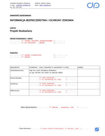 architekt Arkadiusz Zubowicz Gdańsk, Gdynia, Sopot e-mail : [email protected] www : dom-projekty.pl tel: 501 799 240 zawartość opracowania INFORMACJA BEZPIECZEŃSTWA I OCHRONY ZDROWIA zakres Projekt Budowlany obiekt budowlany i adres . . . . . (* nazwa obiektu budowlanego ). . . . . . . . . . (* nr działki obręb ). . . . . Inwestor . . . . . (* nazwa inwestora . . . . . (* adres ). . . . . , ). . . . . Specjalność Projektant - imię i nazwisko nr uprawnień i nr izby Architektoniczna mgr inż. arch. Arkadiusz Zubowicz podpis nr upr. PO/KK/167/2007 nr izby PO-0909 Konstrukcyjna . . . . . (* imię nazwisko . . . . . (* nr uprawnień nr izby ). . . . . ). . . . . Sanitarna . . . . . (* imię nazwisko . . . . . (* nr uprawnień nr izby ). . . . . ). . . . . Elektryczna . . . . . (* imię nazwisko . . . . . (* nr uprawnień nr izby ). . . . . ). . . . . data opracowania :. . . . . (* dzień , miesiąc rok ). . . . . Projekt Budowlany . . . . . (* nazwa obiektu budowlanego, nr działki, data ). . . . . architekt Arkadiusz Zubowicz Gdańsk, Gdynia, Sopot e-mail : [email protected] www : dom-projekty.pl tel: 501 799 240 punkt 1. Zakres robót i kolejność realizacji obiektów. Zakres robót budowlanych obejmuje budowę obiektu budowlanego : . . . . . (* nazwa obiektu budowlanego ). . . . . . . . . . (* nr działki obręb ). . . . . , Przewiduje się następującą kolejność realizacji obiektów : - . . . . . (* obiekt nr 1 ) . . . . . - . . . . . (* obiekt następny ) . . . . . Dopuszcza się ustalenie końcowej kolejności realizacji obiektów przez kierownika budowy. punkt 2. Wykaz istniejących obiektów budowlanych Obiekty istniejące na terenie działki to : . . . . . (* obiekt istniejący Obiekty istniejące na działkach sąsiednich to : . . . . . (* obiekt istniejący ) . . . . . ) . . . . . punkt 3. Elementy zagospodarowania działki lub terenu mogące stwarzać zagrożenie bezpieczeństwa i zdrowia ludzi. Elementy zagospodarowania działki, które mogą stwarzać zagrożenie : - . . . . . (* element zagrożenia nr 1 ) . . . . . - . . . . . (* element następny ) . . . . . punkt 4. Przewidywane zagrożenia podczas realizacji robót, skala i rodzaje zagrożeń. Zagrożenia mogące wystąpić podczas realizacji robót wg R.M.I. dz.120 z 23/06/2003 : . . . . . (* niepotrzebne zagrożenia skrerślić ! ! ! ) . . . . . 1) roboty budowlane, stwarzające zagrożenie przysypania ziemią lub upadku z wysokości : a. wykonywania wykopów o ścianach pionowych większej niż 1,5m oraz przy nachyleniu większym niż 3,0m; b. roboty z ryzykiem upadku z wysokości 5,0m; c. rozbiórki obiektów budowlanych o wysokości powyżej 8,0m; d. na terenie zakładów przemysłowych; e. montaż, demontaż i konserwacja rusztowań przy budynkach wysokich i wysokościowych; f. przy użyciu dźwigów lub śmigłowców; g. na obiektach mostowych metodą nasuwania; h. montażowe elementów konstrukcji mostowych; i. betonowania wysokich elementów konstrukcji jak mosty, przyczółki, filary i pylony; j. fundamentowania podpór mostowych i innych obiektów budowlanych na palach; k. w pobliżu linii elektroenergetycznych w odległościach mniejszych niż 3,0m dla 1 kV i odpowiednio 5m-15kV, 10m-30kV 15-110kV l. w portach i przystanich podczas ruchu statków; m. przy budowlach piętrzących wodę przy wysokości piętrzenia powyżej 1,0m, n. wykonywane w pobliżu linii kolejowej; Projekt Budowlany . . . . . (* nazwa obiektu budowlanego, nr działki, data ). . . . . architekt Arkadiusz Zubowicz Gdańsk, Gdynia, Sopot e-mail : [email protected] www : dom-projekty.pl tel: 501 799 240 2) roboty budowlane gdzie występują dzałania substancji chemicznych lub biologicznych : a. roboty prowadzone poniżej 10 'C; b. roboty przy wyrobach zawierających azbest; 3) roboty zagrożone promieniowaniem jonizującym : a. roboty w przemyśle energii atomowej; b. roboty przy obiektach realizowanych przy użyciu izotopów; 4) roboty budowlane w pobliżu linii wysokiego napięcia lub linii komunikacyjnych : a. w odległości mniejszej niż 15,0m do linii110kV b. w odległości mniejszej niż 30,0m od linii 110kV c. budowa i remont : - linii kolejowych, - sieci trakcyjnej i linii zasilającej sieci trakcyjnej i urządzeń elektroroenergetycznych, - linii i urządzeń sterowania ruchem kolejowym; - sieci telekomunikacyjnych, radiotelekomunikacyjnych i komputerowych; d. roboty wykonywane na obszarze kolejowym w warunkach ruchu kolejowego; 5) roboty budowlane stwarzające ryzyko utonięcia pracowników : a. roboty prowadzone z wody lub pod wodą ; b. montaż elementów konstrukcji obiektów mostowych; c. funndamenttowanie podpór mostowych i innych obiektów na palach; d. roboty prowadzone przy budowlach piętrzących wodę powyżej 1,0m; 6) robót budowlanych prowadzonych w studniach, pod ziemią i w tunelach : a. roboty prowadzone w zbiornikach, kanałach, we wnętrzach urządzeń technicznych i innych zamkniętych; b. roboty związane z przejściem rurociągów pod przeszkodami metodami : tunelową, przecisku lub podobnymi; 7) roboty wykonywane pojazdami zasilanymi z linii napowietrznych - roboty przy budowie, remoncie i rozbiórce torowisk; 8) roboty budowlane w kesonach - przy nabrzeżach portowych i przepraw mostowych; 9) roboty budowlane z użyciem materiałów wybuchowych : a. roboty ziemne przemieszczenia lub zagęszczenienie gruntu; b. roboty rozbiórkowe, także wykonywanie otworów w elementach istniejących; 10) roboty budowlane montażu i demonntażu elementów, których waga przekracza 1000kg; O pozostałych robotach mogących stanowić zagrożenie zadecyduje kierownik budowy. Projekt Budowlany . . . . . (* nazwa obiektu budowlanego, nr działki, data ). . . . . architekt Arkadiusz Zubowicz Gdańsk, Gdynia, Sopot e-mail : [email protected] www : dom-projekty.pl tel: 501 799 240 punkt 5. Sposób prowadzenia instruktażu pracowników przed przystąpieniem do realizacji robót szczególnie niebezpiecznych. Wszystkie prac