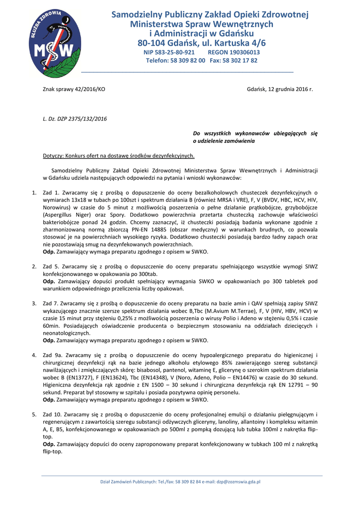 Samodzielny Publiczny Zakład Opieki Zdrowotnej Ministerstwa Spraw Wewnętrznych i Administracji w Gdańsku 80-104 Gdańsk, ul. Kartuska 4/6 NIP 583-25-80-921 REGON 190306013 Telefon: 58 309 82 00 Fax: 58 302 17 82 _______________________________________________________________ Znak sprawy 42/2016/KO Gdańsk, 12 grudnia 2016 r. L. Dz. DZP 2375/132/2016 Do wszystkich wykonawców ubiegających się o udzielenie zamówienia Dotyczy: Konkurs ofert na dostawę środków dezynfekcyjnych. Samodzielny Publiczny Zakład Opieki Zdrowotnej Ministerstwa Spraw Wewnętrznych i Administracji w Gdańsku udziela następujących odpowiedzi na pytania i wnioski wykonawców: 1. Zad 1. Zwracamy się z prośbą o dopuszczenie do oceny bezalkoholowych chusteczek dezynfekcyjnych o wymiarach 13x18 w tubach po 100szt i spektrum działania B (również MRSA i VRE), F, V (BVDV, HBC, HCV, HIV, Norowirus) w czasie do 5 minut z możliwością poszerzenia o pełne działanie prątkobójcze, grzybobójcze (Aspergillus Niger) oraz Spory. Dodatkowo powierzchnia przetarta chusteczką zachowuje właściwości bakteriobójcze ponad 24 godzin. Chcemy zaznaczyć, iż chusteczki posiadają badania wykonane zgodnie z zharmonizowaną normą zbiorczą PN-EN 14885 (obszar medyczny) w warunkach brudnych, co pozwala stosować je na powierzchniach wysokiego ryzyka. Dodatkowo chusteczki posiadają bardzo ładny zapach oraz nie pozostawiają smug na dezynfekowanych powierzchniach. Odp. Zamawiający wymaga preparatu zgodnego z opisem w SWKO. 2. Zad 5. Zwracamy się z prośbą o dopuszczenie do oceny preparatu spełniającego wszystkie wymogi SIWZ konfekcjonowanego w opakowania po 300tab. Odp. Zamawiający dopuści produkt spełniający wymagania SWKO w opakowaniach po 300 tabletek pod warunkiem odpowiedniego przeliczenia liczby opakowań. 3. Zad 7. Zwracamy się z prośbą o dopuszczenie do oceny preparatu na bazie amin i QAV spełniają zapisy SIWZ wykazującego znacznie szersze spektrum działania wobec B,Tbc (M.Avium M.Terrae), F, V (HIV, HBV, HCV) w czasie 15 minut przy stężeniu 0,25% z możliwością poszerzenia o wirusy Polio i Adeno w stężeniu 0,5% i czasie 60min. Posiadających oświadczenie producenta o bezpiecznym stosowaniu na oddziałach dziecięcych i neonatologicznych. Odp. Zamawiający wymaga preparatu zgodnego z opisem w SWKO. 4. Zad 9a. Zwracamy się z prośbą o dopuszczenie do oceny hypoalergicznego preparatu do higienicznej i chirurgicznej dezynfekcji rąk na bazie jednego alkoholu etylowego 85% zawierającego szereg substancji nawilżających i zmiękczających skórę: bisabosol, pantenol, witaminę E, glicerynę o szerokim spektrum działania wobec B (EN13727), F (EN13624), Tbc (EN14348), V (Noro, Adeno, Polio – EN14476) w czasie do 30 sekund. Higieniczna dezynfekcja rąk zgodnie z EN 1500 – 30 sekund i chirurgiczna dezynfekcja rąk EN 12791 – 90 sekund. Preparat był stosowny w szpitalu i posiada pozytywna opinię personelu. Odp. Zamawiający wymaga preparatu zgodnego z opisem w SWKO. 5. Zad 10. Zwracamy się z prośbą o dopuszczenie do oceny profesjonalnej emulsji o działaniu pielęgnującym i regenerującym z zawartością szeregu substancji odżywczych gliceryny, lanoliny, allantoiny i kompleksu witamin A, E, B5, konfekcjonowanego w opakowaniach po 500ml z pompką dozującą lub tubka 100ml z nakrętka fliptop. Odp. Zamawiający dopuści do oceny zaproponowany preparat konfekcjonowany w tubkach 100 ml z nakrętką flip-top. Dział Zamówień Publicznych: Tel./fax: 58 309 82 84 e-mail: [email protected] 2|S t r o n a 6. Zad 12. Zwracamy się z prośbą o dopuszczenie do oceny preparatu spełniającego wszystkie wymogi SIWZ na bazie alkoholu etylowego i 2% chlorheksydyny. Odp. Zamawiający wymaga preparatu zgodnego z opisem w SWKO. 7. Zad 13. Zwracamy się z prośbą o dopuszczenie do oceny preparatu dezynfekującego spełniającego wszystkie zapisy SIWZ na bazie chlorku benzalkonium i konserwantu spożywczego E231 o lepszych parametrach dezynfekcyjnych wykazującego działanie bakteriobójcze (EN 14561),prątkobójcze (EN 14563), pełne grzybobójcze (candida, Aspergillus)(EN 13624, EN 14562) oraz BVDV, HBC, HIV,HCV, Vaccinia w czasie do 15 minut w stężeniu 0,5% z możliwością poszerzenia o wirusy Rota, Noro, Adeno i Polio. Badania wykonane w warunkach brudnych zgodnie z zharmonizowaną normą zbiorczą PN-EN 14885. Jedynie preparaty przebadane w takich warunkach gwarantują skuteczne działanie w warunkach praktycznych. Odp. Zamawiający wymaga preparatu zgodnego z opisem w SWKO. 8. Zad 16. Zwracamy się z prośbą o dopuszczenie do oceny alkoholowego preparatu spełniającego wszystkie zapisy SIWZ na bazie jednego alkoholu etylowego w stężeniu 72g o szerokim spektrum bójczym wobec: B,F,Tbc,V (BVDV,HCV,HBV,HIV,Vaccinia,Rota,Noro, Adeno) w czasie do 30 sekund. Dodatkowo chcemy podkreślić, iż preparat nie jest sklasyfikowany jako substancja drażniąca, w związku z tym jest bardzo dobrze tolerowany przez personel. Posiadającego opinię kliniczną szpitala dziecięcego oraz oświadczenie producenta o możliwości stosowania na oddziałach neonatologicznych oraz pediatrycznych. Odp. Zamawiający wymaga preparatu zgodnego z opisem w SWKO. 9. Zad 17. Zwracamy się z prośbą o dopuszczenie do oceny bezalkoholowego preparatu w postaci aktywnej pianki o spektrum działania B(również MRSA i VRE), F, V (BVDV, HBC, HCV, HIV, Norowirus) w czasie do 5 minut z możliwością poszerzenia o pełne działanie grzybobójcze (Aspergillus Niger) oraz Spory. Dodatkowo dezynfekowana powierzchnia zachowuje właściwości bakteriobójcze ponad 24 godzin. Chcemy zaznaczyć, iż preparat posiadają badania wykonane zgodnie z zharmonizowaną normą zbiorczą PN-EN 14885 (obszar medyczny) w warunkach brudnych, co pozwala zastosować go na powierzchniach wysokiego ryzyka. Konfekcjonowanego w opakowania 500ml. Dodatkowo środek posiada bardzo ładny zapach oraz nie pozostawia smug na dezynfekowanych powierzchniach.