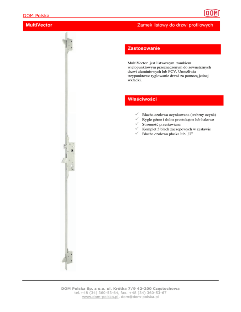 DOM Polska MultiVector Zamek listowy do drzwi profilowych Zastosowanie MultiVector jest listwowym zamkiem wielopunktowym przeznaczonym do zewnętrznych drzwi aluminiowych lub PCV. Umożliwia trzypunktowe ryglowanie drzwi za pomocą jednej wkładki. Właściwości Blacha czołowa ocynkowana (srebrny ocynk) Rygle górne i dolne prostokątne lub hakowe Stronność przestawiana Komplet 3 blach zaczepowych w zestawie Blacha czołowa płaska lub „U” DOM Polska Sp. z o.o. ul. Krótka 7/9 42-200 Częstochowa tel.+48 (34) 360-53-64, fax. +48 (34) 360-53-67 www.dom-polska.pl, [email protected] DOM Polska MultiVector Zamek listowy do drzwi profilowych Wymiary DOM Polska Sp. z o.o. ul. Krótka 7/9 42-200 Częstochowa tel.+48 (34) 360-53-64, fax. +48 (34) 360-53-67 www.dom-polska.pl, [email protected]