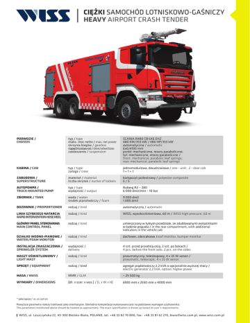 CIĘŻKI SAMOCHÓD LOTNISKOWO-GAŚNICZY HEAVY AIRPORT CRASH TENDER PODWOZIE / CHASSIS typ / type maks. moc netto / max. net power skrzynia biegów / gearbox napęd/rozstaw osi / drive/wheel base zawieszenie / suspension SCANIA R480 CB 6X6 EHZ 480 KM/353 kW / 480 HP/353 kW automatyczna / automatic 6x6/4100 mm przód: mechaniczne, resory paraboliczne; tył: mechaniczne, resory paraboliczne / front: mechanical, parabolic leaf springs; rear: mechanical, parabolic leaf springs KABINA / CAB typ / type załoga / crew jednomodułowa, dwudrzwiowa / one - unit , 2 - door cab 1+1+1 ZABUDOWA / SUPERSTRUCTURE materiał / material liczba skrytek / numer of lockers kompozyt poliestrowy / polyester composite 5/5 AUTOPOMPA / TRUCK-MOUNTED PUMP typ / type wydajność / output Ruberg R2 – 280 6 000 dm3/min – 10 bar ZBIORNIK / TANK woda / water środek pianotwórczy / foam 9 000 dm3 1 000 dm3 DOZOWNIK / PROPORTIONER rodzaj / kind automatyczny / automatic LINIA SZYBKIEGO NATARCIA RAPID INTERVENTION HOSE REEL rodzaj / kind WISS, wysokociśnieniowa, 60 m / WISS high pressure, 60 m GŁÓWNY PANEL STEROWANIA MAIN CONTROL PANEL rodzaj / kind umieszczony w tylnym przedziale, ze zdublowanymi wskaźnikami w kabinie pojazdu / in the rear compartment, with additional indicators in the vehicle cab DZIAŁKO WODNO-PIANOWE / WATER/FOAM MONITOR rodzaj / kind dachowe, zderzakowe /roof monitor, bumper monitor INSTALACJA ZRASZACZOWA / SPRINKLER SYSTEM wydajność / delivery 4 szt. przed przednią osią, 2 szt. po bokach / 4 pcs. before the front axle, 2 pcs. on the sides MASZT OŚWIETLENIOWY / LIGHT MAST rodzaj / kind pneumatyczny, teleskopowy, 4 x 35 W xenon / pneumatic, telescopic, 4 x 35 W xenon SPRZĘT / EQUIPMENT rodzaj / kind agregat prądotwórczy 2,2 kVA o opcjonalnie wyższej mocy / electric generator 2,2 kVA, option: higher power MASA / MASS MMR / GLM ~ 25 500 kg WYMIARY / DIMENSIONS [dł. x szer. x wys.] / [L x W x H] 6930 mm x 2550 mm x 4000 mm * jako opcja / as an option Powyższe parametry należy traktować jako orientacyjne. Dokładna kompletacja wykonywana jest na podstawie wymagań użytkownika. The parameters mentioned above should be treated as approximate. The exact specification is drwan up based on user’s requirements. WISS, ul. Leszczyńska 22, 43-300 Bielsko-Biała, POLAND, tel. +48 33 82 70 800, fax: +48 33 81 62 270, [email protected], www.wiss.com.pl CIĘŻKI SAMOCHÓD LOTNISKOWO-GAŚNICZY HEAVY AIRPORT CRASH TENDER ISO 9001:2008 WYDANE PRZEZ BUREAU VERITAS CERTIFICATION, CO OZNACZA, ŻE PRACAUJEMY ZGODNIE Z POWYŻSZYMI STANDARDAMI. ISSUEAD BY BUREAU VERITAS CERTIFICATION, CONFIRMING THAT WE WORK IN ACCORDANCE WITH THE ABOVE STANDARDS. ISO 14001:2004 WYDANE PRZEZ BUREAU VERITAS CERTIFICATION, CO OZNACZA, ŻE PRACAUJEMY ZGODNIE Z POWYŻSZYMI STANDARDAMI. ISSUEAD BY BUREAU VERITAS CERTIFICATION, CONFIRMING THAT WE WORK IN ACCORDANCE WITH THE ABOVE STANDARDS. www.facebook.com/isswawrzaszek GRUPA WISS / WISS GROUP WISS F. M. „Bumar - Koszalin” W. RUBERG AB WISS GmbH WISS CZECH, s.r.o. POLSKA / POLAND 43-300 Bielsko-Biała, ul. Leszczyńska 22 tel. +48 33 82 70 800 [email protected] www.wiss.com.pl POLSKA / POLAND 75-842 Koszalin, ul. Lechicka 51 tel. +48 94 342 20 35÷39 [email protected] www.bumar.pl SZWECJA / SWEDEN 289 73 IMMELN, Skarviksvägen 13 tel. +46 44 20 27 50 [email protected] www.ruberg.se NIEMCY / GERMANY 63303 Dreieich, Im Steingrund 3 tel. +49 6103 995 04 15 [email protected] www.wiss-deutschland.de CZECHY / CZECH REPUBLIC 763 63 Halenkovice Halenkovice č.p. 10, tel. +420 608 180 668 [email protected] www.wiss.cz