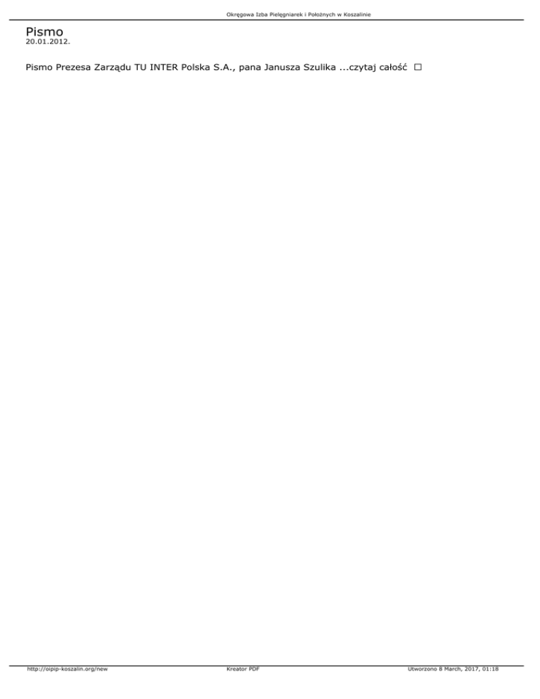 Okręgowa Izba Pielęgniarek i Położnych w Koszalinie Pismo 20.01.2012. Pismo Prezesa Zarządu TU INTER Polska S.A., pana Janusza Szulika ...czytaj całość http://oipip-koszalin.org/new Kreator PDF Utworzono 8 March, 2017, 01:18