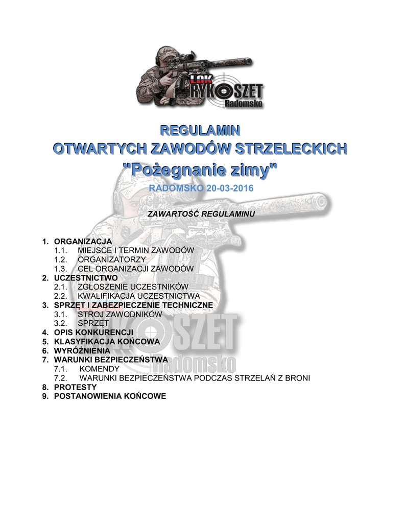 REGULAMIN OTWARTYCH ZAWODÓW STRZELECKICH "Pożegnanie zimy" RADOMSKO 20-03-2016 ZAWARTOŚĆ REGULAMINU 1. ORGANIZACJA 1.1. MIEJSCE I TERMIN ZAWODÓW 1.2. ORGANIZATORZY 1.3. CEL ORGANIZACJI ZAWODÓW 2. UCZESTNICTWO 2.1. ZGŁOSZENIE UCZESTNIKÓW 2.2. KWALIFIKACJA UCZESTNICTWA 3. SPRZĘT I ZABEZPIECZENIE TECHNICZNE 3.1. STROJ ZAWODNIKÓW 3.2. SPRZĘT 4. OPIS KONKURENCJI 5. KLASYFIKACJA KOŃCOWA 6. WYRÓŻNIENIA 7. WARUNKI BEZPIECZEŃSTWA 7.1. KOMENDY 7.2. WARUNKI BEZPIECZEŃSTWA PODCZAS STRZELAŃ Z BRONI 8. PROTESTY 9. POSTANOWIENIA KOŃCOWE 1. ORGANIZACJA 1.1. MIEJSCE I TERMIN ZAWODÓW Zawody odbędą się na terenie strzelnicy sportowej LOK w Radomsku w dniu 20 marca 2016 roku. Rozpoczęcie zawodów o godz. 10.00. (Biuro zawodów czynne od godz. 9.30). szczegółowy harmonogram zawodów organizator ogłosi najpóźniej na 24 godz. przed rozpoczęciem zawodów. 1.2. ORGANIZATORZY Organizatorem zawodów jest: Klub Strzelecki "Rykoszet" LOK w Radomsku 97-500 Radomsko ul. Kościuszki 10 www. rykoszetlok.pl tel. 601527909 Zarząd Rejonowy LOK w Radomsku. 1.3. CEL ORGANIZACJI ZAWODÓW Za główne cele organizatorzy przyjmują: - krzewienie i upowszechnianie strzelectwa sportowego. - popularyzowanie zdrowego stylu życia, - integracja środowiska strzeleckiego, - wyzwolenie sportowej rywalizacji i doskonalenia technicznych z zakresu strzelectwa. umiejętności 2. UCZESTNICTWO 2.1. ZGŁOSZENIE UCZESTNIKÓW - w zawodach mogą wziąć udział osoby, które ukończyły 17 rok życia oraz zgłoszą swój udział w zawodach: a/ do dnia 18.03.2016 roku za pośrednictwem elektronicznego formularza zgłoszeniowego (strona www.rykoszetlok.pl) lub b/ w dniu 20.03.2016 roku i do godziny 13.00 dokonają zgłoszenia ustnego w biurze zawodów i zostaną wpisani na listę startową. Warunkiem wpisania na listę startową jest zapoznanie się z regulaminem zawodów oraz wniesienie opłaty startowej (przed rozpoczęciem danej konkurencji) w wysokości: za pierwszą konkurencję - 30 zł w przypadku strzelania z broni organizatora 20zł w przypadku strzelania z broni własnej str. 2 - każdą następną konkurencję - 20 zł w przypadku strzelania z broni organizatora 15zł w przypadku strzelania z broni własnej – fakt zapoznania się z w/w dokumentami zawodnicy potwierdzają własnoręcznym podpisem złożonym na liście startowej Organizator zastrzega sobie prawo wcześniejszego zamknięcia list startowych w przypadku przekroczenia liczby zgłoszeń. 2.2. KWALIFIKACJA DO UCZESTNICTWA - - W zawodach mogą uczestniczyć zawodnicy posiadający licencję zawodnika sportów strzeleckich, Każdy uczestnik zawodów zobowiązany jest do dbania o pozytywny wizerunek zawodów. W przypadku zachowania mogącego narazić wizerunek imprezy, uczestnik może zostać wykluczony równolegle z ponoszoną przez uczestnika odpowiedzialnością materialną (w przypadku dokonanych zniszczeń), Start kobiet i mężczyzn jest realizowany wspólnie. Wszystkich uczestników obowiązuje stosowanie umownych zasad „fair play” Osoby uczestniczące w Zawodach zobowiązane są do przestrzegania zasad bezpieczeństwa zawartych w pkt. 7 niniejszego regulaminu 3. SPRZĘT I ZABEZPIECZENIE TECHNICZNE 3.1. STRÓJ ZAWODNIKÓW - Każdy zawodnik ma prawo umieszczenia znaku własnego sponsora na stroju, ciele, obuwiu, - Zawodnicy są identyfikowani zgodnie z identyfikatorem startowym lub innych danych identyfikacyjnych ustalonych przez organizatora, - Stosowanie ubrań strzeleckich jest niedozwolone. - Każdy zawodnik na stanowisku strzeleckim zobowiązany jest do używania ochronników słuchu i oczu (okulary). 3.2. SPRZĘT a. Broń i amunicję do konkurencji karabin 5,6 przyrządy mechaniczne (zamknięte i otwarte) zabezpiecza organizator, dopuszcza się możliwość wykorzystywania w tych konkurencjach własnej broni i amunicji odpowiadających warunkom technicznym dla poszczególnych konkurencji po uprzednim powiadomieniu organizatorów zawodu (najpóźniej do chwili rozpoczęcia zawodów) b. konkurencje karabin 5,6LR optyczne przyrządy celownicze rozgrywane są z broni i amunicji własnej zawodników. Dopuszcza się możliwość użyczenie broni przez innego zawodnika. str. 3 4. OPIS KONKURENCJI Warunki strzelań: karabin kal. 5,6LR, przyrządy celownicze mechaniczne, otwarte; - z postawy: leżąc, bez podpórki - dopuszcza się używanie pasa, klęcząc - dopuszcza się używanie wałka strzeleckiego - odległość 50 m , - tarcza Ksp, - stanowisko strzeleckie o wymiarach 2,5 x 2,5 m, - seria oceniana po 10 strzałów z każdej z postaw do 2 tarcz (łącznie 20 strzałów) - seria próbna 3 strzały do tarczy próbnej z dowolnej postawy, czas konkurencji: 15 min( czas strzelań ocenianych wraz z czasem strzelań próbnych) karabin kal. 5,6LR, przyrządy celownicze mechaniczne, zamknięte; - z postawy: leżąc, bez podpórki - dopuszcza się używanie pasa, - odległość 50 m , - tarcza Ksp, - stanowisko strzeleckie o wymiarach 2,5 x 2,5 m, - seria oceniana po 5 strzałów do 2 tarcz (łącznie 10 strzałów) ; - seria próbna 3 strzały do tarczy próbnej , czas konkurencji: 15 min( czas strzelań ocenianych wraz z czasem strzelań próbnych) karabin kal. 5,6LR, optyczne przyrządy celownicze; - z postawy: leżąc - dopuszcza się używanie bipodu lub innej odpory usytuowanej pomiędzy komorą zamkową a wylotem lufy (obowiązuje zakaz używania restów oraz podpór połączonych z sobą); - odległość 100 m , - tarcza z punktacją od 5 do 10 (średnica 5=64mm, 10=14mm, centralny punkt=7mm), - stanowisko strzeleckie o wymiarach 2,5 x 2,5 m, - seria oceniana po 15 strzałów; - seria próbna 3 strzały do tarczy próbnej. czas konkurencji: 15 min( czas strzelań ocenianych wraz z czasem strzelań próbnych) Dopuszcza się rozgrywanie równoległe poszczególnych konkurencji. str. 4 5. KLASYFIKACJA KOŃCOWA O kolejności miejsc w klasyfikacji decyduje suma punktów z przestrzelin (trafień) uzyskanych przez poszczególnych zawodników w d