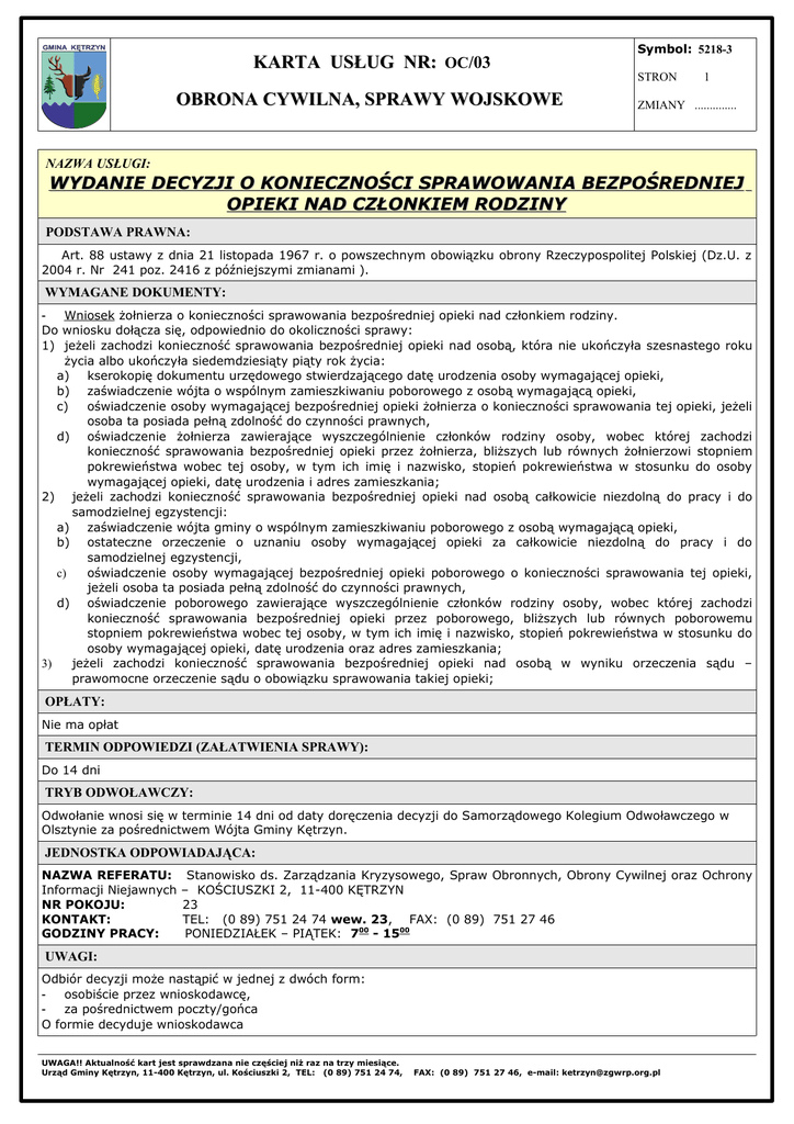 KARTA USŁUG NR: OC/03 OBRONA CYWILNA, SPRAWY WOJSKOWE Symbol: 5218-3 STRON 1 ZMIANY .............. NAZWA USŁUGI: WYDANIE DECYZJI O KONIECZNOŚCI SPRAWOWANIA BEZPOŚREDNIEJ OPIEKI NAD CZŁONKIEM RODZINY PODSTAWA PRAWNA: Art. 88 ustawy z dnia 21 listopada 1967 r. o powszechnym obowiązku obrony Rzeczypospolitej Polskiej (Dz.U. z 2004 r. Nr 241 poz. 2416 z późniejszymi zmianami ). WYMAGANE DOKUMENTY: Wniosek żołnierza o konieczności sprawowania bezpośredniej opieki nad członkiem rodziny. Do wniosku dołącza się, odpowiednio do okoliczności sprawy: 1) jeżeli zachodzi konieczność sprawowania bezpośredniej opieki nad osobą, która nie ukończyła szesnastego roku życia albo ukończyła siedemdziesiąty piąty rok życia: a) kserokopię dokumentu urzędowego stwierdzającego datę urodzenia osoby wymagającej opieki, b) zaświadczenie wójta o wspólnym zamieszkiwaniu poborowego z osobą wymagającą opieki, c) oświadczenie osoby wymagającej bezpośredniej opieki żołnierza o konieczności sprawowania tej opieki, jeżeli osoba ta posiada pełną zdolność do czynności prawnych, d) oświadczenie żołnierza zawierające wyszczególnienie członków rodziny osoby, wobec której zachodzi konieczność sprawowania bezpośredniej opieki przez żołnierza, bliższych lub równych żołnierzowi stopniem pokrewieństwa wobec tej osoby, w tym ich imię i nazwisko, stopień pokrewieństwa w stosunku do osoby wymagającej opieki, datę urodzenia i adres zamieszkania; 2) jeżeli zachodzi konieczność sprawowania bezpośredniej opieki nad osobą całkowicie niezdolną do pracy i do samodzielnej egzystencji: a) zaświadczenie wójta gminy o wspólnym zamieszkiwaniu poborowego z osobą wymagającą opieki, b) ostateczne orzeczenie o uznaniu osoby wymagającej opieki za całkowicie niezdolną do pracy i do samodzielnej egzystencji, c) oświadczenie osoby wymagającej bezpośredniej opieki poborowego o konieczności sprawowania tej opieki, jeżeli osoba ta posiada pełną zdolność do czynności prawnych, d) oświadczenie poborowego zawierające wyszczególnienie członków rodziny osoby, wobec której zachodzi konieczność sprawowania bezpośredniej opieki przez poborowego, bliższych lub równych poborowemu stopniem pokrewieństwa wobec tej osoby, w tym ich imię i nazwisko, stopień pokrewieństwa w stosunku do osoby wymagającej opieki, datę urodzenia oraz adres zamieszkania; 3) jeżeli zachodzi konieczność sprawowania bezpośredniej opieki nad osobą w wyniku orzeczenia sądu – prawomocne orzeczenie sądu o obowiązku sprawowania takiej opieki; OPŁATY: Nie ma opłat TERMIN ODPOWIEDZI (ZAŁATWIENIA SPRAWY): Do 14 dni TRYB ODWOŁAWCZY: Odwołanie wnosi się w terminie 14 dni od daty doręczenia decyzji do Samorządowego Kolegium Odwoławczego w Olsztynie za pośrednictwem Wójta Gminy Kętrzyn. JEDNOSTKA ODPOWIADAJĄCA: NAZWA REFERATU: Informacji Niejawnych NR POKOJU: KONTAKT: GODZINY PRACY: Stanowisko ds. Zarządzania Kryzysowego, Spraw Obronnych, Obrony Cywilnej oraz Ochrony – KOŚCIUSZKI 2, 11-400 KĘTRZYN 23 TEL: (0 89) 751 24 74 wew. 23, FAX: (0 89) 751 27 46 PONIEDZIAŁEK – PIĄTEK: 700 - 1500 UWAGI: Odbiór decyzji może nastąpić w jednej z dwóch form: osobiście przez wnioskodawcę, za pośrednictwem poczty/gońca O formie decyduje wnioskodawca UWAGA!! Aktualność kart jest sprawdzana nie częściej niż raz na trzy miesiące. Urząd Gminy Kętrzyn, 11-400 Kętrzyn, ul. Kościuszki 2, TEL: (0 89) 751 24 74, FAX: (0 89) 751 27 46, e-mail: [email protected]