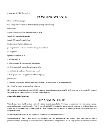 Sygnatura akt XVI Ca 101/15 POSTANOWIENIE Dnia 9 kwietnia 2015 r. Sąd Okręgowy w Gdańsku XVI Wydział Cywilny Odwoławczy w składzie: Przewodniczący Sędzia SO Włodzimierz Witt Sędzia SO Anna Daniszewska Sędzia SO Anna Strugała (spr.) Protokolant: Dariusz Górnowicz po rozpoznaniu w dniu 9 kwietnia 2015r. w Gdańsku na rozprawie sprawy z wniosku H. M. z udziałem W. M. o zobowiązanie do opuszczenia mieszkania na skutek apelacji uczestnika postępowania od postanowienia Sądu Rejonowego w(...) z dnia 15 lipca 2014 r. sygnatura akt I Ns 650/13 postanawia: I. zmienić zaskarżone postanowienie w punkcie 1 w ten sposób, że wniosek oddalić; II. oddalić apelację w pozostałym zakresie; III. zasądzić od wnioskodawczyni H. M. na rzecz uczestnika postępowania W. M. kwotę 100 zł (sto złotych) tytułem zwrotu kosztów postępowania za instancję odwoławczą. Sygn. akt XVI Ca 101/15 UZASADNIENIE Wnioskodawczyni H. M. złożyła wniosek o zobowiązanie uczestnika W. M. do opuszczenia wspólnie zajmowanego domu położonego w miejscowości (...). W uzasadnieniu H. M. wskazała, iż mąż stosuje przemoc psychiczną i fizyczną wobec niej oraz wobec dwóch córek wspólnie z nimi zamieszkujących. Podała, iż dalsze zamieszkiwanie z uczestnikiem nie jest możliwe. Uczestnik postępowania W. M. zaprzeczył twierdzeniom wnioskodawczyni. Postanowieniem z dnia 15 lipca 2014 r. Sąd Rejonowy w(...) na podstawie art. 11a ustawy z dnia 29 lipca 2005 roku o przeciwdziałaniu przemocy w rodzinie zobowiązał uczestnika postępowania W. M., aby opuścił mieszkanie położone w miejscowości (...), gmina Z., oraz obciążył wnioskodawczynię H. M. kosztami postępowania w kwocie 40 złotych i uznał je za uiszczone. Rozpoznając sprawę Sąd Rejonowy poczynił następujące ustalenia i rozważania: H. M. i W. M. są małżeństwem i zamieszkują wraz z córkami J. M. w wieku 22 lat i M. M. (1) w wieku 26 lat w domu jednorodzinnym w miejscowości (...), gmina Z.. Właścicielem domu jest H. M.. Od około 3 lat uczestnik postępowania W. M. stosuje przemoc psychiczną i fizyczną wobec małżonki i córek. W. M. używa wobec wnioskodawczyni słów wulgarnych określając ją jako ,,maciora, kurwa, złodziejka, bydlak”, córki określa jako ,,chore psychicznie, kurwy, idiotki, nienormalne, debilki”, mówi, iż miejsce wnioskodawczyni jest na cmentarzu. W. M. groził wnioskodawczyni, iż ją zabije. Gdy córka J. stanęła w obronie matki również jej groził śmiercią. Nadto uczestnik wszczyna awantury. W. M. bije wnioskodawczynię i córki, używając często paska od spodni. Wnioskodawczyni wraz z córkami przebywają w zamkniętym pokoju, z uwagi na lęk przed przemocą stosowaną przez uczestnika. H. M. po każdym poważniejszym pobiciu przez męża udawała się do lekarza. W dniu 15 grudnia 2010 roku lekarz stwierdził u wnioskodawczyni stan po pobiciu, w wyniku którego powstało zasinienie na pośladku ok. 6 cm średnicy. W dniu 28 kwietnia 2011 roku lekarz stwierdził pobicie u H. M., na skutek którego powstały podbiegnięcia krwawe na ramieniu, na przedramieniu, obrzęk i zasinienie na żuchwie. W dniu 4 lipca 2011 roku lekarz opisał stan po pobiciu; stwierdził na ramionach, przedramionach i nadgarstkach drobne zasinienia, duży siniec na powierzchni przyśrodkowej ramienia, bolesność lewej połowy klatki piersiowej. W dniu 9 lipca 2012 roku lekarz stwierdził podbiegnięcia krwawe okolicy oka lewego oraz obrzęk, zaczerwienie małżowiny usznej; zadrapania i zasinienia kończyn górnych; lekarz wskazał, iż urazy mogły być spowodowane biciem. W dniu 12 listopada 2011 roku wnioskodawczyni udała się do lekarza, który stwierdził liczne zasinienia okolicy oka prawego, wylew krwawy wargi dolnej, zasinienie okolicy podbródka, bolesność głowy, zasinienie w okolicy wewnętrznej uda lewego, silną bolesność prawego podżebrza po kopnięciu, zasinienie lewego ramienia, ślady po uderzeniach i przytrzymywaniu, zasinienia prawego przedramienia, bolesność oraz zasinienia prawej dłoni. Lekarz stwierdził stan po pobiciu przez małżonka. W dniu 10 października 2012 roku H. M. zgłosiła pobicie, lekarz stwierdził zadrapania i opuchliznę twarzy oraz zadrapania i ślady duszenia na szyi. Nadto stwierdził posiniaczenie obu ramion, opuchliznę prawego nadgarstka, bóle głowy i karku. W dniu 15 kwietnia 2013 roku lekarz stwierdził urazy nadgarstka i przedramienia. W dniu 26 lipca 2013 roku lekarz stwierdził liczne podbiegnięcia krwawe na klatce piersiowej, lewym ramieniu i w okolicy prawego stawu łokciowego. W dniu 2 sierpnia 2013 roku lekarz rozpoznał stan po pobiciu – liczne obrzmienia na tułowiu, podbiegnięcia krwawe, stłuczenie. W dniu 7 grudnia 2013 roku lekarz stwierdził stan po pobiciu, złamany ząb, rozcięcie i obrzęk wargi dolnej. W 2013 roku odnotowano sześć interwencji policji, w tym pięć interwencji na wniosek H. M., zaś jedną na wniosek M. M. (1). W dniu 17 kwietnia 2013 roku, w dniu 17 maja 2013 roku, w dniu 5 czerwca 2013 roku i w dniu 17 lipca 2013 roku zostały założone niebieskie karty, gdzie osobą pokrzywdzoną jest H. M., zaś osobą która stosuje przemoc psychiczną i fizyczną – W. M.. Natomiast w dniu 13 listopada 2011 roku, 14 grudnia 2011 roku, 10 stycznia 2012 roku zostały założone niebieskie karty, gdzie osobą pokrzywdzoną jest W. M., zaś osobą stosującą przemoc – H. M.. Jesienią 2013 roku między H., M. i J. M., a W. M. doszło do wzajemnej szarpaniny; strony zostały rozdzielone przez K. T. i W. W.. W dniu 28 kwietnia 2013 roku W. M. wielokrotnie uderzył córkę M. otwartą ręką w okolice głowy oraz ściskał rękoma jej ramiona i nadgarstki, wskutek czego doznała ona obrażeń ciała w postaci podbiegnięcia krwawego ramienia lewego oraz otarć naskórka obu rąk, zgłaszała również dolegliwości subiektywne w postaci bólu głowy, barków i rąk, co spowodowało naruszenie czynności narząd