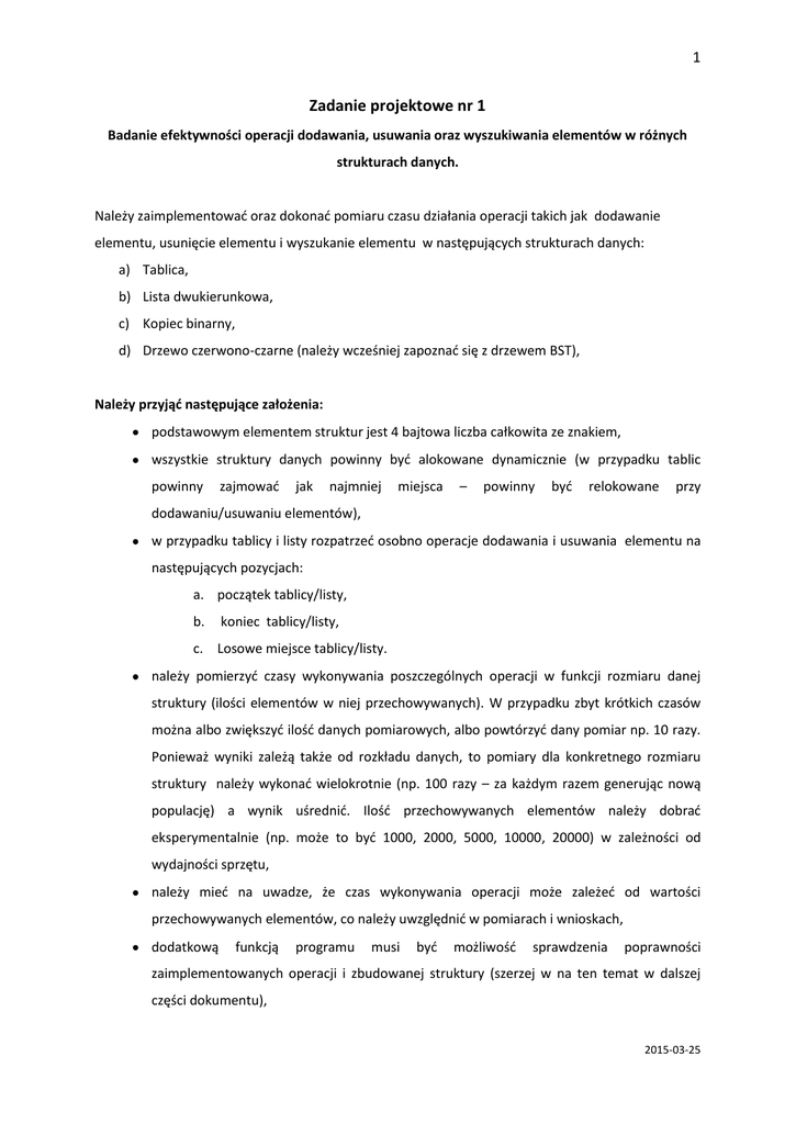 1 Zadanie projektowe nr 1 Badanie efektywności operacji dodawania, usuwania oraz wyszukiwania elementów w różnych strukturach danych. Należy zaimplementować oraz dokonać pomiaru czasu działania operacji takich jak dodawanie elementu, usunięcie elementu i wyszukanie elementu w następujących strukturach danych: a) Tablica, b) Lista dwukierunkowa, c) Kopiec binarny, d) Drzewo czerwono-czarne (należy wcześniej zapoznać się z drzewem BST), Należy przyjąć następujące założenia: podstawowym elementem struktur jest 4 bajtowa liczba całkowita ze znakiem, wszystkie struktury danych powinny być alokowane dynamicznie (w przypadku tablic powinny zajmować jak najmniej miejsca – powinny być relokowane przy dodawaniu/usuwaniu elementów), w przypadku tablicy i listy rozpatrzeć osobno operacje dodawania i usuwania elementu na następujących pozycjach: a. początek tablicy/listy, b. koniec tablicy/listy, c. Losowe miejsce tablicy/listy. należy pomierzyć czasy wykonywania poszczególnych operacji w funkcji rozmiaru danej struktury (ilości elementów w niej przechowywanych). W przypadku zbyt krótkich czasów można albo zwiększyć ilość danych pomiarowych, albo powtórzyć dany pomiar np. 10 razy. Ponieważ wyniki zależą także od rozkładu danych, to pomiary dla konkretnego rozmiaru struktury należy wykonać wielokrotnie (np. 100 razy – za każdym razem generując nową populację) a wynik uśrednić. Ilość przechowywanych elementów należy dobrać eksperymentalnie (np. może to być 1000, 2000, 5000, 10000, 20000) w zależności od wydajności sprzętu, należy mieć na uwadze, że czas wykonywania operacji może zależeć od wartości przechowywanych elementów, co należy uwzględnić w pomiarach i wnioskach, dodatkową funkcją programu musi być możliwość sprawdzenia poprawności zaimplementowanych operacji i zbudowanej struktury (szerzej w na ten temat w dalszej części dokumentu), 2015-03-25 2 sposoby dokładnego pomiaru czasu w systemie Windows podano na stronie www http://jaroslaw.mierzwa.staff.iiar.pwr.wroc.pl/pamsi/debug_and_time.pdf dopuszczalnymi językami programowanie są języki kompilowane do kodu natywnego (np. C, C++), a nie interpretowane lub uruchamiane na maszynach wirtualnych (np. JAVA, .NET, Phyton); dopuszczalne jest odstępstwo od tej reguły za zgodą prowadzącego używanie okienek nie jest konieczne i nie wpływa na ocenę (wystarczy wersja konsolowa), nie wolno korzystać z gotowych bibliotek np. STL, Boost lub innych – wszystkie algorytmy i struktury muszą być zaimplementowane przez studenta (nie kopiować gotowych rozwiązań), realizacja zadania powinna być wykonana w formie jednego programu, kod źródłowy powinien być komentowany, program musi skompilowany do wersji exe (i w takiej wersji zostanie poddany testom). Sprawdzenie poprawności zbudowanej struktury/operacji obejmuje: utworzenie struktury z liczb zapisanych w pliku tekstowym .Każda liczba będzie w osobnej linii, natomiast pierwsza liczba określa ilość zapisanych liczb w pliku. Nazwa pliku nie może być na sztywno wpisana do programu – należy o nią zapytać przy wczytywaniu danych z pliku. Wyświetlenie tej struktury na ekranie (w przypadku drzew wymyśleć jakąś przejrzystą formę – kopiec też jest drzewem), Możliwość wykonania operacji na strukturze z tym, że w przypadku: a. Usuwania z tablicy - zostanie podana pozycja liczby(indeks), którą należy usunąć, b. wstawianie do tablicy - zostanie podana pozycja i wartość, którą należy wstawić na podana pozycję (tablice w razie konieczności rozsunąć), c. Usuwania z listy - zostanie podana tylko wartość , którą należy usunąć , d. Dodawania do listy - podajemy wartość i numer pozycji (indeks) na który mamy wstawić wartość, e. Usuwania (dodawania) dla drzew – zostanie podana liczba (klucz), którą należy usunąć (dodać) f. Wyszukiwania (dla wszystkich struktur) – zostanie podana liczba, którą należy znaleźć – należy tylko wyświetlić, czy liczba jest w strukturze, czy nie. 2015-03-25 3 Opisane operacje najlepiej zrealizować w formie menu dla każdej struktury, gdzie będzie możliwość wykonania tych operacji np. 1.Zbuduj z pliku 2.Usuń 3.Dodaj 4.Znajdź 5. Utwórz losowo (losowe wygenerowanie struktury) – należy spytać o wielkość struktury. 6.Wyświetl (tablicę, listę, kopiec, drzewo). W przypadku listy lista jest wyświetlana dwukrotnie raz od przodu, raz od tyłu) Sprawozdanie (w formie papierowej) powinno zawierać: krótki wstęp w którym zostaną przedstawione złożoności obliczeniowe operacji w implementowanych strukturach na podstawie literatury, plan eksperymentu czyli założenia co do wielkości struktur, sposobu generowania elementów tych struktur, sposobie pomiaru czasu, itp. zestawienie wyników w formie tabelarycznej i graficznej (czas wykonania operacji w funkcji ilości elementów – nie używać wykresu słupkowego) - i wyniki osobno dla poszczególnych operacji, wnioski dotyczące efektywności poszczególnych struktur w zależności od zastosowań, wielkości struktury itp., wskazać (jeśli są) przyczyny rozbieżności pomiędzy uzyskanymi eksperymentalnie złożonościami, a teoretycznymi. załączony kod źródłowy w formie elektronicznej (skopiować cały projekt oraz wersję skompilowaną programu) Ocena projektu: 3.0 – eksperymenty na tablicy, liście i kopcu binarnym 4.0 - eksperymenty na tablicy, liście i kopcu binarnym i drzewie czerwono- czarnym 5.0 – eksperymenty na tablicy, liście i kopcu binarnym i drzewie czerwono- czarnym (program w wersji obiektowej) 5,5 - eksperymenty na tablicy, liście i kopcu binarnym i drzewie czerwono- czarnym, drzewie AVL (program w wersji obiektowej). Dodatkowo pomierzyć czasy operacji dla tablicy i listy implementowanej jako kontenery z biblioteki STL (odpowiednio vector i list) i porównać je z czasami dla implementacji własnej dla tych struktur 2015-03-25 4 Tzw. 