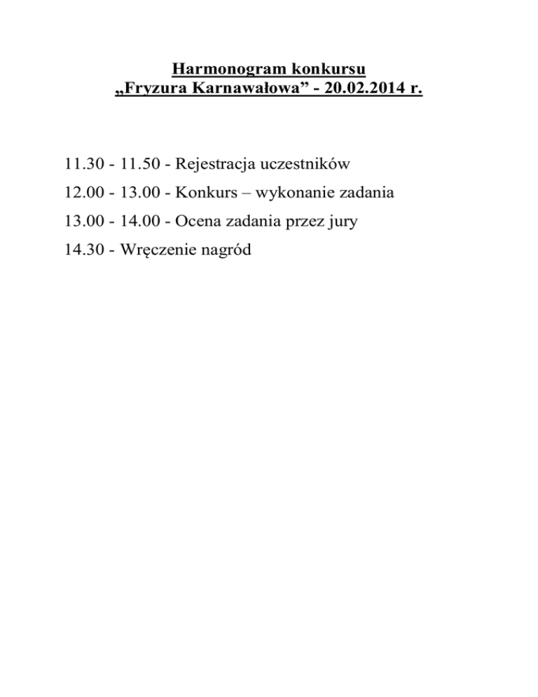 Harmonogram konkursu „Fryzura Karnawałowa” - 20.02.2014 r. 11.30 - 11.50 - Rejestracja uczestników 12.00 - 13.00 - Konkurs – wykonanie zadania 13.00 - 14.00 - Ocena zadania przez jury 14.30 - Wręczenie nagród