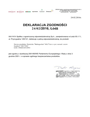 24.02.2016r. DEKLARACJA ZGODNOŚCI 24/02/2016, Łódź BROWIN Spółka z ograniczoną odpowiedzialnością Sp.k., zarejestrowana w Łodzi 93-373, ul. Pryncypalna 129/141, deklaruje z pełną odpowiedzialnością, że produkt: Nazwa produktu: Doniczka "Madagaskar" 40x77cm z syst. nawad. czerw Symbol: 74017504^ EAN: 5904816914993 jest zgodny z dyrektywą 2001/95/WE Parlamentu Europejskiego i Rady z dnia 3 grudnia 2001 r. w sprawie ogólnego bezpieczeństwa produktów. 24.02.2016r. DECLARATION OF COMPLIANCE 24/02/2016, Łódź BROWIN Company, placed in Lodz 93-373, Pryncypalna 129/141 street, declares that the following product: Product: Flowerpot "Madagaskar" 40x77cm - irrigating system - red Symbol: 74017504^ EAN: 5904816914993 is produced in accordance with the Regulation of the European Parliament and the Council (WE) 2001/95/WE dated 3rd December 2001 on general product safety.