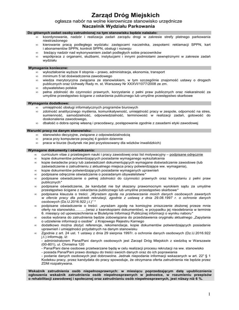 Zarząd Dróg Miejskich ogłasza nabór na wolne kierownicze stanowisko urzędnicze Naczelnik Wydziału Parkowania Do głównych zadań osoby zatrudnionej na tym stanowisku będzie należało: • koordynowanie, nadzór i realizacja zadań zarządu drogi w zakresie strefy płatnego parkowania niestrzeżonego • kierowanie pracą podległego wydziału: zastępcami naczelnika, zespołami: reklamacji SPPN, kart i abonamentów SPPN, kontroli SPPN, obsługi i rozwoju • bieżący nadzór nad wykonywaniem zadań podległych sobie pracowników • współpraca z organami, służbami, instytucjami i innymi podmiotami zewnętrznymi w zakresie zadań wydziału Wymagania konieczne: • wykształcenie wyższe II stopnia – prawo, administracja, ekonomia, transport • minimum 5 lat doświadczenia zawodowego • wiedza merytoryczna związana ze stanowiskiem, w tym szczególnie znajomość ustawy o drogach publicznych oraz Uchwały Rady m. st. Warszawy Nr XXXVI/1077/2008 ze zm. • obywatelstwo polskie • pełna zdolność do czynności prawnych, korzystanie z pełni praw publicznych oraz niekaralność za umyślne przestępstwo ścigane z oskarżenia publicznego lub umyślne przestępstwo skarbowe Wymagania dodatkowe: • umiejętność obsługi informatycznych programów biurowych • zdolność analitycznego myślenia, komunikatywność, umiejętność pracy w zespole, odporność na stres, sumienność, samodzielność, odpowiedzialność, terminowość w realizacji zadań, gotowość do doskonalenia zawodowego, • dbałość o dobra opinię własną i pracodawcy, postępowanie zgodnie z zasadami etyki zawodowej Warunki pracy na danym stanowisku: • stanowisko decyzyjne, związane z odpowiedzialnością • praca przy komputerze powyżej 4 godzin dziennie • praca w biurze (budynek nie jest przystosowany dla wózków inwalidzkich) Wymagane dokumenty i oświadczenia: • curriculum vitae z przebiegiem nauki i pracy zawodowej oraz list motywacyjny – podpisane odręcznie • kopie dokumentów potwierdzających posiadanie wymaganego wykształcenia • kopie świadectw pracy lub zaświadczeń dokumentujących wymagane doświadczenie zawodowe (lub zaświadczenie o zatrudnieniu z aktualnego miejsca pracy potwierdzające ww. wymagania), • kopie dokumentów potwierdzających posiadanie wymaganych uprawnień • podpisane odręcznie oświadczenie o posiadanym obywatelstwie* • podpisane oświadczenie o pełnej zdolności do czynności prawnych oraz korzystaniu z pełni praw publicznych* • podpisane oświadczenie, że kandydat nie był skazany prawomocnym wyrokiem sądu za umyślne przestępstwo ścigane z oskarżenia publicznego lub umyślne przestępstwo skarbowe* • podpisana klauzula o treści: „Wyrażam zgodę na przetwarzanie moich danych osobowych zawartych w ofercie pracy dla potrzeb rekrutacji, zgodnie z ustawą z dnia 29.08.1997 r. o ochronie danych osobowych (Dz.U.2016.922 j.t.)” * • podpisane oświadczenie o treści: „wyrażam zgodę na komisyjne zniszczenie złożonej przeze mnie oferty na stanowisko...........(wraz z kserokopiami dokumentów), w przypadku jej nieodebrania w terminie 6. miesięcy od upowszechnienia w Biuletynie Informacji Publicznej informacji o wyniku naboru* • osoba wybrana do zatrudnienia będzie zobowiązana do przedstawienia oryginału aktualnego „Zapytania o udzielenie informacji o osobie” z Krajowego Rejestru Karnego • dodatkowo można złożyć referencje, rekomendacje, kopie dokumentów potwierdzających posiadanie uprawnień i umiejętności przydatnych na danym stanowisku • Zgodnie z art. 24 ust. 1 ustawy z dnia 29 sierpnia 1997r. o ochronie danych osobowych (Dz.U.2016.922 j.t.) informuję, iż: - administratorem Pana/Pani danych osobowych jest Zarząd Dróg Miejskich z siedzibą w Warszawie (00-801), ul. Chmielna 120 - Pana/Pani dane osobowe przetwarzane będą w celu realizacji procesu rekrutacji na ww. stanowisko - posiada Pana/Pani prawo dostępu do treści swoich danych oraz do ich poprawiania - podanie danych osobowych jest dobrowolne. Jednak niepodanie informacji wskazanych w art. 221 § 1 Kodeksu pracy, przez kandydata do pracy spowoduje, że otrzymana oferta zatrudnienia nie będzie przez ZDM rozpatrywana. Wskaźnik zatrudnienia osób niepełnosprawnych: w miesiącu poprzedzającym datę upublicznienia ogłoszenia wskaźnik zatrudnienia osób niepełnosprawnych w jednostce, w rozumieniu przepisów o rehabilitacji zawodowej i społecznej oraz zatrudnianiu osób niepełnosprawnych, jest niższy niż 6 %. 1 Osoby zainteresowane prosimy o składanie kompletu dokumentów w zamkniętej kopercie osobiście w kancelarii ZDM lub przesłanie pocztą na poniższy adres do dnia 25.11.2016 r. Zarząd Dróg Miejskich Wydział Spraw Pracowniczych ul. Chmielna 120, 00-801 Warszawa tel. 22 5589228, 22 5589160 z dopiskiem na kopercie: „10/K/2016 – naczelnik Wydziału Parkowania” Dokumenty uważa się za dostarczone w terminie, jeżeli wpłynęły na ww. adres do dnia 25.11.2016 r. * Druki oświadczeń do pobrania na stronie www.zdm.waw.pl 2