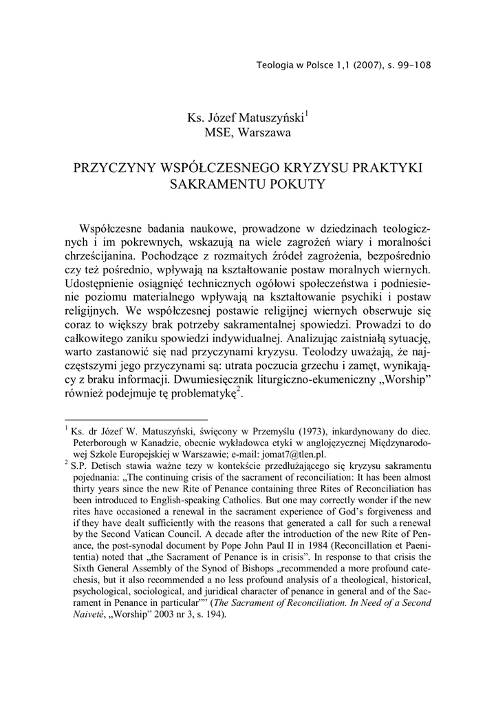 Teologia w Polsce 1,1 (2007), s. 99-108 Ks. Józef Matuszyński1 MSE, Warszawa PRZYCZYNY WSPÓŁCZESNEGO KRYZYSU PRAKTYKI SAKRAMENTU POKUTY Współczesne badania naukowe, prowadzone w dziedzinach teologicznych i im pokrewnych, wskazują na wiele zagrożeń wiary i moralności chrześcijanina. Pochodzące z rozmaitych źródeł zagrożenia, bezpośrednio czy też pośrednio, wpływają na kształtowanie postaw moralnych wiernych. Udostępnienie osiągnięć technicznych ogółowi społeczeństwa i podniesienie poziomu materialnego wpływają na kształtowanie psychiki i postaw religijnych. We współczesnej postawie religijnej wiernych obserwuje się coraz to większy brak potrzeby sakramentalnej spowiedzi. Prowadzi to do całkowitego zaniku spowiedzi indywidualnej. Analizując zaistniałą sytuację, warto zastanowić się nad przyczynami kryzysu. Teolodzy uważają, że najczęstszymi jego przyczynami są: utrata poczucia grzechu i zamęt, wynikający z braku informacji. Dwumiesięcznik liturgiczno-ekumeniczny „Worship” również podejmuje tę problematykę2. 1 Ks. dr Józef W. Matuszyński, święcony w Przemyślu (1973), inkardynowany do diec. Peterborough w Kanadzie, obecnie wykładowca etyki w anglojęzycznej Międzynarodowej Szkole Europejskiej w Warszawie; e-mail: [email protected]. 2 S.P. Detisch stawia ważne tezy w kontekście przedłużającego się kryzysu sakramentu pojednania: „The continuing crisis of the sacrament of reconciliation: It has been almost thirty years since the new Rite of Penance containing three Rites of Reconciliation has been introduced to English-speaking Catholics. But one may correctly wonder if the new rites have occasioned a renewal in the sacrament experience of God’s forgiveness and if they have dealt sufficiently with the reasons that generated a call for such a renewal by the Second Vatican Council. A decade after the introduction of the new Rite of Penance, the post-synodal document by Pope John Paul II in 1984 (Reconcillation et Paenitentia) noted that „the Sacrament of Penance is in crisis”. In response to that crisis the Sixth General Assembly of the Synod of Bishops „recommended a more profound catechesis, but it also recommended a no less profound analysis of a theological, historical, psychological, sociological, and juridical character of penance in general and of the Sacrament in Penance in particular”” (The Sacrament of Reconciliation. In Need of a Second Naivetè, „Worship” 2003 nr 3, s. 194). ks. Józef Matuszyński ZANIK SPOWIEDZI INDYWIDUALNEJ Sakrament pokuty jest jednym z darów Bożego miłosierdzia i miłości, a jednocześnie jest to sakrament trudny. Przyznanie się do winy i wyznanie jej przed kapłanem wymaga ogromnej pokory. Sakrament spowiedzi jest często nierozumiany lub pojmowany błędnie jako środek terapeutyczny. Nie towarzyszą mu rozmyślania o zawartych w nim łasce i mocy. Autorzy artykułów zwracają uwagę na to, że praktyka sakramentalnej spowiedzi przeżywa kryzys. L.M. Orsy, na przykładzie praktyki we wspólnotach zakonnych, pisze o kryzysie jako fakcie, o praktyce spowiedzi indywidualnej zredukowanej do koniecznego minimum. Jednocześnie autor zauważa pozytywny aspekt tej sytuacji. Przeżywany kryzys wywołuje pewne refleksje nad odnową życia duchowego3. Problem kryzysu tożsamości i odnowy życia konsekrowanego porusza też inny teolog – E. Schillebeeckx, dzieląc się swoimi wrażeniami z pobytu w Stanach Zjednoczonych. Zauważa on istnienie poważnej sprzeczności pomiędzy posłuszeństwem a inspiracją ewangeliczną, która ogromnie hamuje proces chrześcijańskiej odnowy. Zarówno siostry zakonne jak i kapłani doświadczają kryzysu tożsamości, a stanowi on poważne zagrożenie życia religijnego4. Przyczyn kryzysu starano się dopatrywać w nieudolnej administracji sakramentu, braku kierownictwa duchowego oraz błędnym przekonaniu o jego magicznej sile, mimo ciągłego przestrzegania o niebezpieczeństwie zawężenia go wyłącznie do rytualizmu i dewocji. Wnikliwa analiza zagadnienia wskazuje na głębsze przyczyny owego załamania, a mianowicie na zanik poczucia grzechu i ducha pokuty, aż do utraty Boga i ludzkiej godności5. Wielu autorów w swoich artykułach zwraca uwagę na fakt zaniku indywidualnej praktyki pokutnej, pisząc o zjawisku długotrwałego przyjmowania komunii św. bez dostrzegania potrzeby sakramentalnego pojednania się z Bogiem6. Praktyka ta w krótkim czasie stała się normą życia i postępowania człowieka. 3 Por. L.M. Orsy, The Sacrament of Penance in Religious Communities, „Worship” 1968 nr 3, s. 159. 4 Por. E Scillebeeckx, Catholic life in the United States, „Worship” 1968 nr 3, s. 143. 5 Por. J. Dallen, Church Authority and the Sacrament of Penance: The Synod of Bishops, „Worship” 1984 nr 3, s. 207. 6 Por. m.in.: P. Samway, Faith and Communal Penance, „Worship” 1969 nr 5, s. 290-303; C.J. Peter, The New Norms for Communal Penance: Will They Help?, „Worship” 1973 100 TwP 1,1 (2007) Przyczyny współczesnego kryzysu praktyki sakramentu pokuty Nasuwa się pytanie: co jest powodem procesu zmierzającego do zapoznania spowiedzi jako sakramentu w obowiązującej formie? By na nie odpowiedzieć, trzeba spojrzeć na życie w o wiele szerszym kontekście, próbując ustalić, jakie czynniki wpływają na kształtowanie postaw religijnych. Warto zastanowić się, dlaczego wierni zrezygnowali z przystępowania do spowiedzi; w jaki sposób odpowiedzieć Duchowi Świętemu, Duchowi pojednania, obecnemu we wspólnocie?7 E. Schillebeeckx, w artykule Życie katolickie w Stanach Zjednoczonych, analizując sytuację Kościoła posoborowego, stwierdza, że kryzys spowiedzi ma podłoże w „kryzysie tożsamości” zarówno księży jak i sióstr zakonnych. Powodem tego stanu rzeczy, stwierdza autor, w znacznej mierze jest celibat, a także utrzymywanie bliższych stosunków między księżmi a parafianami oraz siostrami zakonnymi8.