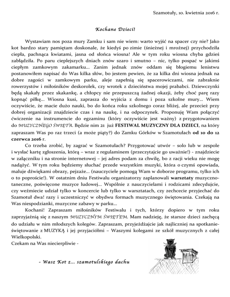 Szamotuły, 10. kwietnia 2016 r. Kochane Dzieci! Wystawiam nos poza mury Zamku i sam nie wiem: warto wyjść na spacer czy nie? Jako kot bardzo stary pamiętam doskonale, że kiedyś po zimie (śnieżnej i mroźnej) przychodziła ciepła, pachnąca kwiatami, jasna od słońca wiosna! Ale w tym roku wiosna chyba gdzieś zabłądziła. Po paru cieplejszych dniach znów szaro i smutno – nic, tylko pospać w jakimś ciepłym zamkowym zakamarku… Zanim jednak znów oddam się błogiemu lenistwu postanowiłem napisać do Was kilka słów, bo jestem pewien, że za kilka dni wiosna jednak na dobre zagości w zamkowym parku, aleje zapełnią się spacerowiczami, nie zabraknie rowerzystów i miłośników deskorolek, czy wrotek z dzieciństwa mojej prababci. Dziewczynki będą skakały przez skakankę, a chłopcy nie przepuszczą żadnej okazji, żeby choć parę razy kopnąć piłkę… Wiosna kusi, zaprasza do wyjścia z domu i poza szkolne mury… Wiem oczywiście, że macie dużo nauki, bo do końca roku szkolnego coraz bliżej, ale przecież przy dobrej organizacji znajdziecie czas i na naukę, i na odpoczynek. Proponuję Wam połączyć ćwiczenie na instrumencie do egzaminu (który oczywiście jest ważny) z przygotowaniem do MUZYCZNEGO ŚWIĘTA. Będzie nim 21 już FESTIWAL MUZYCZNY DLA DZIECI, na który zapraszam Was po raz trzeci (a może piąty?) do Zamku Górków w Szamotułach od 10 do 12 czerwca 2016 r. Co trzeba zrobić, by zagrać w Szamotułach? Przygotować utwór – solo lub w zespole i wysłać kartę zgłoszenia, którą – wraz z regulaminem (przeczytajcie go uważnie!) -‐ znajdziecie w załączniku i na stronie internetowej – jej adres podam za chwilę, bo z racji wieku nie mogę nadążyć. W tym roku będziemy słuchać przede wszystkim muzyki, która o czymś opowiada, maluje dźwiękami obrazy, pejzaże… (nauczyciele pomogą Wam w doborze programu, tylko ich o to poproście!). W ostatnim dniu Festiwalu organizatorzy zaplanowali warsztaty muzyczno-‐ taneczne, poświęcone muzyce ludowej… Wspólnie z nauczycielami i rodzicami zdecydujcie, czy weźmiecie udział tylko w koncercie lub tylko w warsztatach, czy zechcecie przyjechać do Szamotuł dwa! razy i uczestniczyć w obydwu formach muzycznego świętowania. Czekają na Was niespodzianki, muzyczne zabawy w parku… Kochani! Zapraszam miłośników Festiwalu i tych, którzy dopiero w tym roku zaprzyjaźnią się z naszym MUZYCZNYM ŚWIĘTEM. Mam nadzieję, że starsze dzieci zachęcą do udziału w nim młodszych kolegów. Zapraszam, przyjeżdżajcie jak najliczniej na spotkanie-‐ świętowanie z MUZYKĄ i jej przyjaciółmi – Waszymi kolegami ze szkół muzycznych z całej Wielkopolski. Czekam na Was niecierpliwie -‐ - Wasz Kot z... szamotulskiego dachu