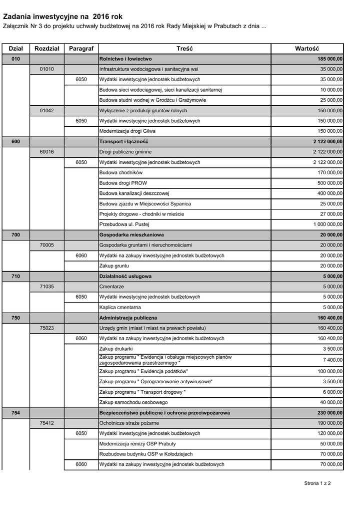 Zadania inwestycyjne na 2016 rok Załącznik Nr 3 do projektu uchwały budżetowej na 2016 rok Rady Miejskiej w Prabutach z dnia ... Dział Rozdział Paragraf 010 Treść Rolnictwo i łowiectwo 01010 6050 01042 6050 600 60016 6050 70005 6060 710 71035 6050 750 75023 6060 35 000,00 Wydatki inwestycyjne jednostek budżetowych 35 000,00 Budowa sieci wodociągowej, sieci kanalizacji sanitarnej 10 000,00 Budowa studni wodnej w Grodźcu i Grażymowie 25 000,00 Wyłączenie z produkcji gruntów rolnych 150 000,00 Wydatki inwestycyjne jednostek budżetowych 150 000,00 Modernizacja drogi Gilwa 150 000,00 Transport i łączność 2 122 000,00 Drogi publiczne gminne 2 122 000,00 Wydatki inwestycyjne jednostek budżetowych 2 122 000,00 Budowa chodników 170 000,00 Budowa drogi PROW 500 000,00 Budowa kanalizacji deszczowej 400 000,00 Budowa zjazdu w Miejscowości Sypanica 25 000,00 Projekty drogowe - chodniki w mieście 27 000,00 20 000,00 Gospodarka gruntami i nieruchomościami 20 000,00 Wydatki na zakupy inwestycyjne jednostek budżetowych 20 000,00 Zakup gruntu 20 000,00 Działalność usługowa 5 000,00 Cmentarze 5 000,00 Wydatki inwestycyjne jednostek budżetowych 5 000,00 Kaplica cmentarna 5 000,00 Administracja publiczna 160 400,00 Urzędy gmin (miast i miast na prawach powiatu) 160 400,00 Wydatki na zakupy inwestycyjne jednostek budżetowych 160 400,00 Zakup drukarki 3 500,00 Zakup programu " Ewidencja i obsługa miejscowych planów zagospodarowania przestrzennego " 7 400,00 6050 6060 100 000,00 Zakup programu " Oprogramowanie antywirusowe" 3 500,00 Zakup programu " Transport drogowy " 6 000,00 Zakup samochodu osobowego 75412 1 000 000,00 Gospodarka mieszkaniowa Zakup programu " Ewidencja podatków" 754 185 000,00 Infrastruktura wodociągowa i sanitacyjna wsi Przebudowa ul. Pustej 700 Wartość 40 000,00 Bezpieczeństwo publiczne i ochrona przeciwpożarowa 230 000,00 Ochotnicze straże pożarne 190 000,00 Wydatki inwestycyjne jednostek budżetowych 120 000,00 Modernizacja remizy OSP Prabuty 50 000,00 Rozbudowa budynku OSP w Kołodziejach 70 000,00 Wydatki na zakupy inwestycyjne jednostek budżetowych 70 000,00 Strona 1 z 2 75495 6060 900 Zakup aparatów powietrznych 30 000,00 Zakup nożyc holmatro 30 000,00 Zakup silnika do łodzi ratunkowej 10 000,00 Pozostała działalność 40 000,00 Wydatki na zakupy inwestycyjne jednostek budżetowych 40 000,00 Zakup samochodu osobowego 40 000,00 Gospodarka komunalna i ochrona środowiska 90001 663 500,00 Gospodarka ściekowa i ochrona wód 70 000,00 6050 Wydatki inwestycyjne jednostek budżetowych 50 000,00 Rozbudowa, przebudowa oczyszczalni ścieków w Prabutach 50 000,00 6230 Dotacje celowe z budżetu na finansowanie lub dofinansowanie kosztów realizacji inwestycji i zakupów inwestycyjnych jednostek nie zaliczanych do sektora finansów publicznych 20 000,00 Przydomowe oczyszczalnie ścieków 20 000,00 Gospodarka odpadami 40 500,00 Wydatki na zakupy inwestycyjne jednostek budżetowych 40 500,00 Zakup kontenerów PSZOK 13 500,00 Zakup wiat śmietnikowych 27 000,00 90002 6060 90015 6050 90019 6230 Oświetlenie ulic, placów i dróg 170 000,00 Wydatki inwestycyjne jednostek budżetowych 170 000,00 Budowa oświetlenia ulicznego 160 000,00 Oświetlenie drogowe Trumiejki 10 000,00 Wpływy i wydatki związane z gromadzeniem środków z opłat i kar za korzystanie ze środowiska Dotacje celowe z budżetu na finansowanie lub dofinansowanie kosztów realizacji inwestycji i zakupów inwestycyjnych jednostek nie zaliczanych do sektora finansów publicznych Wymiany źródeł ciepła na gazowe 90095 6050 Pozostała działalność 353 000,00 Wydatki inwestycyjne jednostek budżetowych 318 000,00 Budowa boiska w miejscowości Laskowice 10 000,00 Budowa toalety i szamba 25 000,00 200 000,00 Modernizacja budynku ul. Koszarowa 20 000,00 Wymiana posadzki w świetlicach wiejskich 28 000,00 Zabezpieczenie stropu budynku 30 000,00 Zagospodarowanie terenu ul. Żeromskiego 926 92601 6050 30 000,00 30 000,00 Budynek ul. Krótka 6060 30 000,00 5 000,00 Wydatki na zakupy inwestycyjne jednostek budżetowych 35 000,00 Zakup piłkochwytów 35 000,00 Kultura fizyczna 290 000,00 Obiekty sportowe 290 000,00 Wydatki inwestycyjne jednostek budżetowych 290 000,00 Przebudowa budynku socjalnego 290 000,00 Razem 3 675 900,00 Strona 2 z 2