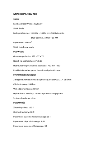 MINIKOPARKA 700 SILNIK Lombardini LDW 702 2 cylindry Silnik diesla Maksymalna moc: 11.8 KW – 16 KM przy 3600 obr/min. 2400 obr/min. 10KW – 11 KM Pojemność: 389 cm3 Silnik chłodzony wodą. PODWOZIE Gumowe gąsienice: 190 x 37 x 72 Nacisk na podłoże kg/cm2 : 0.23 Hydraulicznie poszerzenie podwozia: 760 mm i 960 Przekładnia redukcyjna z hamulcem hydraulicznym SYSTEM HYDRAULICZNY 2-biegowa pompa zębata z szybkością przepływu: 11 + 11 l/min Ciśnienie pracy: 160 bar. Wał odbioru mocy: 22 l/min Hydrauliczna instalacja rurowa z przewodami giętkimi System chłodzenia oleju POJEMNOŚĆ Zbiornik paliwa: 10,5 l Olej hydrauliczny: 10,5 l Pojemność systemu hydraulicznego: 15 l Pojemność oleju silnikowego: 1,6 l Pojemność systemu chłodzącego: 3 l WAGA 800 kg PRĘDKOŚĆ Obrotowy górny wózek : 8 obr/min. Prędkość jazdy: 1,8 i 3,6 km/h z pedałem do podwójnej prędkości SIŁA WYRYWANIA Spadania/zrzucania: 6200 N – 620 kg Balans/wyważenie: 5850 N- 585 kg Hałas: spełnia normy 2000/14/CE Lwa 93 dbA SYSTEM ELEKTRYCZNY 12 V