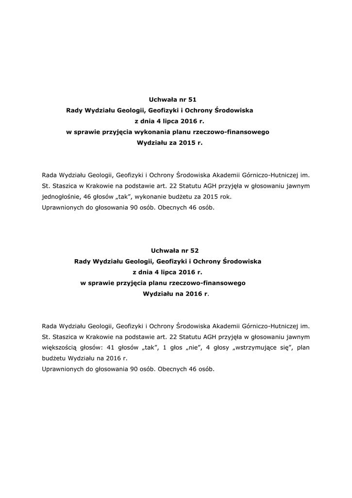 Uchwała nr 51 Rady Wydziału Geologii, Geofizyki i Ochrony Środowiska z dnia 4 lipca 2016 r. w sprawie przyjęcia wykonania planu rzeczowo-finansowego Wydziału za 2015 r. Rada Wydziału Geologii, Geofizyki i Ochrony Środowiska Akademii Górniczo-Hutniczej im. St. Staszica w Krakowie na podstawie art. 22 Statutu AGH przyjęła w głosowaniu jawnym jednogłośnie, 46 głosów „tak”, wykonanie budżetu za 2015 rok. Uprawnionych do głosowania 90 osób. Obecnych 46 osób. Uchwała nr 52 Rady Wydziału Geologii, Geofizyki i Ochrony Środowiska z dnia 4 lipca 2016 r. w sprawie przyjęcia planu rzeczowo-finansowego Wydziału na 2016 r. Rada Wydziału Geologii, Geofizyki i Ochrony Środowiska Akademii Górniczo-Hutniczej im. St. Staszica w Krakowie na podstawie art. 22 Statutu AGH przyjęła w głosowaniu jawnym większością głosów: 41 głosów „tak”, 1 głos „nie”, 4 głosy „wstrzymujące się”, plan budżetu Wydziału na 2016 r. Uprawnionych do głosowania 90 osób. Obecnych 46 osób. UCHWAŁA nr 53 Rady Wydziału Geologii, Geofizyki i Ochrony Środowiska AGH z dnia 4 lipca 2016 r. w sprawie reasumpcji uchwały Rady Wydziału (nr 2 z dnia 26 stycznia 2015 r wyróżniania prac doktorskich) dla wszczętych przewodów doktorskich po nowelizacji ustawy o stopniach i tytule naukowym oraz w stopniach i tytule w zakresie sztuki Rada Wydziału w głosowaniu jawnym: 43 głosy „tak”, 2 głosy „nie”, 1 głos „wstrzymujący się” przyjęła reasumpcję uchwały nr 2 z dnia 26 stycznia 2015 roku w sprawie wyróżniania prac doktorskich (zmiana w pkt. 1d). 1. Rada Wydziału Geologii Geofizyki i Ochrony Środowiska AGH w głosowaniu tajnym może wyróżnić pracę doktorską, jeżeli są spełnione jednocześnie następujące warunki: a/ w przypadku studentów III stopnia studiów (studia doktoranckie), praca musi być złożona do recenzji przed ukończeniem V roku studiów doktoranckich; b/ egzaminy doktorskie zakończyły się z oceną bardzo dobrą; c/ wszystkie recenzje zawierają wniosek o wyróżnienie rozprawy doktorskiej, szczegółowo omówiony w recenzji lub jako osobny dokument dołączony do recenzji; d/ posiada co najmniej 1 samodzielny artykuł lub co najmniej 2 artykuły we współautorstwie w bazie JCR (tzw. lista filadelfijska) o tematyce nawiązującej do pracy doktorskiej. 2. Po spełnieniu w/wym. warunków oraz wyróżniającej się prezentacji pracy doktorskiej i merytorycznych odpowiedzi świadczących o ugruntowanej wiedzy w zakresie rozprawy, Komisja doktorska w głosowaniu tajnym przedkłada Radzie Wydziału Geologii, Geofizyki i Ochrony Środowiska AGH wniosek o wyróżnienie rozprawy doktorskiej. 3. Głosowanie w sprawie wyróżnienia pracy doktorskiej odbywa się w trakcie posiedzenia Rady Wydziału na której zostanie nadany kandydatowi stopień naukowy doktora. 4. Uchwała obowiązuje z dniem podjęcia. Uchwała Rady Wydziału nr 54 z dnia 4 lipca 2016 roku w sprawie nadania stopnia naukowego doktora mgr inż. Marii Barmucie. Podstawa Prawna: Ustawa z dnia 14 marca 2003 r. o stopniach naukowych i tytule w zakresie sztuki (Dz. U. Nr 65, poz. 595, DZ. U. z 2005 r. nr 164, poz. 1365 oraz Dz. U. z 2011 r. nr 84, poz. 455 oraz z 2014 r. poz. 1198). Zmiany tekstu jednolitego wymienionej stawy zostały ogłoszone w Dz. U. z 2012 r. poz. 742 i 1544, z 2013 r. poz. 675, 829, 1005, 1588 i 1650 oraz z 2014 r. poz. 7, 768, 821, 1004, 1146 i 1198. Rozporządzenie MNISZW z dnia 3 października 2014 r. Dz. U. 2014 r. poz.1383. Temat rozprawy: „Procesy i zjawiska związane z tektoniką płyt w wybranych rejonach Polski Południowej i obszarów przyległych w aspekcie geoturystycznym”. Promotor: prof. dr hab. inż. Jan Golonka (Wydział GGiOŚ AGH), Recenzenci: dr hab. Aleksandra Gawęda (Wydział Nauk o Ziemi - Uniwersytet Śląski), prof. dr hab. Andrzej Ślączka (Wydział Biologii i Nauk o Ziemi – Uniwersytet Jagielloński). Rada Wydziału Geologii, Geofizyki i Ochrony Środowiska AGH w głosowaniu tajnym większością głosów: 29 głosów „tak”, 1 głos „nie”, podjęła uchwałę o nadaniu mgr inż. Marii Barmucie stopnia naukowego doktora w obszarze nauk przyrodniczych; dziedzinie nauk Ziemi; dyscyplinie geologia. Uprawnionych do głosownia; 57 osób. Obecnych 29 osób. Uchwała Rady Wydziału nr 55 z dnia 4 lipca 2016 roku w sprawie zamknięcia przewodu doktorskiego mgr inż. Aurelii Zając Podstawa Prawna: Ustawa z dnia 14 marca 2003 r. o stopniach naukowych i tytule w zakresie sztuki (Dz. U. Nr 65, poz. 595, DZ. U. z 2005 r. nr 164, poz. 1365 oraz Dz. U. z 2011 r. nr 84, poz. 455 oraz z 2014 r. poz. 1198). Zmiany tekstu jednolitego wymienionej ustawy zostały ogłoszone w Dz. U. z 2012 r. poz. 742 i 1544, z 2013 r. poz. 675, 829 , 1005, 1588 i 1650 oraz z 2014 r. poz. 7, 768, 821, 1004, 1146 i 1198. Rozporządzenie MNISZW z dnia 3 października 2014 r. Dz. U. 2014 r. poz.1383. Rada Wydziału Geologii, Geofizyki i Ochrony Środowiska AGH w głosowaniu tajnym większością głosów; 29 głosów „tak”, 1 głos „nie”, 1 głos „wstrzymujący się”, zamknęła przewód doktorski mgr inż. Aurelii Zając w dziedzinie nauk o Ziemi, dyscyplinie geologia nt. „Zmiany parametrów petrofizycznych piaskowców w trakcie geodynamicznej ewolucji wybranych obszarów basenu czerwonego spągowca”. Uprawnionych do głosownia; 57 osób. Obecnych 31 osób. Uchwała Rady Wydziału nr 56 z dnia 4 lipca 2016 roku w sprawie wszczęcia przewodu doktorskiego i powołania promotora rozprawy doktorskiej mgr inż. ANNIE ANDRYCHOWICZ. Podstawa Prawna: Ustawa z dnia 14 marca 2003 r. o stopniach naukowych i tytule w zakresie sztuki (Dz. U. Nr 65, poz. 595, DZ. U. z 2005 r. nr 164, poz. 1365 oraz Dz. U. z 2011 r. nr 84, poz. 455 oraz z 2014 r. poz. 1198). Zmiany tekstu jednolitego wymienionej ustawy zostały ogłoszone w Dz. U. z 2012 r. poz. 742 i 1544, z 2013 r. poz. 675, 829, 1005, 1588 i 1650 oraz z 2014 r. poz. 7, 768, 821, 1004, 1146 i 1198. Rozpo