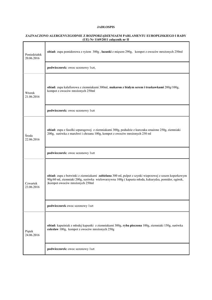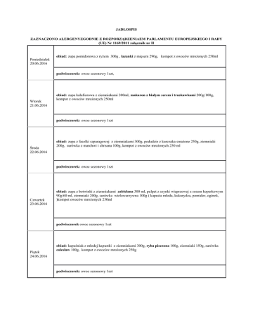 JADŁOSPIS ZAZNACZONO ALERGENYZGODNIE Z ROZPORZĄDZENIAEM PARLAMENTU EUROPEJSKIEGO I RADY (UE) Nr 1169/2011 załącznik nr II Poniedziałek 20.06.2016 obiad: zupa pomidorowa z ryżem 300g , łazanki z mięsem 290g, kompot z owoców mrożonych 250ml podwieczorek: owoc sezonowy 1szt, Wtorek 21.06.2016 obiad: zupa kalafiorowa z ziemniakami 300ml, makaron z białym serem i truskawkami 200g/100g, kompot z owoców mrożonych 250ml podwieczorek: owoc sezonowy 1szt Środa 22.06.2016 obiad: zupa z fasolki szparagowej z ziemniakami 300g, podudzie z kurczaka smażone 250g, ziemniaki 200g, surówka z marchwi i chrzanu 100g, kompot z owoców mrożonych 250 ml podwieczorek: owoc sezonowy 1szt Czwartek 23.06.2016 obiad: zupa z botwinki z ziemniakami zabielana 300 ml, pulpet z szynki wieprzowej z sosem koperkowym 90g/60 ml, ziemniaki 200g, surówka wielowarzywna 100g ( kapusta młoda, kukurydza, pomidor, ogórek, )kompot owoców mrożonych 250ml podwieczorek owoc sezonowy 1szt Piątek 24.06.2016 obiad: kapuśniak z młodej kapustki z ziemniakami 300g, ryba pieczona 100g, ziemniaki 150g, surówka colesław 100g, kompot z owoców mrożonych 250g podwieczorek: owoc sezonowy 1szt JADŁOSPIS dieta bezglutenowa ZAZNACZONO ALERGENYZGODNIE Z ROZPORZĄDZENIAEM PARLAMENTU EUROPEJSKIEGO I RADY (UE) Nr 1169/2011 załącznik nr II Poniedziałek 20.06.2016 obiad: zupa pomidorowa z ryżem 300g , łazanki ( makaron bezglutenowy) z mięsem 290g, kompot z owoców mrożonych 250ml podwieczorek: owoc sezonowy 1szt, Wtorek 21.06.2016 obiad: zupa kalafiorowa z ziemniakami 300ml, makaron z białym serem i truskawkami 200g/100g, kompot z owoców mrożonych 250ml podwieczorek: owoc sezonowy 1szt Środa 22.06.2016 obiad: zupa z fasolki szparagowej z ziemniakami 300g, podudzie z kurczaka smażone 250g, ziemniaki 200g, surówka z marchwi i chrzanu 100g, kompot z owoców mrożonych 250 ml podwieczorek: owoc sezonowy 1szt Czwartek 23.06.2016 obiad: zupa z botwinki z ziemniakami zabielana 300 ml, pulpet z szynki wieprzowej z sosem koperkowym 90g/60 ml, ziemniaki 200g, surówka wielowarzywna 100g ( kapusta młoda, kukurydza, pomidor, ogórek, )kompot owoców mrożonych 250ml podwieczorek owoc sezonowy 1szt Piątek 24.06.2016 obiad: kapuśniak z młodej kapustki z ziemniakami 300g, ryba pieczona soute 100g, ziemniaki 150g, surówka colesław 100g, kompot z owoców mrożonych 250g podwieczorek: owoc sezonowy 1szt JADŁOSPIS dieta bezmleczna ZAZNACZONO ALERGENYZGODNIE Z ROZPORZĄDZENIAEM PARLAMENTU EUROPEJSKIEGO I RADY (UE) Nr 1169/2011 załącznik nr II Poniedziałek 20.06.2016 obiad: zupa pomidorowa z ryżem 300g , łazanki z mięsem 290g, kompot z owoców mrożonych 250ml podwieczorek: owoc sezonowy 1szt, Wtorek 21.06.2016 obiad: zupa kalafiorowa z ziemniakami 300ml, makaron z truskawkami 200g/100g, kompot z owoców mrożonych 250ml podwieczorek: owoc sezonowy 1szt Środa 22.06.2016 obiad: zupa z fasolki szparagowej z ziemniakami 300g, podudzie z kurczaka smażone 250g, ziemniaki 200g, surówka z marchwi i chrzanu 100g, kompot z owoców mrożonych 250 ml podwieczorek: owoc sezonowy 1szt Czwartek 23.06.2016 obiad: zupa z botwinki z ziemniakami 300 ml, pulpet z szynki wieprzowej z sosem koperkowym 90g/60 ml, ziemniaki 200g, surówka wielowarzywna 100g ( kapusta młoda, kukurydza, pomidor, ogórek, )kompot owoców mrożonych 250ml podwieczorek owoc sezonowy 1szt Piątek 24.06.2016 obiad: kapuśniak z młodej kapustki z ziemniakami 300g, ryba pieczona 100g, ziemniaki 150g, surówka colesław niezabielana 100g, kompot z owoców mrożonych 250g podwieczorek: owoc sezonowy 1szt zupy, surówki niezabielane