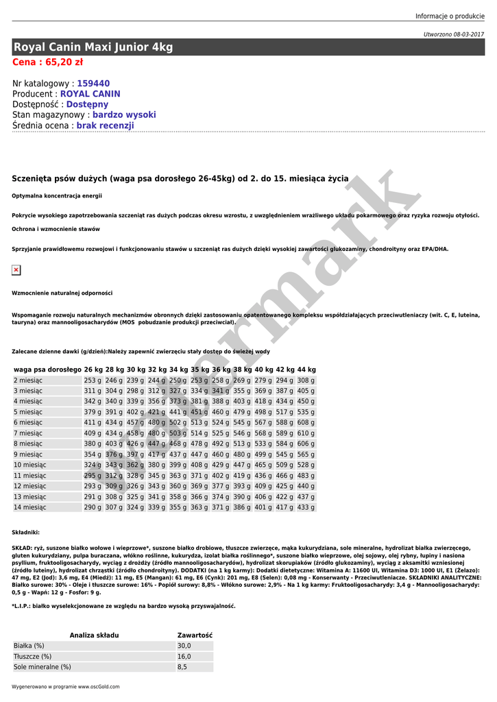 Informacje o produkcie Utworzono 08-03-2017 Royal Canin Maxi Junior 4kg Cena : 65,20 zł Nr katalogowy : 159440 Producent : ROYAL CANIN Dostępność : Dostępny Stan magazynowy : bardzo wysoki Średnia ocena : brak recenzji Optymalna koncentracja energii er m ar k Sczenięta psów dużych (waga psa dorosłego 26-45kg) od 2. do 15. miesiąca życia Pokrycie wysokiego zapotrzebowania szczeniąt ras dużych podczas okresu wzrostu, z uwzględnieniem wrażliwego układu pokarmowego oraz ryzyka rozwoju otyłości. Ochrona i wzmocnienie stawów Sprzyjanie prawidłowemu rozwojowi i funkcjonowaniu stawów u szczeniąt ras dużych dzięki wysokiej zawartości glukozaminy, chondroityny oraz EPA/DHA. Wzmocnienie naturalnej odporności Wspomaganie rozwoju naturalnych mechanizmów obronnych dzięki zastosowaniu opatentowanego kompleksu współdziałających przeciwutleniaczy (wit. C, E, luteina, tauryna) oraz mannooligosacharydów (MOS pobudzanie produkcji przeciwciał). Zalecane dzienne dawki (g/dzień):Należy zapewnić zwierzęciu stały dostęp do świeżej wody waga psa dorosłego 26 kg 28 kg 30 kg 32 kg 34 kg 35 kg 36 kg 38 kg 40 kg 42 kg 44 kg 253 g 246 g 239 g 244 g 250 g 253 g 258 g 269 g 279 g 294 g 308 g 3 miesiąc 311 g 304 g 298 g 312 g 327 g 334 g 341 g 355 g 369 g 387 g 405 g 4 miesiąc 342 g 340 g 339 g 356 g 373 g 381 g 388 g 403 g 418 g 434 g 450 g at 2 miesiąc 5 miesiąc 379 g 391 g 402 g 421 g 441 g 451 g 460 g 479 g 498 g 517 g 535 g 6 miesiąc 411 g 434 g 457 g 480 g 502 g 513 g 524 g 545 g 567 g 588 g 608 g 7 miesiąc 409 g 434 g 458 g 480 g 503 g 514 g 525 g 546 g 568 g 589 g 610 g 8 miesiąc 380 g 403 g 426 g 447 g 468 g 478 g 492 g 513 g 533 g 584 g 606 g 9 miesiąc 354 g 376 g 397 g 417 g 437 g 447 g 460 g 480 g 499 g 545 g 565 g 324 g 343 g 362 g 380 g 399 g 408 g 429 g 447 g 465 g 509 g 528 g w 10 miesiąc 11 miesiąc 295 g 312 g 328 g 345 g 363 g 371 g 402 g 419 g 436 g 466 g 483 g 12 miesiąc 293 g 309 g 326 g 343 g 360 g 369 g 377 g 393 g 409 g 425 g 440 g 13 miesiąc 291 g 308 g 325 g 341 g 358 g 366 g 374 g 390 g 406 g 422 g 437 g 14 miesiąc 290 g 307 g 324 g 339 g 355 g 363 g 371 g 386 g 401 g 417 g 433 g Składniki: SKŁAD: ryż, suszone białko wołowe i wieprzowe*, suszone białko drobiowe, tłuszcze zwierzęce, mąka kukurydziana, sole mineralne, hydrolizat białka zwierzęcego, gluten kukurydziany, pulpa buraczana, włókno roślinne, kukurydza, izolat białka roślinnego*, suszone białko wieprzowe, olej sojowy, olej rybny, łupiny i nasiona psyllium, fruktooligosacharydy, wyciąg z drożdży (źródło mannooligosacharydów), hydrolizat skorupiaków (źródło glukozaminy), wyciąg z aksamitki wzniesionej (źródło luteiny), hydrolizat chrząstki (źródło chondroityny). DODATKI (na 1 kg karmy): Dodatki dietetyczne: Witamina A: 11600 UI, Witamina D3: 1000 UI, E1 (Żelazo): 47 mg, E2 (Jod): 3,6 mg, E4 (Miedź): 11 mg, E5 (Mangan): 61 mg, E6 (Cynk): 201 mg, E8 (Selen): 0,08 mg - Konserwanty - Przeciwutleniacze. SKŁADNIKI ANALITYCZNE: Białko surowe: 30% - Oleje i tłuszcze surowe: 16% - Popiół surowy: 8,8% - Włókno surowe: 2,9% - Na 1 kg karmy: Fruktooligosacharydy: 3,4 g - Mannooligosacharydy: 0,5 g - Wapń: 12 g - Fosfor: 9 g. *L.I.P.: białko wyselekcjonowane ze względu na bardzo wysoką przyswajalność. Analiza składu Zawartość Białka (%) 30,0 Tłuszcze (%) 16,0 Sole mineralne (%) 8,5 Wygenerowano w programie www.oscGold.com Skrobia (%) 28,3 Włókno surowe (%) 2,7 Wilgotność (%) 9,5 Włókno pokarmowe (%) 7,7 Kwas linolowy (%) 2,61 Kwasy tłuszczowe omega 6 (%) 2,77 Bezazotowe substancje wyciągowe (NFE) (%) 33,3 Energia metaboliczna (obliczona wg NRC85) (kcal/kg) 3.576,0 Energia metaboliczna (mierzona) (kcal/kg) 3.765,0 Sole mineralne Zawartość Wapń (%) 1,2 Żelazo (mg/kg) 232,0 Cynk (mg/kg) 248,0 Jod (mg/kg) 3,7 Miedź (mg/kg) 15,0 Witaminy er m ar k Mangan (mg/kg) 76,0 Zawartość Witamina A (UI/kg) 19.000,0 Cholina (mg/kg) 2.000,0 Witamina B1 (tiamina) (mg/kg) 4,3 Witamina B2 (ryboflawina) (mg/kg) 3,9 Witamina B5 (kwas pantotenowy) (mg/kg) 25,8 Witamina B3 (niacyna) (mg/kg) 15,3 Witamina B6 (pirydoksyna) (mg/kg) 8,4 Witamina D3 (UI/kg) 1.000,0 Biotyna (mg/kg) 1,1 Witamina C (mg/kg) 200,0 Witamina E (mg/kg) 500,0 Inne Zawartość Tauryna (mg/kg) 2.000,0 Luteina (mg/kg) 5,0 Glukozamina i chondroityna (mg/kg) 500,0 1,86 L-lizyna (%) 1,44 Metionina - cystyna (%) 1,23 w at Arginina (%)