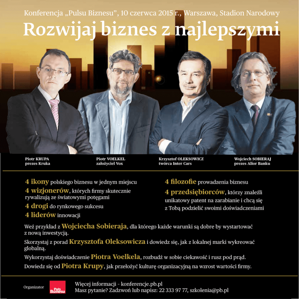 Konferencja „Pulsu Biznesu”, 10 czerwca 2015 r., Warszawa, Stadion Narodowy Rozwijaj biznes biznes zznajlepszymi najlepszymi Rozwijaj Konferencja „Pulsu Biznesu”, 6 października 2014 r., Warszawa, Stadion Narodowy Rafał PiotrBrzoska KRUPA prezes Integer.pl prezesGrupy Kruka dr Piotr LeszekVOELKEL Czarnecki przedsiębiorca założyciel Vox Adam Góral OLEKSOWICZ Krzysztof prezes Asseco twórca InterPoland Cars Michał Sołowow Wojciech SOBIERAJ przedsiębiorca, giełdowy prezesinwestor Alior Banku 44 ikony 44 filozofie ikonypolskiego polskiego biznesu biznesu w w jednym jednym miejscu miejscu filozofieprowadzenia prowadzenia biznesu biznesu 44 twórców giełdowych gigantów 44 osoby z czołówki rankingów najbardziej wizjonerów, których firmy skutecznie przedsiębiorców , którzy znaleźli wpływowych osób polskiej gospodarki ze światowymi 4rywalizują wizjonerów , którychpotęgami firmy skutecznie unikatowy patent na zarabianie i chcą się rywalizują ze światowymi potęgami 4 drogi do rynkowego sukcesu 4z Tobą przedsiębiorców , którzy znaleźli podzielić swoimi doświadczeniami 44 drogi do rynkowego sukcesu unikatowy patent na zarabianie i chcą się liderów innowacji 4 liderów innowacji podzielić z Tobą swoimi doświadczeniami Weź przykład z Wojciecha Sobieraja, dla którego każde warunki są dobre by wystartować z nową inwestycją. BrzoskiOleksowicza , który zdradzi tajniki kreowania marki. Weź przykład z Rafała z porad Skorzystaj Krzysztofa i dowiedz się, jakmiędzynarodowej z lokalnej marki wykreować globalną.się od Leszka Dowiedz Czarneckiego, jakie cechy powinieneś posiadać jako skuteczny przywódca. Wykorzystaj doświadczenie , rozbudź wrywalizacji sobie ciekawość i rusz pod prąd. Skorzystaj z porad AdamaPiotra GóralaVoelkela odnośnie skutecznej ze światowymi gigantami. Dowiedz się od Piotra Krupy , jak przełożyć kulturę organizacyjną wartości firmy. Wykorzystaj doświadczenie Michała Sołowowa , który podpowie,na jakwzrost możesz rozwinąć firmę dzięki fuzjom i przejęciom. Organizator Organizator Więcej informacji – konferencje.pb.pl Więcej informacji – konferencje.pb.pl Masz pytanie? Zadzwoń lub napisz: 22 333 97 77, [email protected] Masz pytanie? Zadzwoń lub napisz: 22 333 97 77, [email protected] Piotr Krupa prezes zarządu, współzałożyciel i współwłaściciel KRUK Krzysztof Oleksowicz, Członek Zarządu Inter Cars SA. Dyrektor ds. Inwestycji Na początku nowego wieku, Piotr Krupa dostrzegł niszę rynkową i postanowił skoncentrować się na zarządzaniu należnościami masowymi. Dziś jest prezesem i znaczącym akcjonariuszem największej grupy kapitałowej zarządzającej wierzytelnościami. W skład Grupy KRUK wchodzi m.in. Rejestr Dłużników ERIF BIG S.A., Kancelaria Prawna RAVEN, spółka sekurytyzacyjna Secapital, podmioty prowadzące działalność w Rumunii, Czechach i na Słowacji oraz w Niemczech. Grupa KRUK jest partnerem banków i innych instytucji finansowych, ubezpieczycieli, operatorów telefonii stacjonarnej i komórkowej, platform telewizyjnych i innych dostawców usług o charakterze masowym oraz przedsiębiorców działających na rynku B2B. Od maja 2011 KRUK S.A. jest notowany na GPW w Warszawie. IPO spółki na warszawskim parkiecie został uznany za najlepszy debiut giełdowy roku 2011 oraz wyróżnione nagrodą W 2014 r. KRUK S.A. zdobył pierwsze miejsce w rankingu Giełdowa Spółka Roku organizowanego przez dziennik „Puls Biznesu”. W 2015 roku Piotr Krupa znalazł się na liście magazynu Forbes wśród 100 najbogatszych Polaków. Założyciel Inter Cars. Absolwent filozofii w Akademii Teologii Katolickiej w Warszawie (obecnie Uniwersytet Kardynała Stefana Wyszyńskiego w Warszawie). W latach 70 tych jeździł do Niemiec, by tam pracować w warsztacie samochodowym. W latach 19781979 pracował jako mechanik w Bazie Usług Transportowych. W latach 1980-1986 rozpoczął swoja działalność gospodarczą Pomoc Drogowa oraz uczestniczył w wyprawach wysokogórskich. Wojciech Sobieraj, Prezes Zarządu Alior Banku Od kwietnia 2008 r. pełni funkcję Prezesa Zarządu Alior Bank S.A. W latach 2002-2006 zajmował stanowisko Wiceprezesa Zarządu Banku BPH S.A., gdzie był odpowiedzialny za Pion Bankowości Detalicznej. W okresie zatrudnienia w Banku BPH S.A. pełnił również funkcje Przewodniczącego Rad Nadzorczych Górnośląskiego Banku Gospodarczego S.A. oraz BPH Banku Hipotecznego S.A. Od 1997 do 2002 roku był pracownikiem, menedżerem i partnerem The Boston Consulting Group (BCG) w Bostonie i Londynie oraz jednym z twórców biura BCG w Warszawie, gdzie pełnił funkcję partnera i Wiceprezesa. W BCG zajmował również stanowisko Dyrektora Usług Finansowych w Europie Środkowej i Wschodniej. Był także ekspertem w dziedzinie przejęć i połączeń oraz rynku płatności bankowych. W latach 1991-1994 Wojciech Sobieraj był właścicielem firmy Central European Financial Group w Nowym Jorku zajmującej się analizą rynków kapitałowych Europy Wschodniej. W tym samym okresie zdobył licencję maklera na Wall Street oraz pracował jako asystent w Departamencie Finansów i Operacji na New York University. Ukończył Szkołę Główną Handlową w Warszawie. W 1993 podjął naukę w New York University, Stern School of Business i w 1995 roku uzyskał dyplom Master of Business Administration. Od 1990 roku współzałożyciel Inter Cars s.j. gdzie pełnił funkcję Prezesa Zarządu. Po przekształceniu w spółkę akcyjną do roku 2010 nadal pełnił funkcje Prezesa Zarządu, zachowując jednocześnie największy pakiet akcji, który dziś liczy 31,63 %. Od 2010 pełni funkcję Członka Zarządu, kreując strategię firmy. Pasjonat motoryzacji i wszystkiego, co z tym związane. Posiada aktywną licencję rajdową, dzięki czemu bierze udział w rajdach samochodowych. Drugą dyscypliną, której Krzysztof Oleksowicz oddaje się z równą pasją jest golf. Piotr Voelk