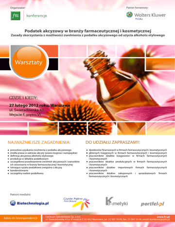 Patron honorowy: Organizator: konferencje Podatek akcyzowy w branży farmaceutycznej i kosmetycznej Zasady skorzystania z możliwości zwolnienia z podatku akcyzowego od użycia alkoholu etylowego Warsztaty GDZIE I KIEDY: 27 lutego 2012 roku, Warszawa ul. Świeradowska 43, Wejscie F, piętro VI NAJWAŻNIEJSZE ZAGADNIENIA: procedura uzyskania zwolnienia z podatku akcyzowego źródła prawa w zakresie akcyzy (prawo krajowe i europejskie) definicja akcyzowa alkoholu etylowego produkcja w składzie podatkowym szczegółowe przedstawienie zwolnień akcyzowych i warunków ich stosowania w branży farmaceutycznej i kosmetycznej istniejące ryzyka podatkowe związane z akcyzą banderolowanie szczególny nadzór podatkowy DO UDZIAŁU ZAPRASZAMY: dyrektorów finansowych w firmach farmaceutycznych i kosmetycznych głównych księgowych w firmach farmaceutycznych i kosmetycznych pracowników działów księgowości w firmach farmaceutycznych i kosmetycznych pracowników działów produkcyjnych w firmach farmaceutycznych i kosmetycznych pracowników działów importowych firmach farmaceutycznych i kosmetycznych pracowników działów zakupowych i sprzedażowych firmach farmaceutycznych i kosmetycznych Patroni medialni: Adres do korespondencji: Centrum Szkoleniowe Sp. z o.o. www.frr.pl ul. Świeradowska 43 p. VI wejście F, 02-662 Warszawa, tel. 22 583 10 00, fax. 22 583 10 09, email: [email protected] konferencje Podatek akcyzowy w branży farmaceutycznej i kosmetycznej Zasady skorzystania z możliwości zwolnienia z podatku akcyzowego od użycia alkoholu etylowego Warsztaty Warszawa 27.02.2012 r. Szanowni Państwo, Alkohole są nie tylko używane jako surowiec, lecz również do celów okołoprodukcyjnych, np. do czyszczenia i dezynfekcji linii i pomieszczeń. Możliwość zastosowania wyłączenia spod opodatkowania – zwolnienia od akcyzy – zużywanych w powyższych celach alkoholi może więc w znacznym stopniu przyczynić się do ograniczenia kosztów produkcyjnych. W wielu jednak przypadkach, aby akcyza nie była płacona, konieczne jest spełnienie określonych warunków formalnych. Dlatego też Centrum Szkoleniowe Sp. z o.o. – firma należąca do Grupy Fundacji Rozwoju Rachunkowości w Polsce, organizuje warsztat „Podatek akcyzowy w branży farmaceutycznej i kosmetycznej. Zasady skorzystania z możliwości zwolnienia z podatku akcyzowego od użycia alkoholu etylowego”. Warsztat odbędzie się 27 lutego 2012 roku w Warszawie w Fundacji Rozwoju Rachunkowości przy ul. Świeradowskiej 43, wejście F, piętro VI . Udział w warsztacie pomoże Państwu zapoznać się z warunkami korzystania z możliwych do zastosowania w Państwa działalności zwolnień akcyzowych oraz wskaże sposoby uniknięcia istniejących ryzyk podatkowych. Korzyści z udziału w warsztacie: pogłębienie wiedzy w zakresie procedur uzyskiwania zwolnienia z podatku akcyzowego od użycia alkoholu etylowego w branży farmaceutycznej i kosmetycznej poznanie zasad, które przyspieszają uzyskanie zwolnienia z podatku akcyzowego od użycia alkoholu etylowego w branży farmaceutycznej i kosmetycznej usprawnienie procesu kompletowania wymaganej dokumentacji okazja do wymiany doświadczeń z przedstawicielami z branży farmaceutycznej i kosmetycznej możliwość uzyskania pomocy w wyjaśnieniu wątpliwości proceduralnych Liczymy, iż zaprezentowana podczas warsztatu tematyka ułatwi przygotowanie Państwa przedsiębiorstw do skorzystania ze zwolnień od podatku akcyzowego, wpływając tym samym na ograniczenie kosztów produkcyjnych i prężny rozwój Państwa działalności. Adres do korespondencji: Z poważaniem, Emilia Nurzyńska Menedżer Projektu [email protected] Centrum Szkoleniowe Sp. z o.o. www.frr.pl ul. Świeradowska 43 p. VI wejście F, 02-662 Warszawa, tel. 22 583 10 00, fax. 22 583 10 09, email: [email protected] konferencje Podatek akcyzowy w branży farmaceutycznej i kosmetycznej Zasady skorzystania z możliwości zwolnienia z podatku akcyzowego od użycia alkoholu etylowego Warsztaty Warszawa 27.02.2012 r. Program: 08:45-09:15 Rejestracja, powitalna kawa 09:15-10:30 Wprowadzenie do kwestii akcyzowych Źródła prawa w zakresie akcyzy (prawo krajowe i europejskie) Cechy charakterystyczne opodatkowania akcyzą: jednokrotność wąski zakres przedmiotowy procedura zawieszonego poboru podatku akcyzowego Definiowanie alkoholu przez przepisy akcyzowe Definicja krajowa Definicja europejska 10:30-10:45 Przerwa kawowa 10:45-12:15 Produkcja w składzie podatkowym Instytucja składu podatkowego – możliwość czy obowiązek Zużycie alkoholu do produkcji w składzie podatkowym Prawo do obniżenia należnej akcyzy Katalog zwolnień akcyzowych Przedstawienie wszystkich zwolnień jakie mogą być stosowane w branży farmaceutycznej i kosmetycznej Omówienie warunków koniecznych do skutecznego stosowania zwolnień Wskazanie ryzyk podatkowych związanych ze stosowaniem poszczególnych zwolnień 12:15-12:30 Przerwa kawowa Pozostałe kwestie Banderolowanie Szczególny nadzór podatkowy Panel dyskusyjny 13:00 Zakończenie warsztatów, rozdanie certyfikatów uczestnictwa 13:15 Lunch Adres do korespondencji: Centrum Szkoleniowe Sp. z o.o. www.frr.pl ul. Świeradowska 43 p. VI wejście F, 02-662 Warszawa, tel. 22 583 10 00, fax. 22 583 10 09, email: [email protected] konferencje Podatek akcyzowy w branży farmaceutycznej i kosmetycznej Zasady skorzystania z możliwości zwolnienia z podatku akcyzowego od użycia alkoholu etylowego Warsztaty Warszawa 27.02.2012 r. Warsztat poprowadzi: Teresa Sławińska-Choryło Prawnik, doradca podatkowy, Tax manager w firmie PETROLOT Sp. z o.o.. Ukończyła z wyróżnieniem Wydział Prawa i Administracji Uniwersytetu Warszawskiego a także Podyplomowe Studium Podatków i Prawa Podatkowego na Uniwersytecie Warszawskim. Specjalizuje się w opodatkowaniu VAT i akcyzą, w szczególności w branży alkoholowej, paliwowej, energetycznej. Ma ponad 10-letnie doświadczenie w doradztwie podatkowym. R