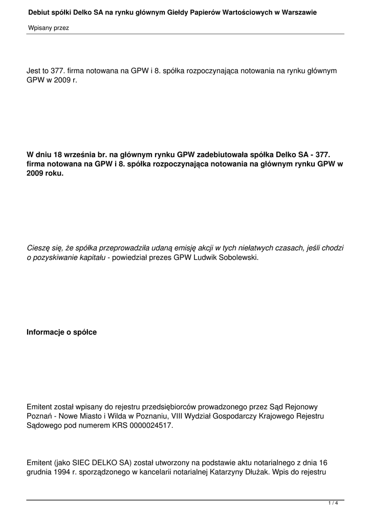 Debiut spółki Delko SA na rynku głównym Giełdy Papierów Wartościowych w Warszawie Wpisany przez Jest to 377. firma notowana na GPW i 8. spółka rozpoczynająca notowania na rynku głównym GPW w 2009 r. W dniu 18 września br. na głównym rynku GPW zadebiutowała spółka Delko SA - 377. firma notowana na GPW i 8. spółka rozpoczynająca notowania na głównym rynku GPW w 2009 roku. Cieszę się, że spółka przeprowadziła udaną emisję akcji w tych niełatwych czasach, jeśli chodzi o pozyskiwanie kapitału - powiedział prezes GPW Ludwik Sobolewski. Informacje o spółce Emitent został wpisany do rejestru przedsiębiorców prowadzonego przez Sąd Rejonowy Poznań - Nowe Miasto i Wilda w Poznaniu, VIII Wydział Gospodarczy Krajowego Rejestru Sądowego pod numerem KRS 0000024517. Emitent (jako SIEC DELKO SA) został utworzony na podstawie aktu notarialnego z dnia 16 grudnia 1994 r. sporządzonego w kancelarii notarialnej Katarzyny Dłużak. Wpis do rejestru 1/4 Debiut spółki Delko SA na rynku głównym Giełdy Papierów Wartościowych w Warszawie Wpisany przez przedsiębiorców nastąpił 28 lutego 1995 r. W skład grupy kapitałowej, do której należy emitent, wchodzi DELKO SA jako jednostka dominująca i trzy jednostki zależne: Delko Otto Sp. z o.o., Delko RDT Księżycowa Sp. z o.o. oraz Nika Sp. z o.o. Grupa kapitałowa emitenta prowadzi działalność handlową i usługową w zakresie przemysłu chemicznego, kosmetycznego, farmaceutycznego oraz spożywczego. Podstawowy przedmiot działalności Grupy dotyczy: - sprzedaży wyrobów chemicznych oraz artykułów użytku domowego i osobistego (kosmetyków i artykułów toaletowych), - sprzedaży wyrobów farmaceutycznych i medycznych, - sprzedaży hurtowej i wyrobów tytoniowych, - pozostałej sprzedaży hurtowej. Głównymi kategoriami produktów, których sprzedażą zajmuje się spółka, są produkty chemii gospodarczej, kosmetyków, produktów higienicznych oraz opakowań. DELKO współpracuje w tym zakresie z takimi koncernami, jak: SC Johnson, Henkel, TZMO, ICT, Inco, Kimberly Clark, L'Oreal, Metsa Tissue, Global Cosmed, Intersilesia, Navo (Procter & Gamble) i inne. W swojej ofercie DELKO posiada także produkty sprzedawane pod własnymi markami. Są to następujące linie produktowe: Filip, Filip Fresh, Blue, Teak, Delikato, Oskar, Tanius, Tytus oraz Delko Professional . Producentami produktów z własnych linii produktowych są w 99% firmy polskie. Asortyment produktów własnych, to 220 indeksów. 2/4 Debiut spółki Delko SA na rynku głównym Giełdy Papierów Wartościowych w Warszawie Wpisany przez Wyniki oferty publicznej W ofercie publicznej oferowano 1.500.000 akcji zwykłych na okaziciela serii C nowej emisji. Oferta publiczna została podzielona na transze. Na podstawie book buildingu cena emisyjna akcji została ustalona na poziomie 9,50 zł. W dniu 9.09.2009 r. dokonany został przydział oferowanych w Ofercie Publicznej 1.500.000 akcji zwykłych na okaziciela serii C nowej emisji po cenie 9,50 zł. W transzy małych inwestorów przydzielono 375.000 akcji serii C. W transzy dużych inwestorów przydzielono 1.125.000 akcji serii C. W transzy małych inwestorów średnia stopa redukcji wyniosła 85,87%. Wartość środków pozyskanych z nowej emisji wyniosła 14,25 mln zł. 3/4 Debiut spółki Delko SA na rynku głównym Giełdy Papierów Wartościowych w Warszawie Wpisany przez Papiery wartościowe wprowadzane do obrotu: 1.500.000 praw do akcji zwykłych na okaziciela serii C. Po rejestracji podwyższenia kapitału zakładowego w wyniku emisji akcji serii C, do obrotu wprowadzonych zostanie 5.980.000 akcji zwykłych na okaziciela serii A , B i C. Zamieszczone w prospekcie wyniki finansowe w latach 2005-2008 (w tys. zł): 1.01 - 31.12.2008 r.: 6.251 1.01 - 31.12.2007 r.: 3.564 1.01 - 31.12.2006 r.: 3.028 1.01 - 31.12.2005 r.: 2.214 4/4