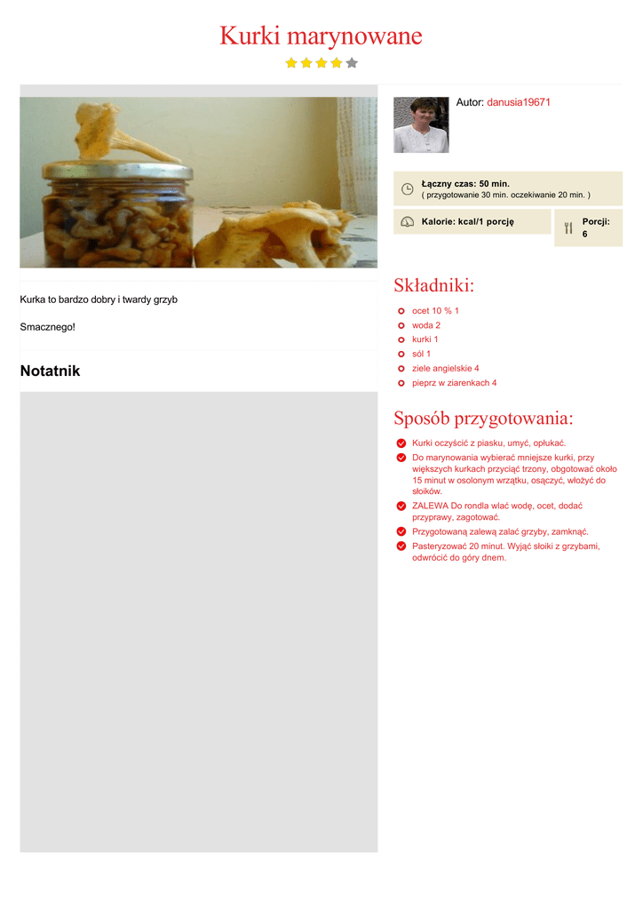 Kurki marynowane Autor: danusia19671 Łączny czas: 50 min. ( przygotowanie 30 min. oczekiwanie 20 min. ) Kalorie: kcal/1 porcję Kurka to bardzo dobry i twardy grzyb Porcji: 6 Składniki: ocet 10 % 1 Smacznego! woda 2 kurki 1 sól 1 Notatnik ziele angielskie 4 pieprz w ziarenkach 4 Sposób przygotowania: Kurki oczyścić z piasku, umyć, opłukać. Do marynowania wybierać mniejsze kurki, przy większych kurkach przyciąć trzony, obgotować około 15 minut w osolonym wrzątku, osączyć, włożyć do słoików. ZALEWA Do rondla wlać wodę, ocet, dodać przyprawy, zagotować. Przygotowaną zalewą zalać grzyby, zamknąć. Pasteryzować 20 minut. Wyjąć słoiki z grzybami, odwrócić do góry dnem.