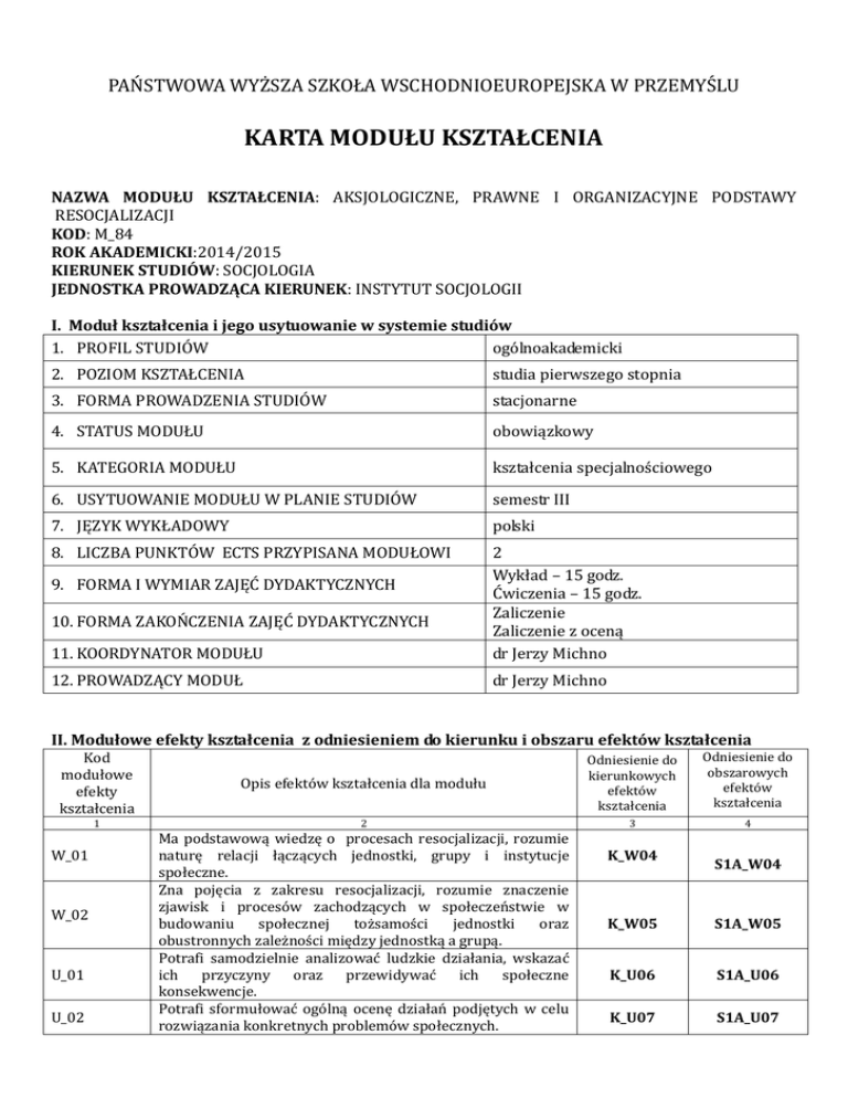 PAŃSTWOWA WYŻSZA SZKOŁA WSCHODNIOEUROPEJSKA W PRZEMYŚLU KARTA MODUŁU KSZTAŁCENIA NAZWA MODUŁU KSZTAŁCENIA: AKSJOLOGICZNE, PRAWNE I ORGANIZACYJNE PODSTAWY RESOCJALIZACJI KOD: M_84 ROK AKADEMICKI:2014/2015 KIERUNEK STUDIÓW: SOCJOLOGIA JEDNOSTKA PROWADZĄCA KIERUNEK: INSTYTUT SOCJOLOGII I. Moduł kształcenia i jego usytuowanie w systemie studiów 1. PROFIL STUDIÓW ogólnoakademicki 2. POZIOM KSZTAŁCENIA studia pierwszego stopnia 3. FORMA PROWADZENIA STUDIÓW stacjonarne 4. STATUS MODUŁU obowiązkowy 5. KATEGORIA MODUŁU kształcenia specjalnościowego 6. USYTUOWANIE MODUŁU W PLANIE STUDIÓW semestr III 7. JĘZYK WYKŁADOWY polski 8. LICZBA PUNKTÓW ECTS PRZYPISANA MODUŁOWI 11. KOORDYNATOR MODUŁU 2 Wykład – 15 godz. Ćwiczenia – 15 godz. Zaliczenie Zaliczenie z oceną dr Jerzy Michno 12. PROWADZĄCY MODUŁ dr Jerzy Michno 9. FORMA I WYMIAR ZAJĘĆ DYDAKTYCZNYCH 10. FORMA ZAKOŃCZENIA ZAJĘĆ DYDAKTYCZNYCH II. Modułowe efekty kształcenia z odniesieniem do kierunku i obszaru efektów kształcenia Kod modułowe efekty kształcenia 1 W_01 W_02 U_01 U_02 Opis efektów kształcenia dla modułu Odniesienie do kierunkowych efektów kształcenia Odniesienie do obszarowych efektów kształcenia 2 3 4 Ma podstawową wiedzę o procesach resocjalizacji, rozumie naturę relacji łączących jednostki, grupy i instytucje społeczne. Zna pojęcia z zakresu resocjalizacji, rozumie znaczenie zjawisk i procesów zachodzących w społeczeństwie w budowaniu społecznej tożsamości jednostki oraz obustronnych zależności między jednostką a grupą. Potrafi samodzielnie analizować ludzkie działania, wskazać ich przyczyny oraz przewidywać ich społeczne konsekwencje. Potrafi sformułować ogólną ocenę działań podjętych w celu rozwiązania konkretnych problemów społecznych. K_W04 S1A_W04 K_W05 S1A_W05 K_U06 S1A_U06 K_U07 S1A_U07 Skutecznie komunikuje się z otoczeniem społecznym, współdziała w grupie, przyjmuje różne role społeczne. K_01 K_K02 S1A_K02 III. Treści kształcenia – oddzielnie dla każdej formy zajęć dydaktycznych (W – wykład; C - ćwiczenia; K – konwersatorium; L - laboratorium; PR – projekt, PKZ - praktyka zawodowa; WT – Warsztat) Kod form zajęć dydaktyczny ch 1 W1 W2 W3 W4 W5 W6 W7 W8 C1 C2 C3 C4 C5 C6 C7 C8 Razem Szczegółowy opis treści realizowanych w ramach zajęć wg form zajęć dydaktycznych Liczba godzin 2 3 wykład Wprowadzenie do problematyki aksjologicznych, prawnych i organizacyjnych podstaw resocjalizacji. Cele i zadania resocjalizacji. Spektrum oddziaływań resocjalizacyjnych. Aksjologiczne podstawy resocjalizacji. Prawne aspekty resocjalizacji. Sposoby myślenia o systemach resocjalizacji. Modele resocjalizacji. Środki wychowawcze i poprawcze. ćwiczenia Kryteria przystosowania społecznego. Niedostosowanie społeczne jako przedmiot zabiegów resocjalizacyjnych. Typologia niedostosowania społecznego. Organizacja systemu resocjalizacji w Polsce. Metody pracy resocjalizacyjnej. Resocjalizacja środowisku otwartym. Społeczne uwarunkowania skuteczności zabiegów resocjalizacyjnych. Test wiedzy 1 2 2 2 2 2 2 2 2 2 2 2 2 2 2 1 30 IV. Literatura podstawowa i uzupełniająca obowiązująca do zaliczenia modułu Literatura podstawowa Jaworska A. (red), Resocjalizacja. Zagadnienia prawne, społeczne i metodyczne, Kraków 2009. Kozaczuk F. (red.), Prawne i socjokulturowe uwarunkowania profilaktyki społecznej i resocjalizacyjnej, Rzeszów 2009. Kuć M., Prawne podstawy resocjalizacji, Warszawa 2011. Pytka L., Pedagogika resocjalizacyjna. Wybrane zagadnienia teoretyczne, diagnostyczne i metodyczne, Warszawa 2008. Rybczyńska-Abdel Kawy D., Heine M., Karłyk-Ćwik A. (red., red.), Współczesne wyzwania dla teorii i praktyki resocjalizacyjnej, Toruń 2013. Literatura uzupełniająca Marzec-Holka K., Głowik T., Bilska E., Iwanicki H. (red., red.), Profilaktyka i resocjalizacja. Od dysfunkcji do funkcjonalności, Warszawa 2012. Sołtysiak T., Latoś A. (red., red.), Działalność profilaktyczna i resocjalizacyjna w środowisku otwartym instytucji wychowawczych, poprawczych oraz karnych, Bydgoszcz 2010. Wojnarska A. (red), Diagnostyka resocjalizacyjna. Wybrane zagadnienia, Wydawnictwo Uniwersytetu Marii Curie-Skłodowskiej, Lublin 2010.
