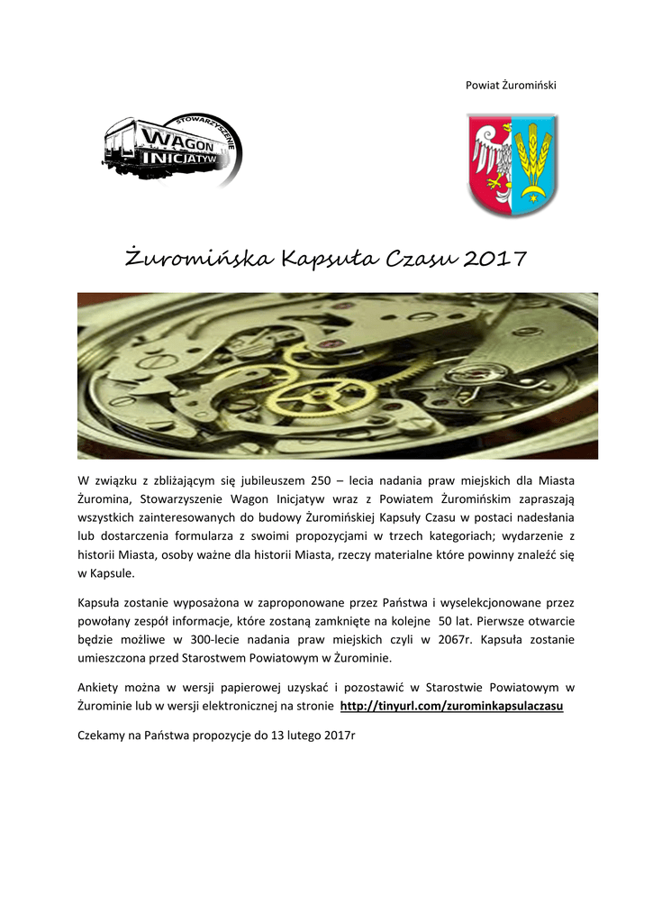 Powiat Żuromiński Żuromińska Kapsuła Czasu 2017 W związku z zbliżającym się jubileuszem 250 – lecia nadania praw miejskich dla Miasta Żuromina, Stowarzyszenie Wagon Inicjatyw wraz z Powiatem Żuromińskim zapraszają wszystkich zainteresowanych do budowy Żuromińskiej Kapsuły Czasu w postaci nadesłania lub dostarczenia formularza z swoimi propozycjami w trzech kategoriach; wydarzenie z historii Miasta, osoby ważne dla historii Miasta, rzeczy materialne które powinny znaleźć się w Kapsule. Kapsuła zostanie wyposażona w zaproponowane przez Państwa i wyselekcjonowane przez powołany zespół informacje, które zostaną zamknięte na kolejne 50 lat. Pierwsze otwarcie będzie możliwe w 300-lecie nadania praw miejskich czyli w 2067r. Kapsuła zostanie umieszczona przed Starostwem Powiatowym w Żurominie. Ankiety można w wersji papierowej uzyskać i pozostawić w Starostwie Powiatowym w Żurominie lub w wersji elektronicznej na stronie http://tinyurl.com/zurominkapsulaczasu Czekamy na Państwa propozycje do 13 lutego 2017r