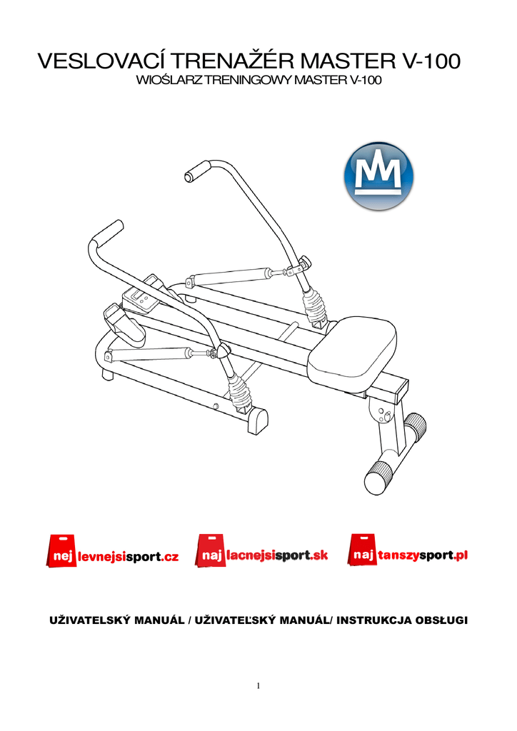 VESLOVACÍ TRENAŽÉR MASTER V-100 WIO LARZ TRENINGOWY MASTER V-100 1 CZ D kujeme, že jste koupili náš výrobek. P esto, že v nujeme veškeré úsilí, abychom zajistili nejlepší kvalitu našich výrobk , mohou se objevit jednotlivé vady i p ehlédnuté nedostatky. Pokud zjistíte vadu nebo chyb jící sou ástku, neváhejte a kontaktujte nás. SK: akujme, že ste si kúpili náš výrobok. Napriek tomu, že venujeme všetko úsilie, aby sme zaistili najlepšiu kvalitu naších výrobkov, môžu sa objavi jednotlivé vady i prehliadnuté nedostatky. Pokia zistite vadu, alebo chýbajúcu sú iastku, neváhajte a kontaktujte nás. PL: Dzi kujemy za zakupienie naszego produktu. Z naszej strony dokładamy wszelkich stara , aby oferowane Pa stwu produkty miały najwy sz jako . Mimo naszych stara , mo e si jednak zdarzy , e napotkacie Pa stwo na drobne usterki, je eli tak si stanie, prosimy o kontakt (równie w sytuacji zauwa enia braku której z cz ci). POZNÁMKY TÝKAJÍCÍ SE BEZPE NOSTI / POZNÁMKY TÝKAJ/CE SA BEZPE NOSTI/ UWAGI DOTYCZ CE BEZPIECZE STWA CZ Tento výrobek byl navržen výlu n k domácímu využití dosp lými osobami. Záruka se nevztahuje na výrobky využívané ve fitness-klubech, posilovnách atd. SK : Tento výrobok bol navrhnutý výlu ne k domácemu využitiu dospelými osobami. Záruka sa nevz ahuje na výrobky využívané vo fitnes kluboch, posil ovniach at . PL: Urz dzenie przeznaczone jest dla osób dorosłych, wył cznie do u ytku domowego. Gwarancja nie dotyczy urz dze u ywanych w fitness klubach, siłowniach itp. CZ Tento výrobek byl navržen tak, aby zajiš oval bezpe nost, avšak musí být dodržována ur itá pravidla: SK:Tento výrobok bol navrhnutý tak, aby zais oval bezpe nos , však musia by dodržané ur ité pravidlá: PL: Produkt ten został zaprojektowany tak, aby zapewniał bezpiecze stwo. Podczas korzystania z niego, nale y jednak stosowa si do poni szych reguł: CZ B hem cvi ení a po ukon ení tréninku zamezte p ístupu k ná iní d tem a zví at m. SK: Behom cvi enia a po ukon ení tréningu zamedzte prístup k náradiu de om a zvieratám. PL: Podczas wicze i po ich zako czeniu nale y uniemo liwi dzieciom i zwierz tom dost p do urz dzenia. CZ Ná iní m že být využíváno pouze jednou osobou (najednou). SK: Náradie môže by využívané iba jednou usobou (sú asne). PL: Sprz t mo e by u ywany tylko przez jedn osob (w jednym czasie) CZ Pokud se b hem cvi ení objeví bolesti hlavy i závrat , bolest v hrudníku nebo jiné znepokojující p íznaky, je t eba okamžit p erušit cvi ení a poradit se s léka em. 2 SK: Pokia sa v priebehu cvi enia prejavia bolesti hlavy, i závráte, bolesti v hrudníku, alebo iné znepokojujúce príznaky, je t eba okamžité preruši cvi enie a poradi sa s lekárom. PL: Je li podczas wicze zaczniecie Pa stwo odczuwa ból głowy, pojawi si zawroty głowy, ból w klatce piersiowej albo inne nieprzyjemne dolegliwo ci, nale y natychmiast przerwa wiczenia i skonsultowa si z lekarzem. CZ Používejte ná iní na istém a rovném povrchu. SK: Používajte náradie na istom a rovnom povrchu. Udržujte odstup rukou a nohou od pohyblivých sou ástí. PL: Sprz t nale y u ywa na czystej i płaskiej powierzchni. CZ Udržujte odstup rukou a nohou od pohyblivých sou ástí . SK: Udržujte odstup rúk a nôch od pohyblivých sú astí. PL: Nale y trzyma r ce i nogi w bezpiecznej odległo ci od ruchomych cz urz dzenia. CZ Nevkládejte do otvor žádné sou ástky. SK: Nevkladajte do otvorov žiadne sú iastky. PL: Nie wolno umieszcza w otworach adnych cz ci ci. CZ P ed montáží a zahájením cvi ení se podrobn seznamte s návodem. SK: Pred montážou a za iatkom cvi enia sa podrobne oboznámne s návodom. PL: Przed rozpocz ciem u ytkowania nale y uwa nie zapozna si z instrukcj obsługi i monta u urz dzenia. CZ P ed zahájením cvi ení vždy prove te rozcvi ku. SK: Pred za iatkom cvi enia vždy prevedte rozcvi ku. PL: Przed rozpocz ciem wicze nale y przeprowadzi rozgrzewk . CZ Ná iní využívejte pouze k ú el m uvedeným v tomto návodu. SK: Náradie využívajte iba k ú ely uvedenému v tomto návode. PL: Sprz t mo na wykorzystywa tylko dla celów opisanych w instrukcji obsługi. CZ Cvi te v pohodlném volném oble ení a sportovní obuvi. SK: Cvi te v pohodlnom vo nom oble ení a športovej obuvi. PL: Najlepiej wiczy si w ubraniu sportowym i w butach sportowych. CZ Používejte v souladu s ur ením. SK: Používajte v súlade s ur ením. PL: Nale y u ywa zgodnie z przeznaczeniem. CZ UPOZORN NÍ: P ED ZAHÁJENÍM TRÉNINKU SE PORA TE S LÉKA EM. JE TO NEZBYTNÉ V P ÍPAD OSOB STARŠÍCH 35 LET A OSOB, KTERÉ MAJÍ ZDRAVOTNÍ PROBLÉMY. P ED POUŽITÍM FITNESS-NÁ INÍ SI VŽDY P E T TE VŠECHNY NÁVODY. NENESEME ODPOV DNOST ZA ÚRAZY NEBO POŠKOZENÍ P EDM T , JEŽ BYLY ZP SOBENY NESPRÁVNÝM POUŽITÍM TOHOTO VÝROBKU. 3 SK: UPOZNENIE: P ED ZAHÁJENÍM TRÉNINGU SA PORADTE S LEKÁROM. JE TO NEVYHNUTÉ V PRÍPADE OsôB STARŠÍCH AKO 35 ROKOV A OsôB, KTORÉ MAJÚ ZDRAVOTNÉ PROBLÉMY. PRED POUŽITÍM FITNESS-NÁRADIA SI VŽDY PRE ÍTAJTE VŠETKY NÁVODY. NENESIEME ZODPOVEDNOS ZA ÚRAZY , ALEBO POŠKODENIE PREDMETU, KTORÉ BOLI SPôSOBENÉ NESPRÁVNÝM POUŽITÍM TOHTO VÝROBKU. PL: UWAGA: PRZED ROZPOCZ CIEM TRENINGU NALE Y SKONSULTOWA SI Z LEKARZEM I OMÓWI KWESTI STANU ZDROWIA. JEST TO WA NE PRZEDE WSZYSTKIM W PRZYPADKU OSÓB POWY EJ 35 LAT I OSÓB, KTÓRE MAJ PROBLEMY ZDROWOTNE.NALE Y DOKŁADNIE ZAPOZNA SI Z ZAŁ CZON INSTRUKCJ OBSŁUGI. NIE PONOSIMY ODPOWIEDZIALNO CI ZA USZKODZENIA, KTÓRE POWSTAN W WYNIKU NIEWŁA CIWEGO U YWANIA. CZ: D LEŽITÉ BEZPE NOSTNÍ INFORMACE: 1. TENTO STROJ BYL TESTOVÁN NORMOU EN957, JE ZA AZEN DO T ÍDY HC. 2. BRZDÍCÍ SYSTÉM JE NEZÁVISLÝ NA RYCHLOSTI. 3. TENTO STROJ JE UR EN POUZE PRO DOMÁCÍ Ú ELY. NEM ŽE BÝT POUŽIT PRO LÉKA SKÉ Ú ELY. 4. stroj je ur en pouze k domácímu použití, nem že být použit pro léka ské ú ely. Byl testován normou EN957 a j
