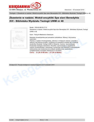 Utworzono : 02 wrzesień 2010 Teologia > Zbawienie w nadziei. Wokół encykliki Spe slavi Benedykta XVI - Biblioteka Wydziału Teologii UWM nr 48 Zbawienie w nadziei. Wokół encykliki Spe slavi Benedykta XVI - Biblioteka Wydziału Teologii UWM nr 48 Model : 978-83-88125-77-5 Zbawienie w nadziei. Wokół encykliki Spe slavi Benedykta XVI - Biblioteka Wydziału Teologii UWM nr 48 Autor : Parzych-Blakiewicz Katarzyna L Q S a Nadzieja chrześcijańska jest potrzebna człowiekowi. Mówią o niej autorzy natchnieni. Artykuły o nadziei chrześcijańskiej, zebrane w niniejszym zbiorze, powstały z zadumy nad treścią encykliki. Inicjatywa ich powstania zrodziła się w dyskusji studentów Wydziału Teologii UWM w Olsztynie. Autorzy, reprezentujący środowisko teologów katolickich i filozofów, wprowadzają w zagadnienie nadziei chrześcijańskiej, interpretują i komentują myśl papieską w perspektywie doktrynalnej oraz kreślą kierunki praktyki dydaktycznej i pastoralnej z uwzględnieniem wymagań stawianych w encyklice. i n r Cena : 21,20 zł Brutto ( 21,20 zł Netto) a g Dostępność: Pozycja dostępna w naszej księgarni od 01 wrzesień 2010 ę i s K kontakt : - [email protected] Strona 1 / {nb}