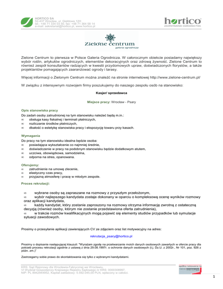 HORTICO SA 52-437 Wrocław, ul. Giełdowa 12H tel.: +48 71 334 03 50, fax: +48 71 364 58 14 e-mail: [email protected], www.hortico.pl Zielone Centrum to pierwsza w Polsce Galeria Ogrodnicza. W całorocznym obiekcie posiadamy największy wybór roślin, artykułów ogrodniczych, elementów dekoracyjnych oraz zdrową żywność. Zielone Centrum to również zespół konsultantów radzących w kwestii przydomowych upraw, doświadczonych florystów, a także projektantów pomagających zaaranżować ogrody i tarasy. Więcej informacji o Zielonym Centrum można znaleźć na stronie internetowej http://www.zielone-centrum.pl/ W związku z intensywnym rozwojem firmy poszukujemy do naszego zespołu osób na stanowisko: Kasjer/ sprzedawca Miejsce pracy: Wrocław - Psary Opis stanowiska pracy Do zadań osoby zatrudnionej na tym stanowisku należeć będą m.in.: obsługa kasy fiskalnej i terminali płatniczych, rozliczanie środków płatniczych, dbałość o estetykę stanowiska pracy i ekspozycję towaru przy kasach. • • • Wymagania Do pracy na tym stanowisku idealna będzie osoba: posiadająca wykształcenie co najmniej średnie, doświadczenie w pracy na podobnym stanowisku będzie dodatkowym atutem, uczciwa, obowiązkowa, samodzielna, odporna na stres, opanowana. • • • • Oferujemy: • zatrudnienie na umowę zlecenie, • elastyczny czas pracy, • przyjazną atmosferę i pracę w młodym zespole. Proces rekrutacji: • wybrane osoby są zapraszane na rozmowy z przyszłym przełożonym, • wybór najlepszego kandydata zostaje dokonany w oparciu o kompleksową ocenę wyników rozmowy oraz aplikacji kandydata, • każdy kandydat, który zostanie zaproszony na rozmowy otrzyma informację zwrotną z ostateczną decyzją (również osoby, którym nie zostanie przedstawiona oferta zatrudnienia), • w trakcie rozmów kwalifikacyjnych mogą pojawić się elementy studiów przypadków lub symulacje sytuacji zawodowych. Prosimy o przesyłanie aplikacji zawierających CV ze zdjęciem oraz list motywacyjny na adres: [email protected] Prosimy o dopisanie następującej klauzuli: "Wyrażam zgodę na przetwarzanie moich danych osobowych zawartych w ofercie pracy dla potrzeb procesu rekrutacji zgodnie z ustawą z dnia 29.08.1997r. o ochronie danych osobowych (t.j. Dz.U. z 2002r., Nr 101, poz. 926 z późn. zm.)” Zastrzegamy sobie prawo do skontaktowania się tylko z wybranymi kandydatami. KRS: Sąd Rejonowy dla Wrocławia-Fabrycznej we Wrocławiu. VI Wydział Gospodarczy Krajowego Rejestru Sądowego nr KRS: 0000308997, NIP: PL 8942944952, Kapitał zakładowy: 5.592.045,00 PLN, wpłacony w całości. 1